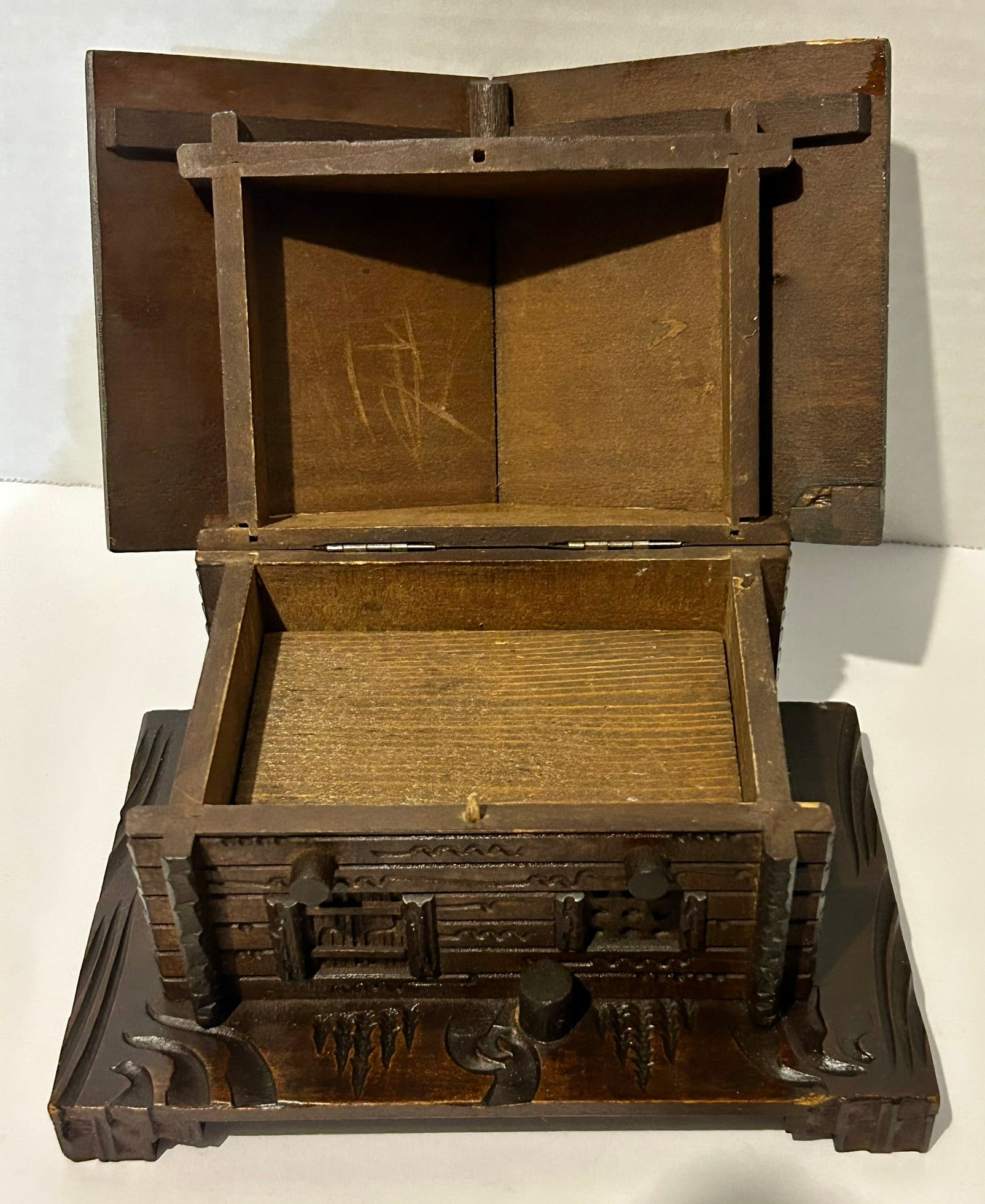BLACK FOREST WOOD CABIN ANTIQUE MUSIC BOX 7" LONG X 5" TALL X 4 1/2" DEEP. CALL OR TEXT FOR MORE INFORMATION