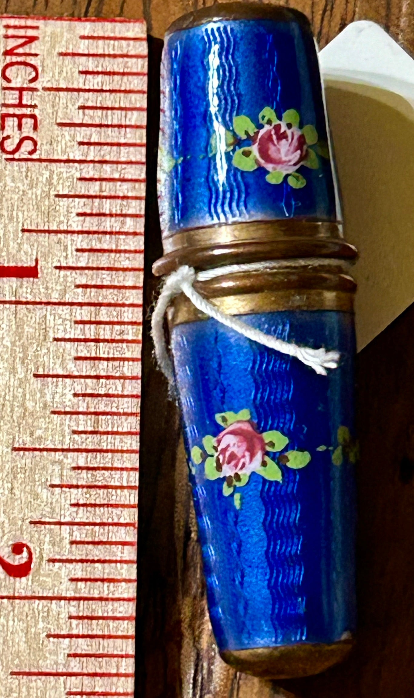 BLUE ENAMELED FLORAL THIMBLE AND THREAD ANTIQUE CASE. CALL OR TEXT FOR MORE INFORMATION