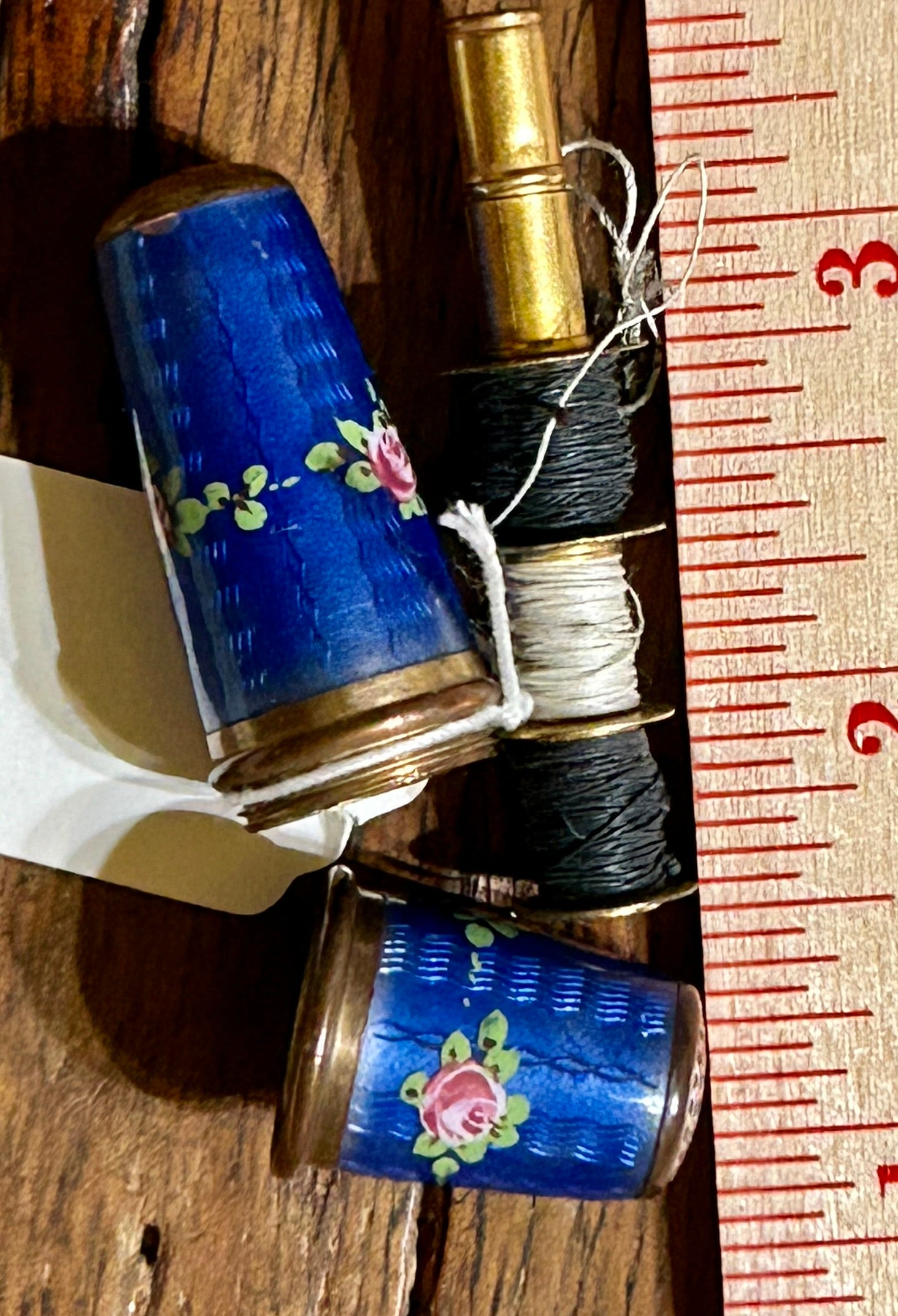 BLUE ENAMELED THIMBLE AND THREAD ANTIQUE CASE