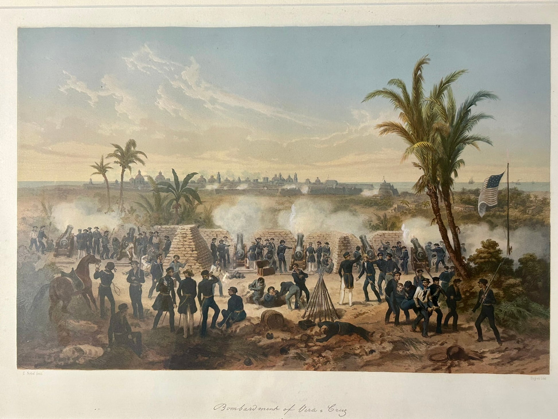 BOMBARDMENT OF VERA CRUZ MEXICAN AMERICAN WAR BATTLE PRINT 1851 HAND COLORED 14" X 19" PRINT ONLY SIZE. CALL OR TEXT FOR MORE INFORMATION