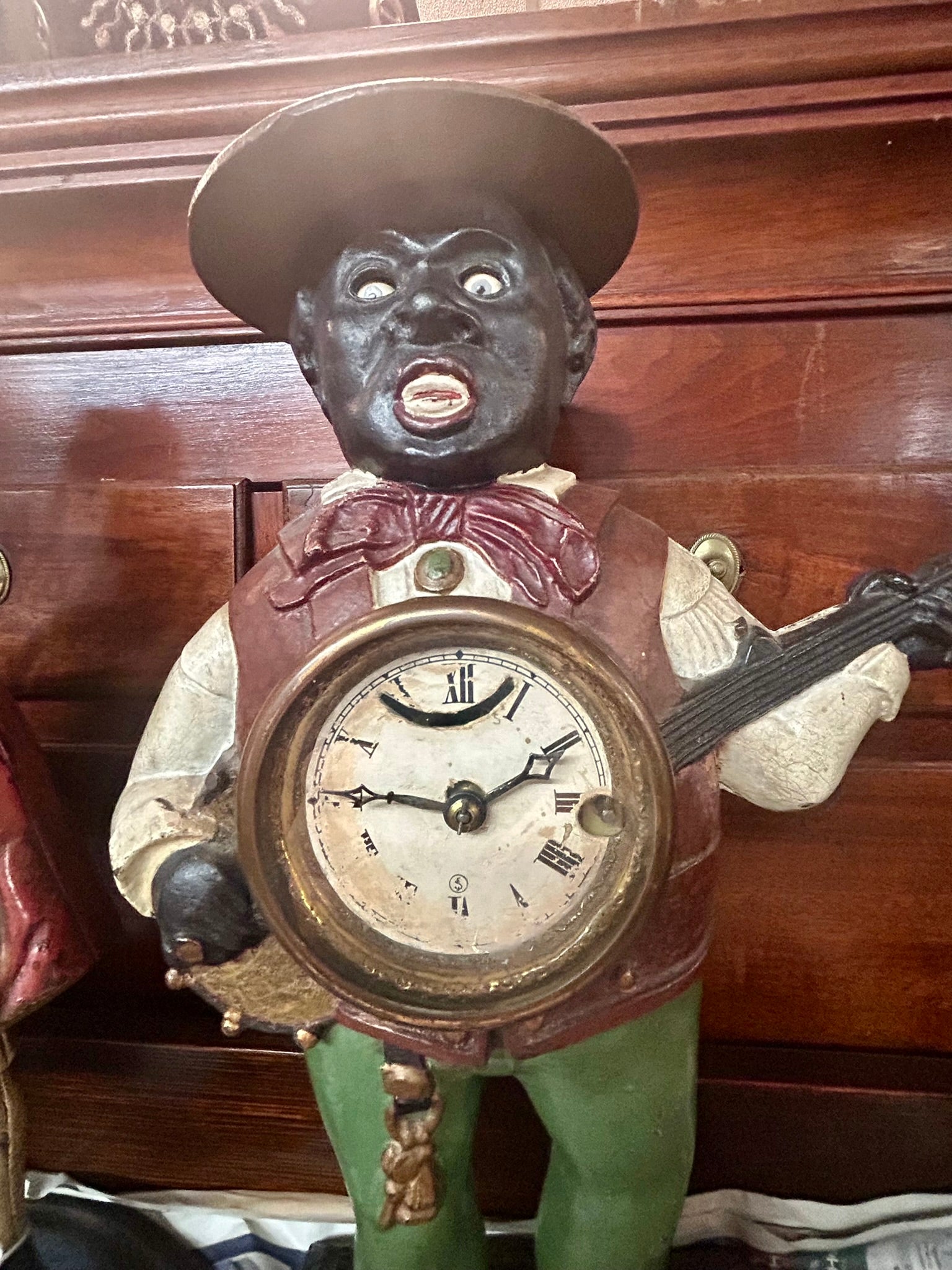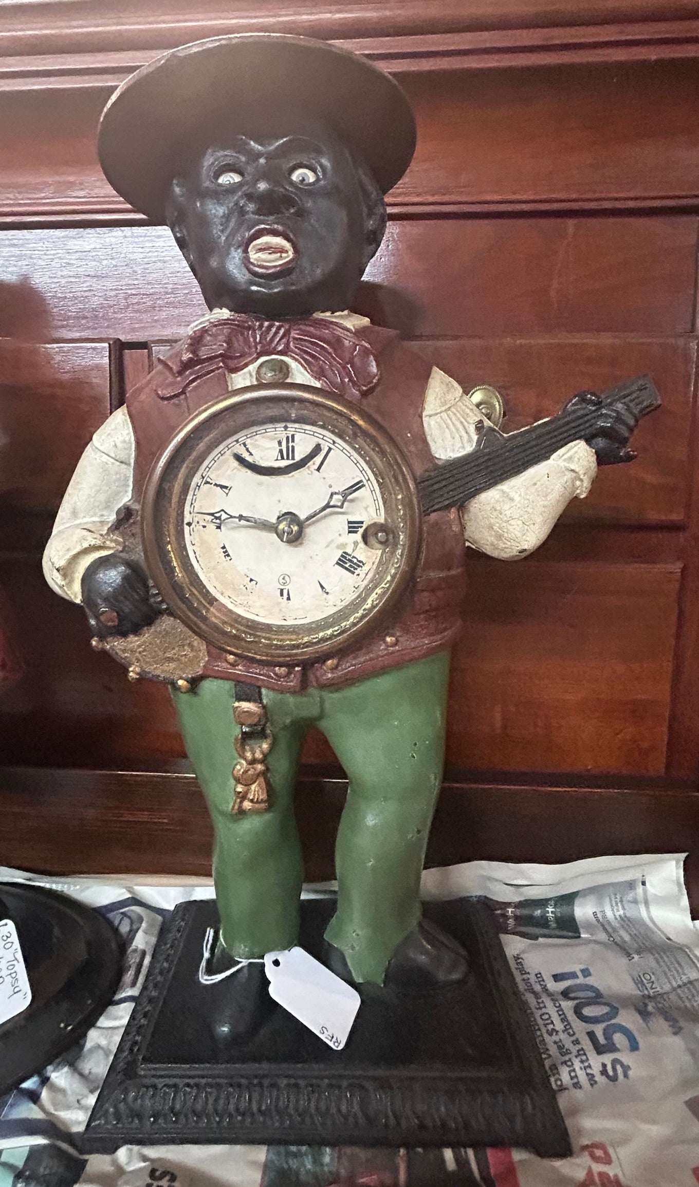 BRADLEY AND HUBBARD SAMBO FIGURAL ANTIQUE MOVING EYE CLOCK 15" TALL. CALL, TEXT, OR E-MAIL FOR MORE INFORMATION