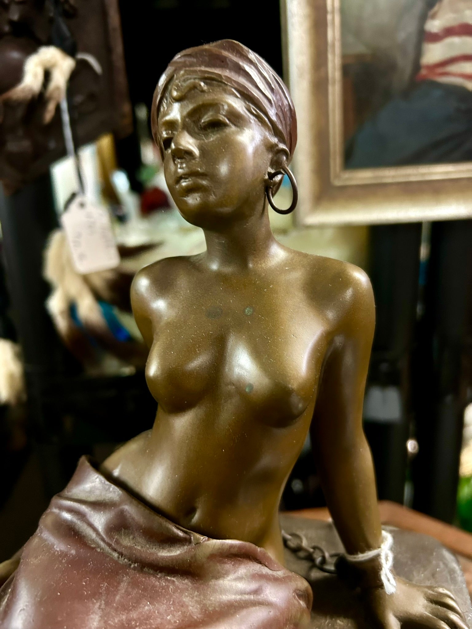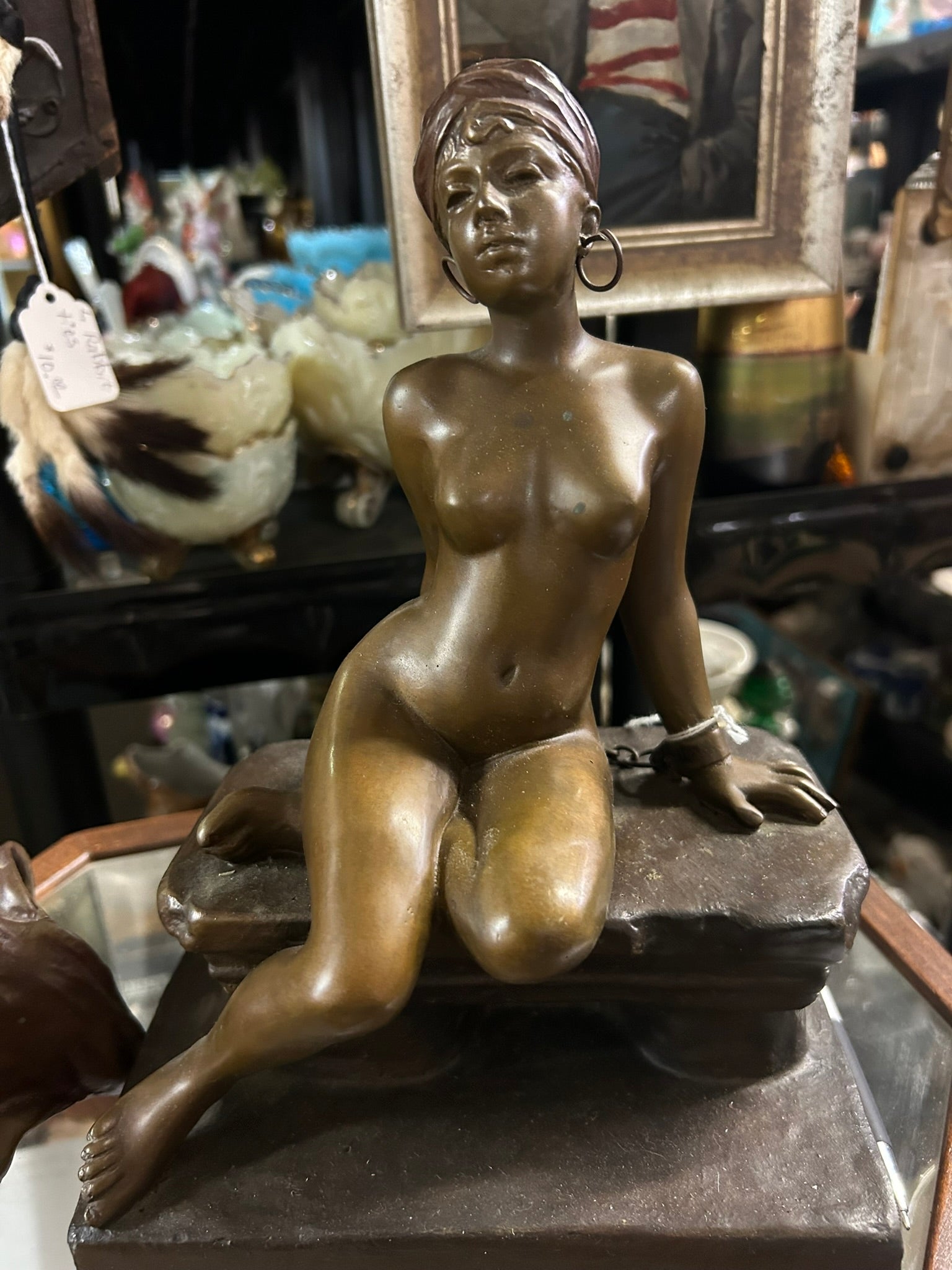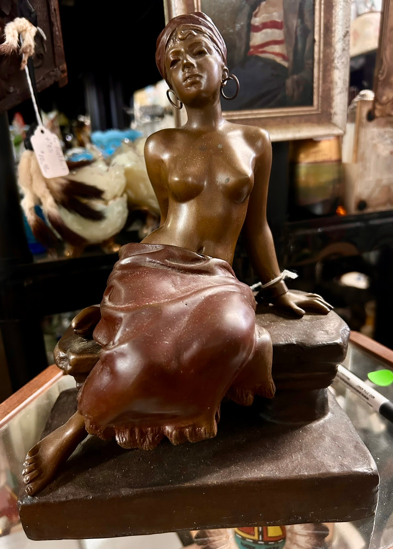BRONZE ANTIQUE FIGURAL FEMALE NUDE SIGNED VILLANIS WITH REMOVEABLE SKIRT 10" TALL X 7" WIDE BASE. CALL OR TEXT FOR MORE INFORMATION