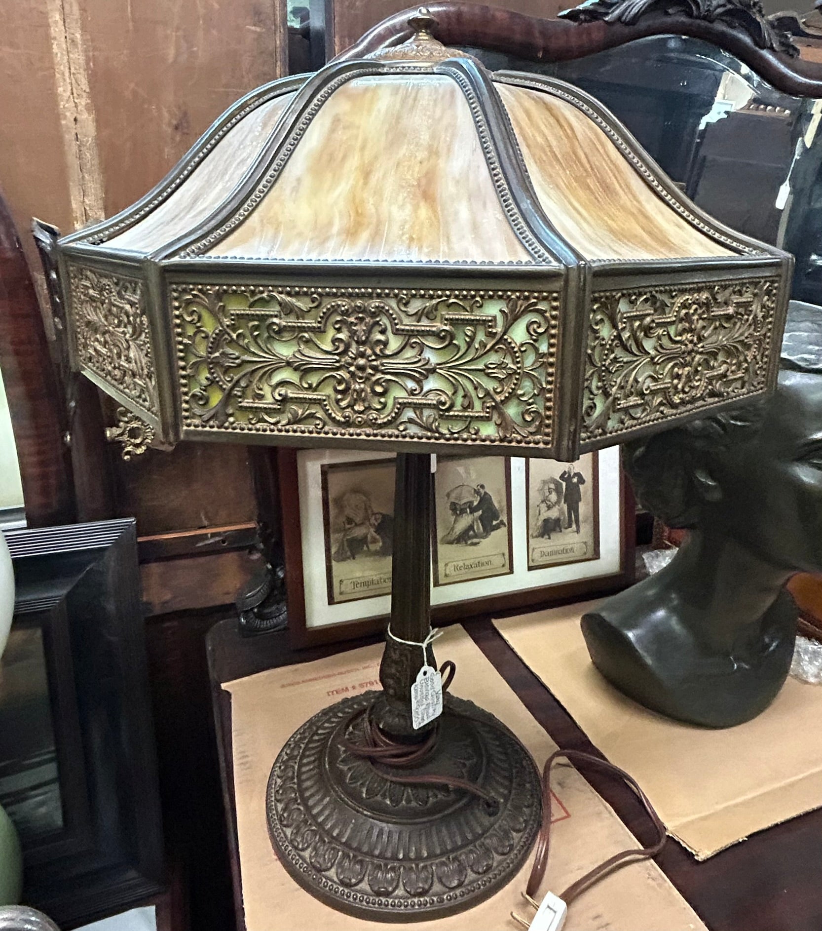 BRONZE BASE ANTIQUE SLAG GLASS QUALITY TABLE LAMP