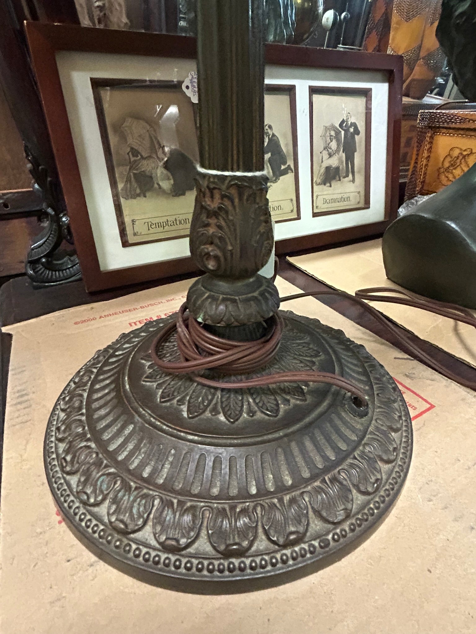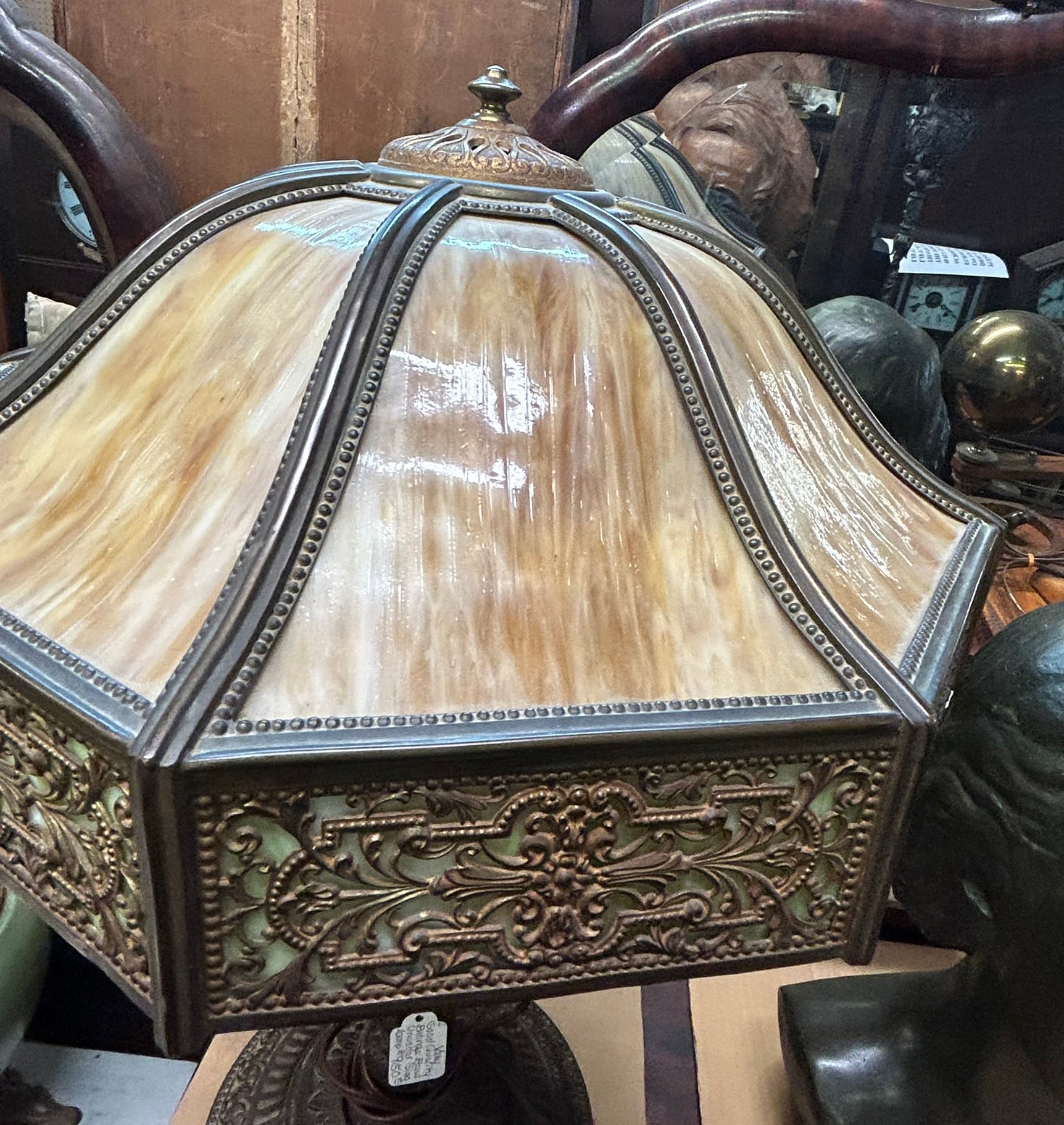 BRONZE BASE ANTIQUE QUALITY SLAG GLASS TABLE LAMP WITH 15" DIAMETER SHADE. CALL, TEXT, OR E-MAIL FOR MORE INFORMATION