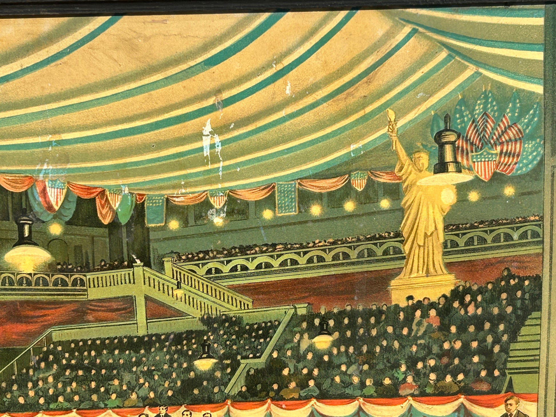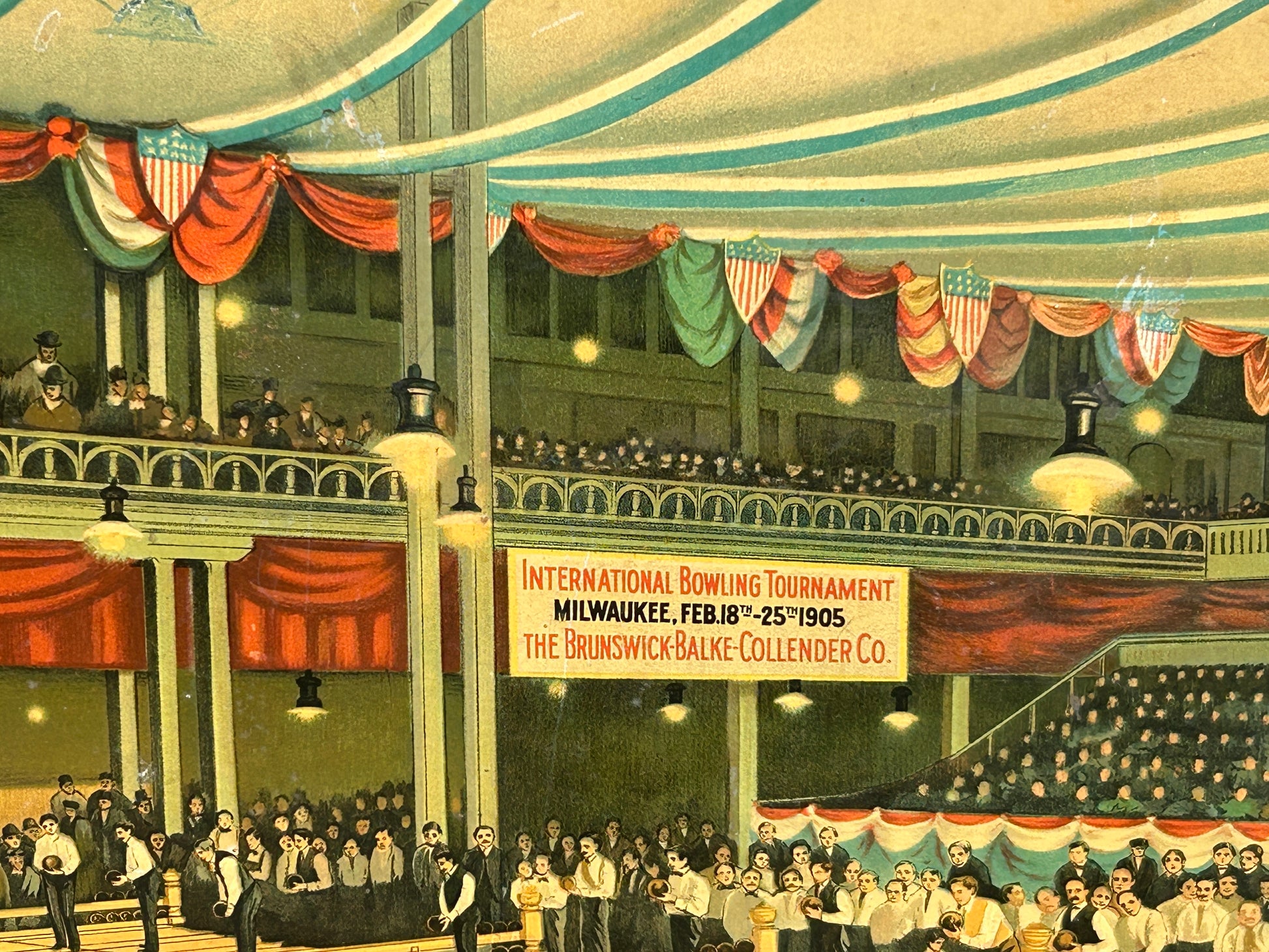 BRUNSWICK BALKE COLLENDER CO. 1905 LARGE BOWLING SIGN 30" TALL X 40" OVERALL AND ADVERTISEMENT WITHOUT FRAME 27" TALL X 36" WIDE, HAS DAMAGES AS SHOWN IN PHOTOS. PRICES DO NOT INCLUDE SHIPPING SO CALL OR TEXT TO FIND SHIPPING COST TO YOUR AREA.