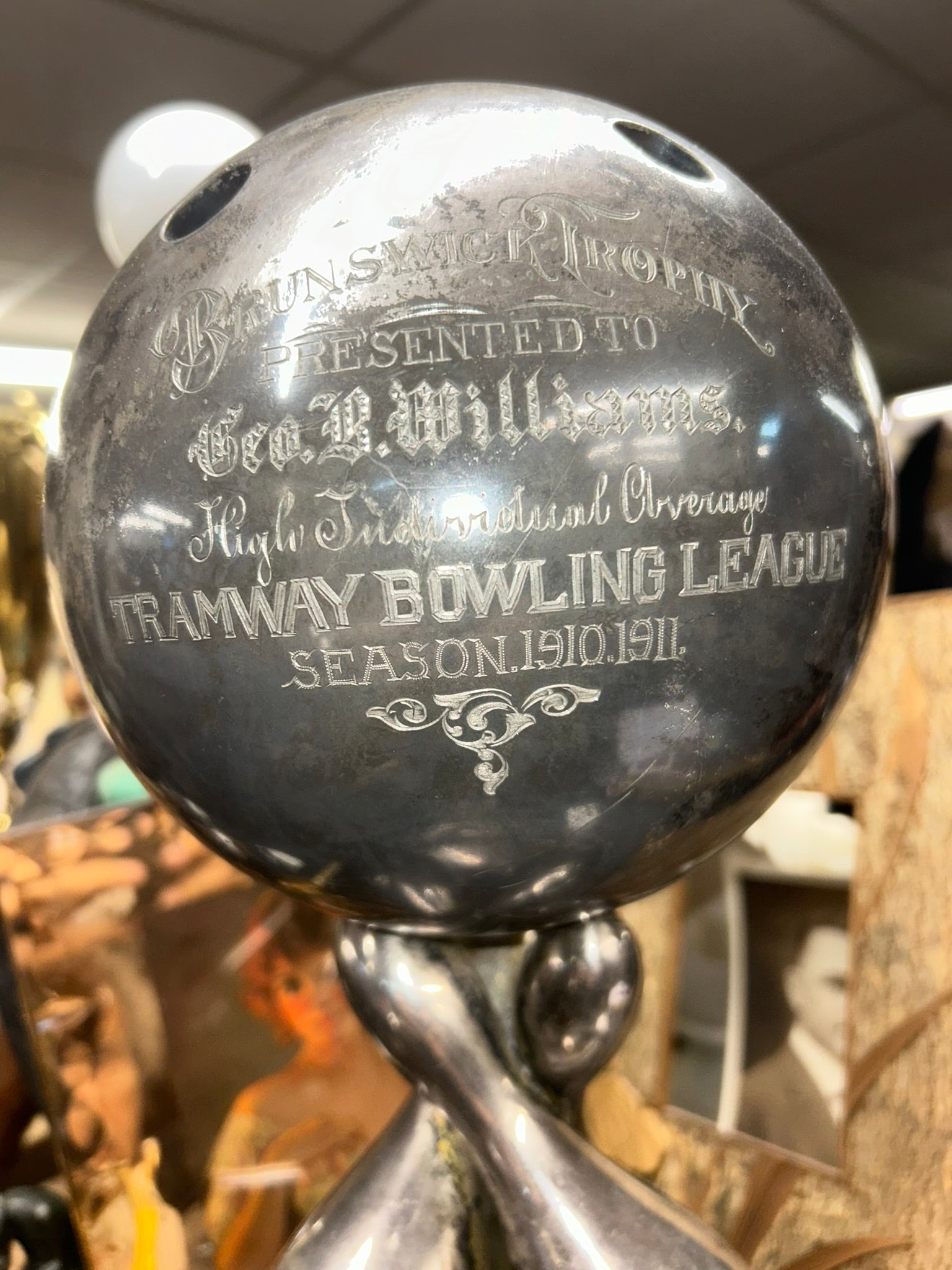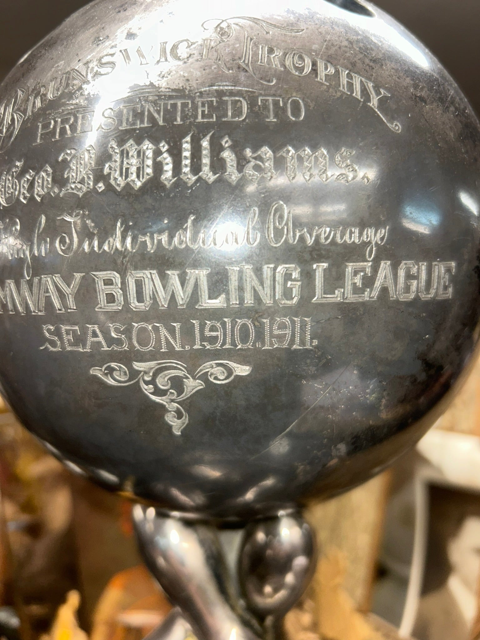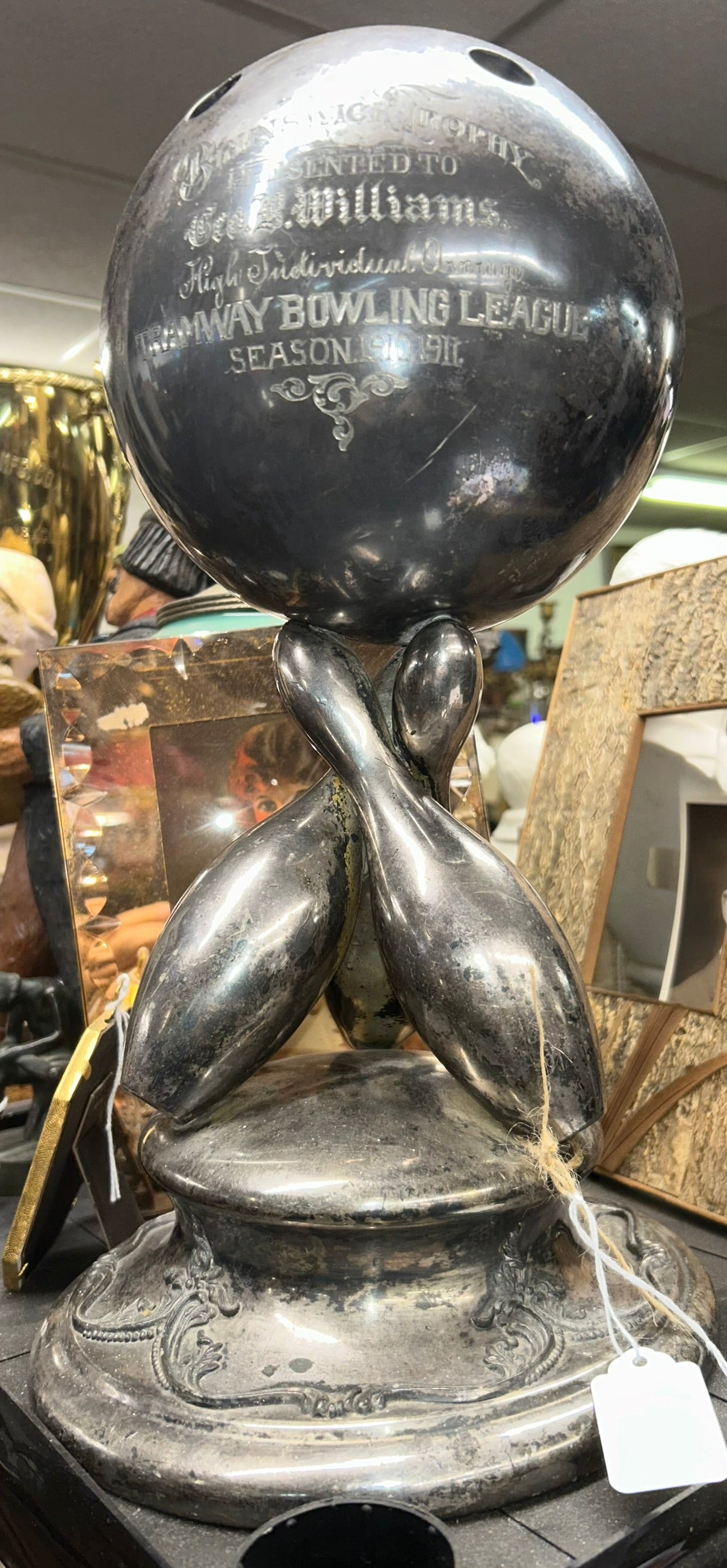 FIGURAL BOWLING BALL AND PINS TROPHY FROM BRUNSWICK 1910-1911 SILVERPLATE. CALL, TEXT, OR E-MAIL FOR MORE INFORMATION
