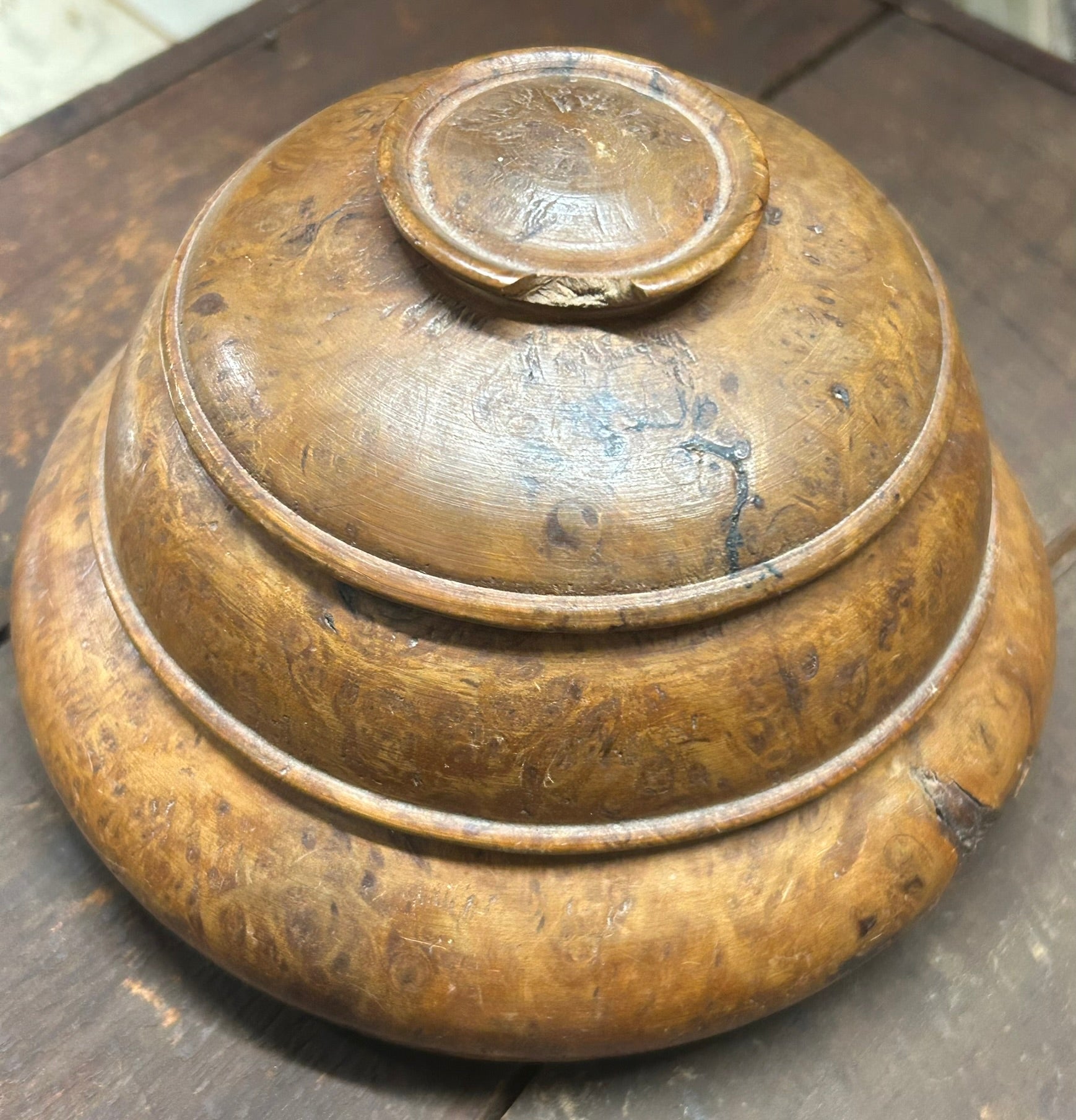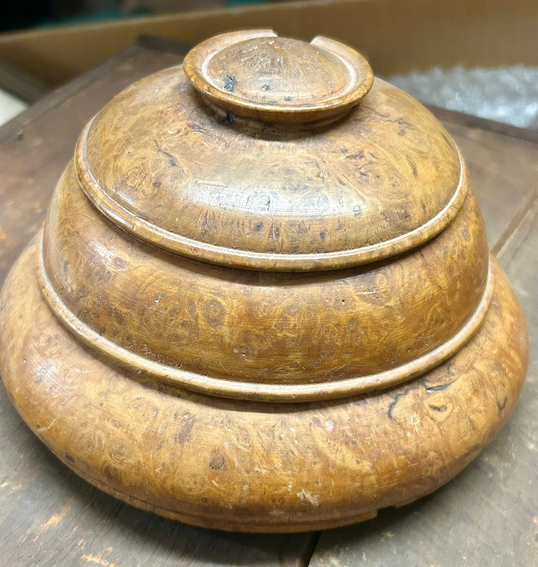 BURL WOOD DOUBLE ROUND ANTIQUE BOX 6" X 4". CALL OR TEXT FOR MORE INFORMATION