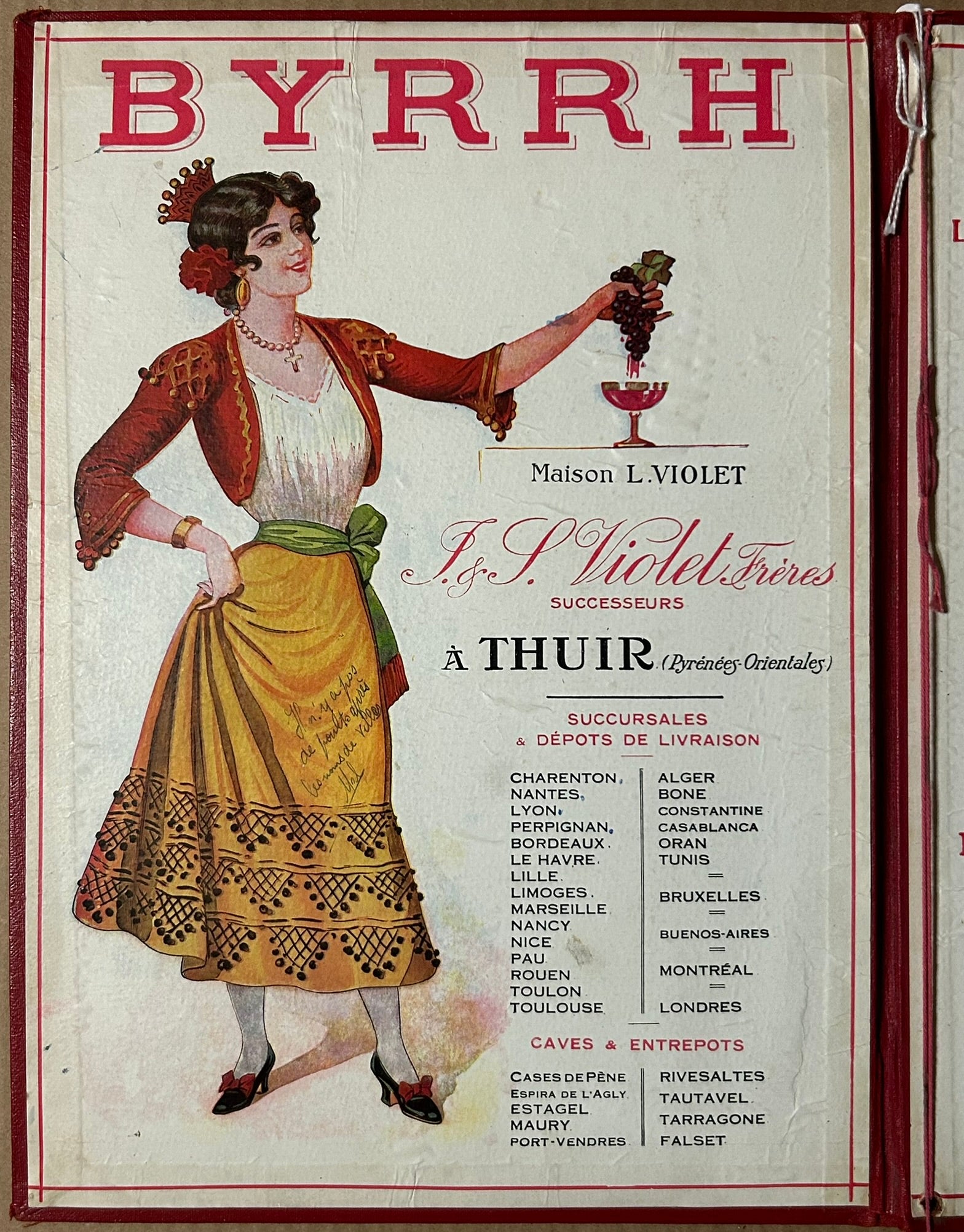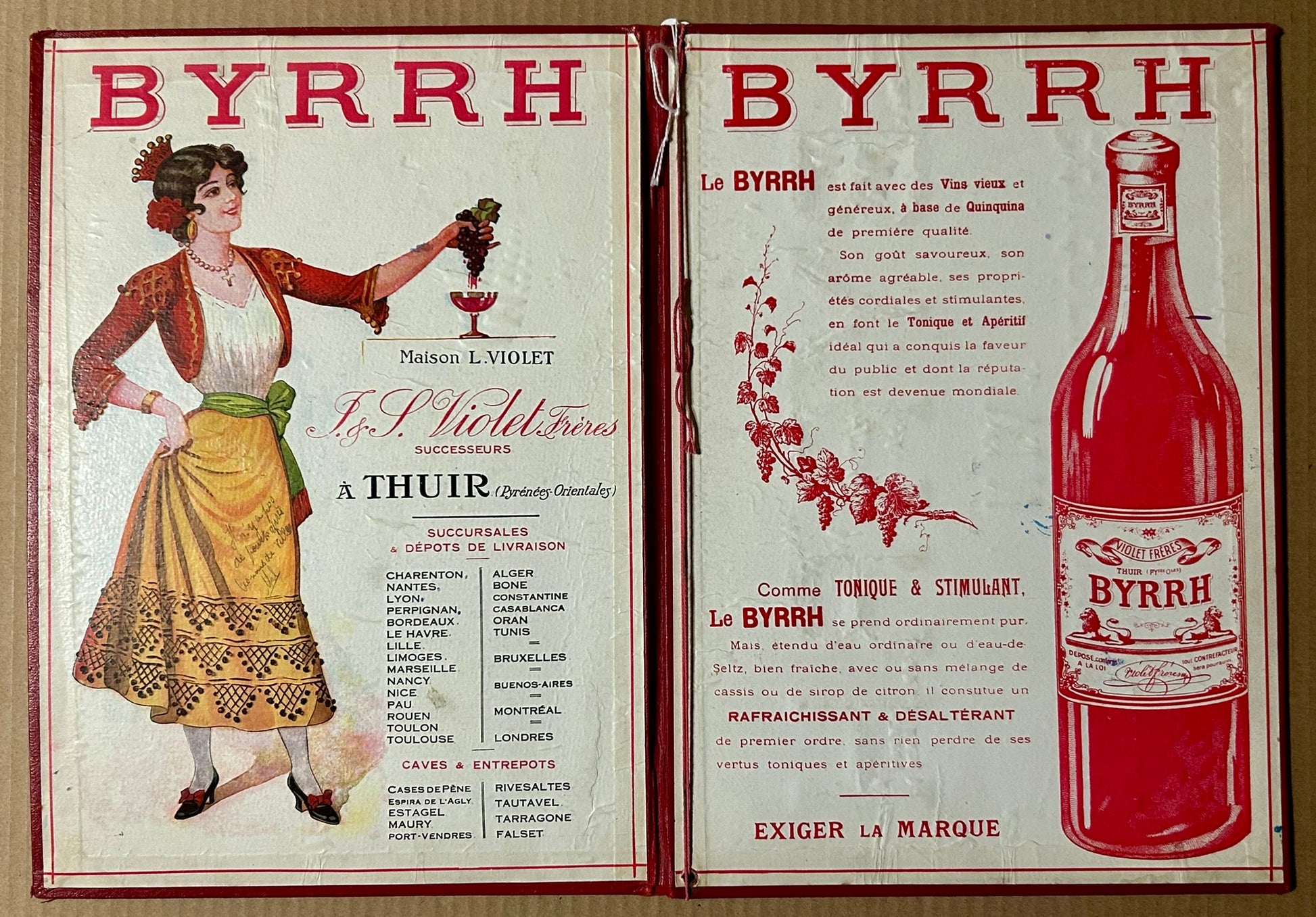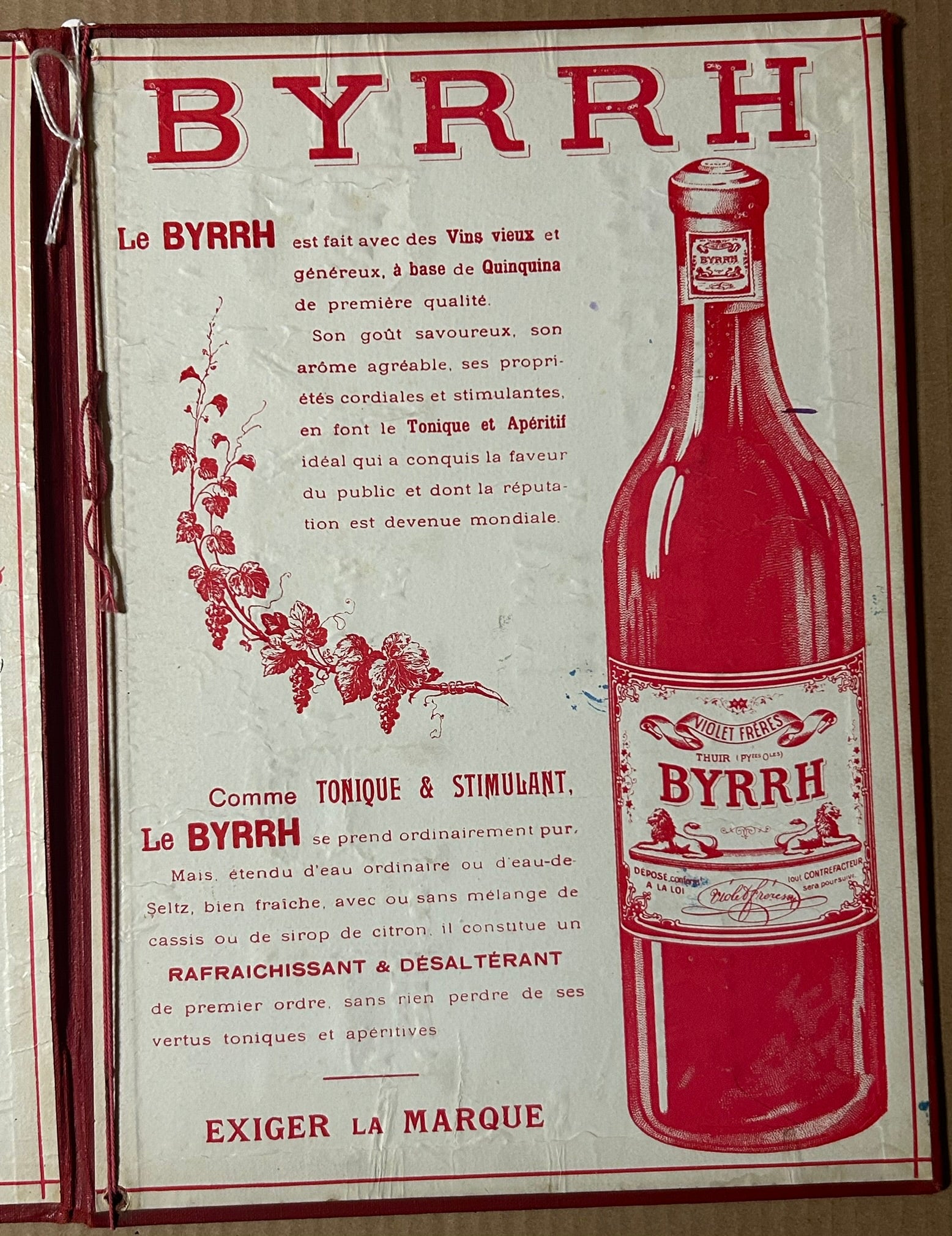 BYRRH ANTIQUE ADVERTISING WINE LIST FOLDER WITH HARD COVERS 13" X 91/2" CLOSED. CALL OR TEXT FOR MORE INFORMATION