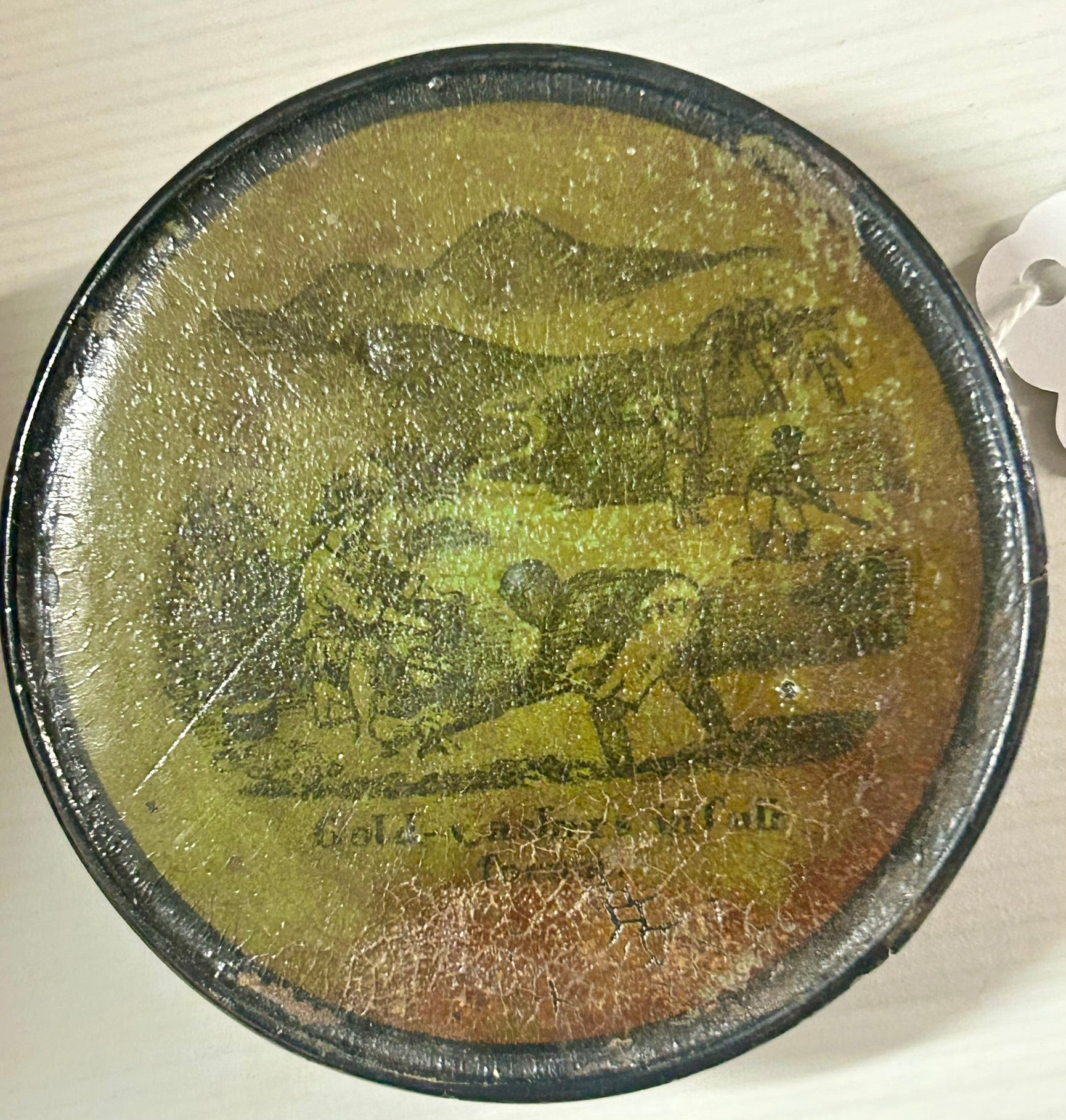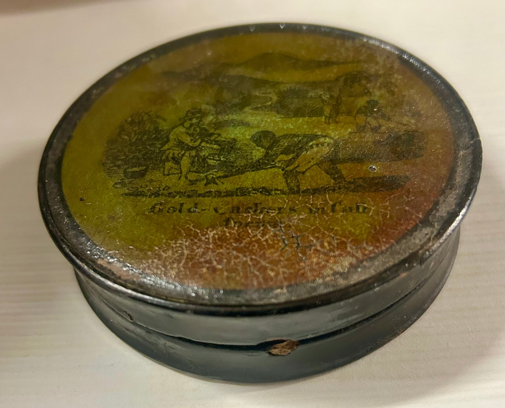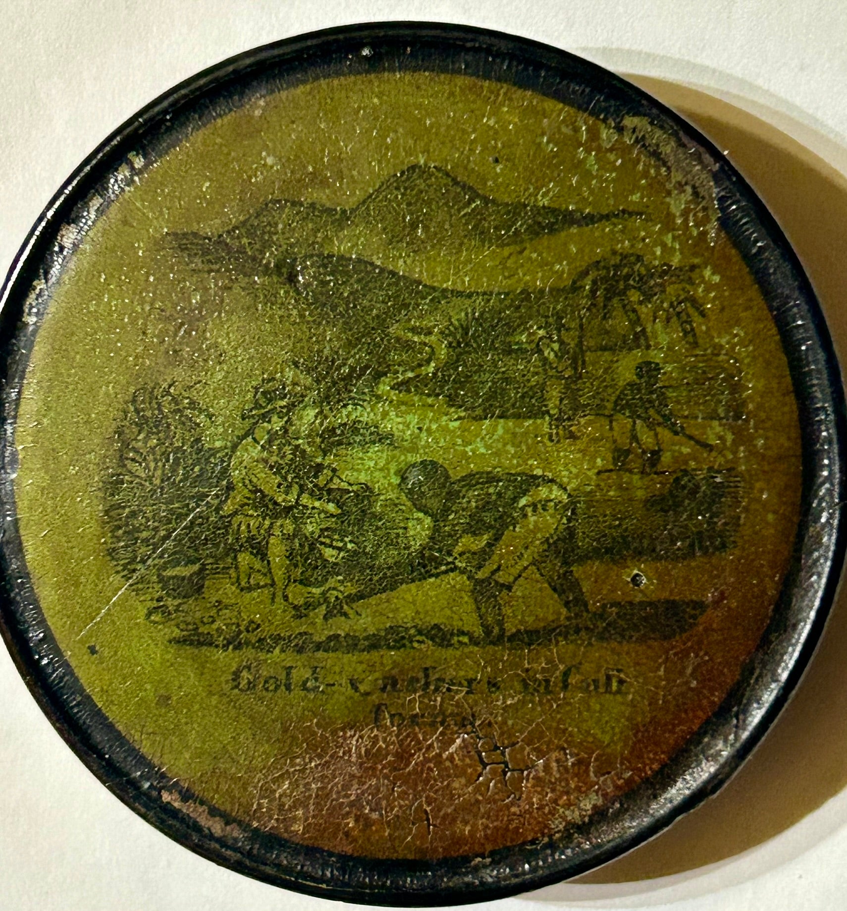 CALIFORNIA GOLD FIELDS PAPER MACHE ANTIQUE SNUFF BOX WITH MINING SCENE "OF GOLD WASHERS IN CALIFORNIA" 3 1/4" DIAMETER. VERY RARE ITEM! CALL OR TEXT FOR MORE INFORMATION