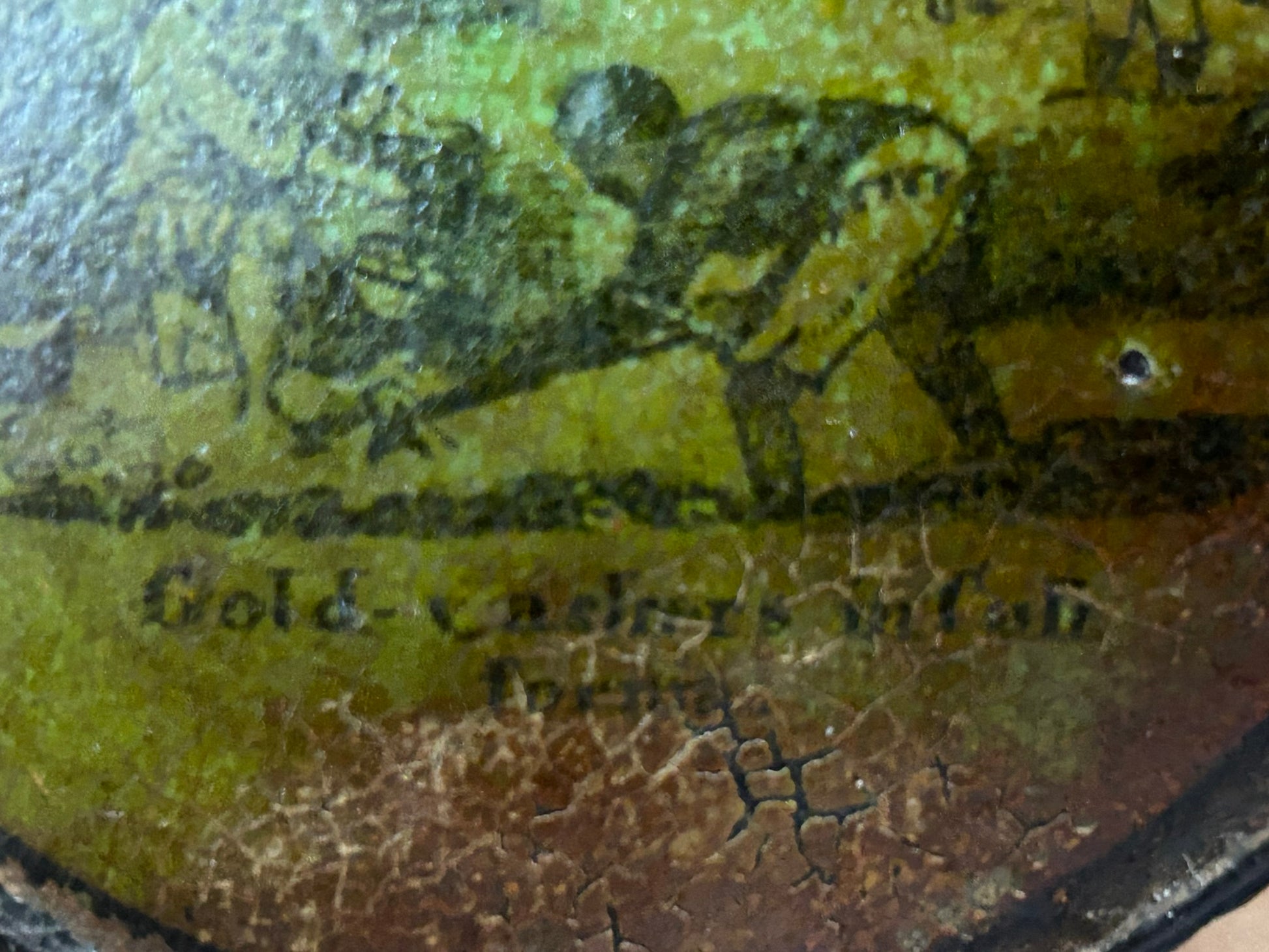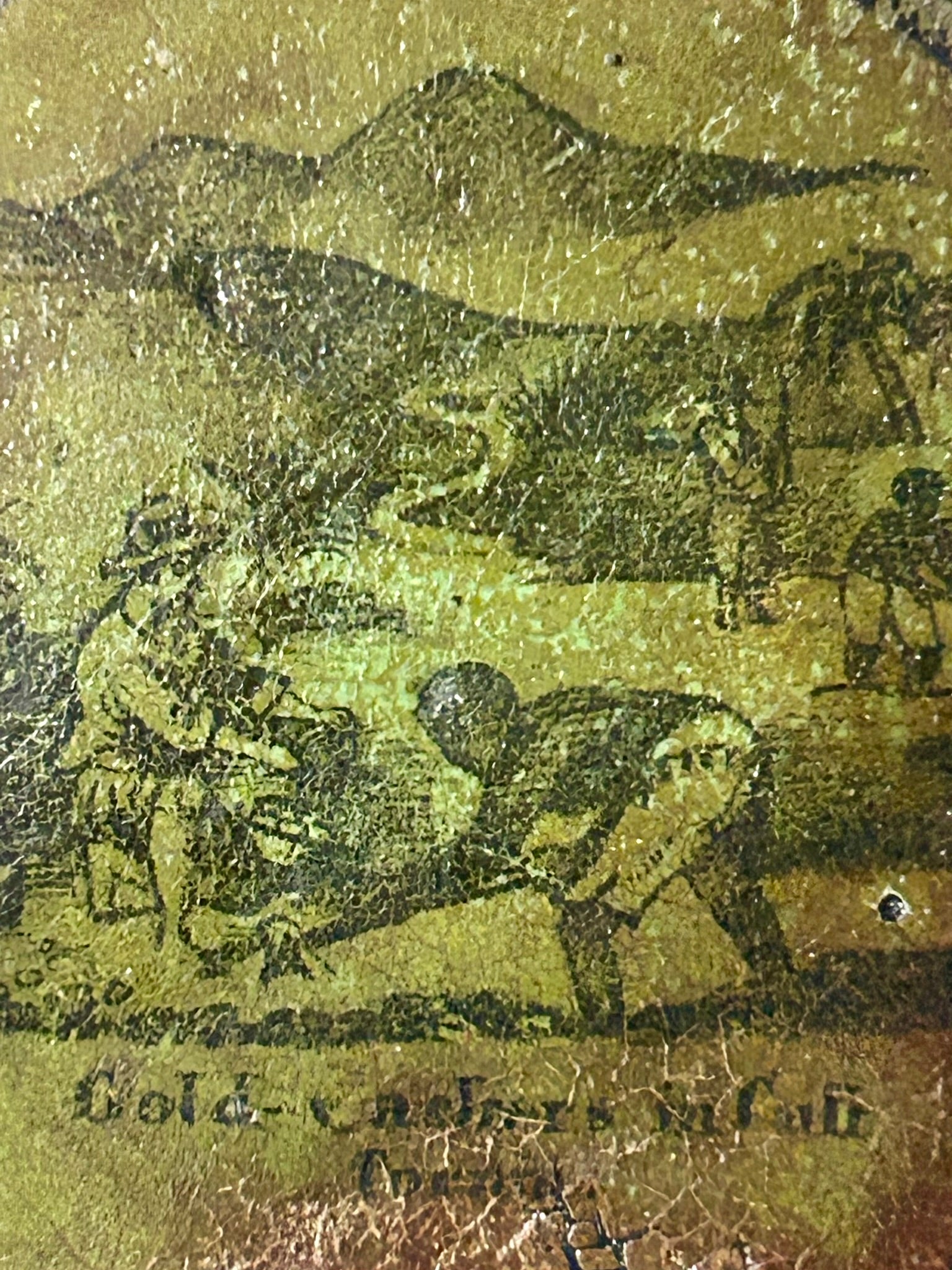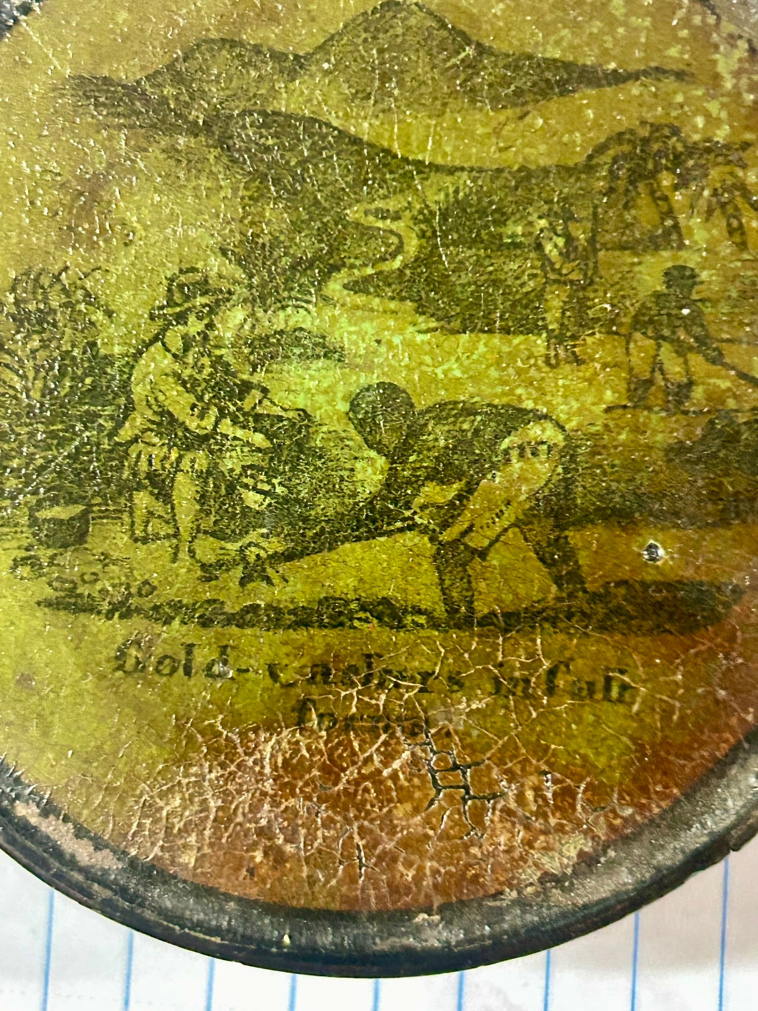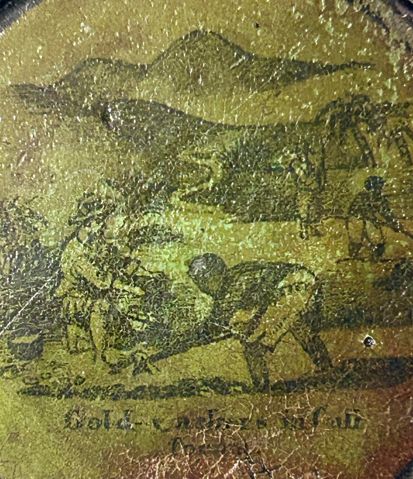 CALIFORNIA GOLD FIELDS PAPER MACHE ANTIQUE SNUFF BOX WITH MINING SCENE "OF GOLD WASHERS IN CALIFORNIA" 3 1/4" DIAMETER. VERY RARE ITEM! CALL OR TEXT FOR MORE INFORMATION