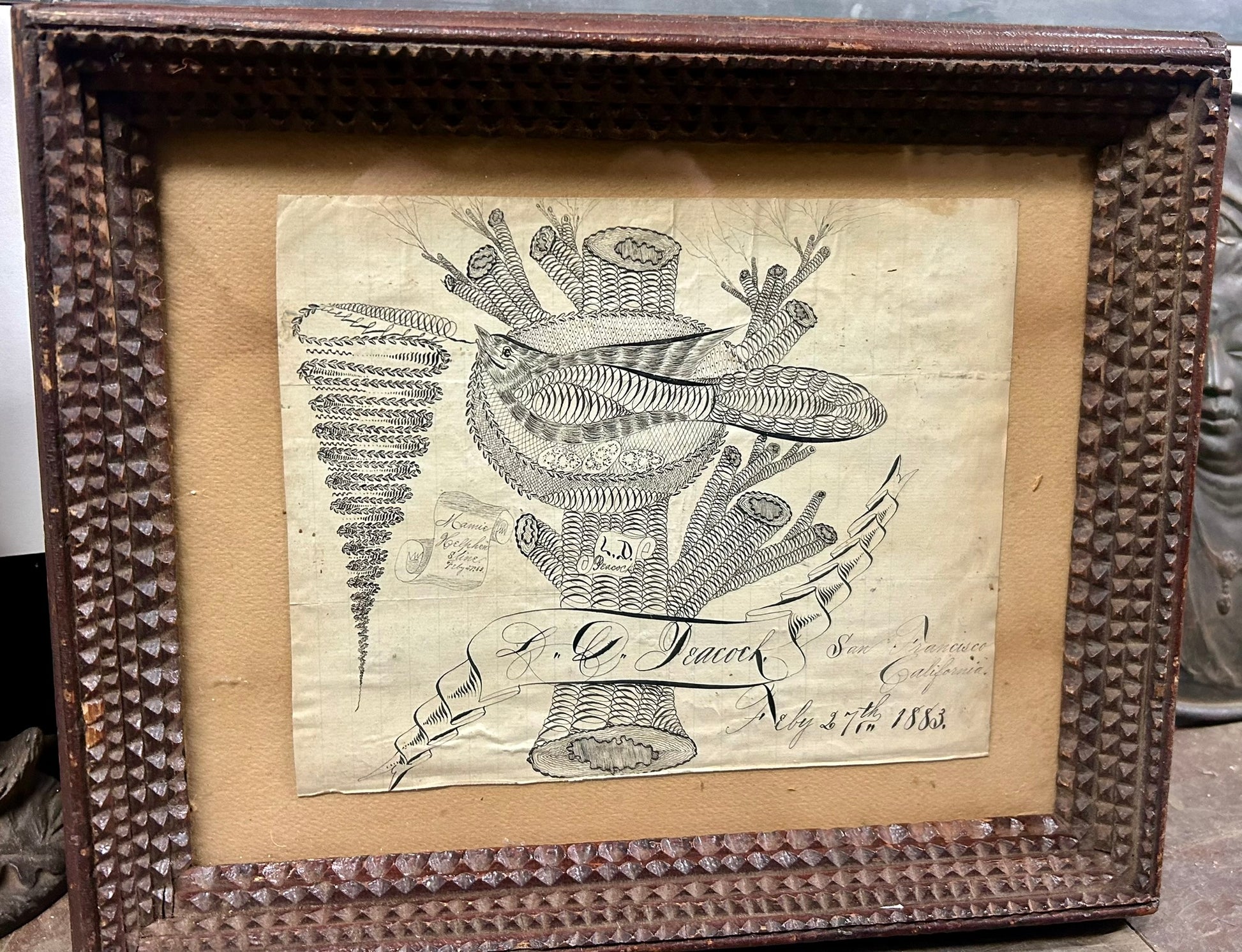 CALLIGRAPHY ANTIQUE BIRD IN NEST 1883 SAN FRANCISCO PEN AND INK DRAWING IN TRAMP ART WOOD FRAME 8" X 9 1/2" IMAGE ONLY AND INCLUDING FRAME 12" X 14". CALL OR TEXT FOR MORE INFORMATION