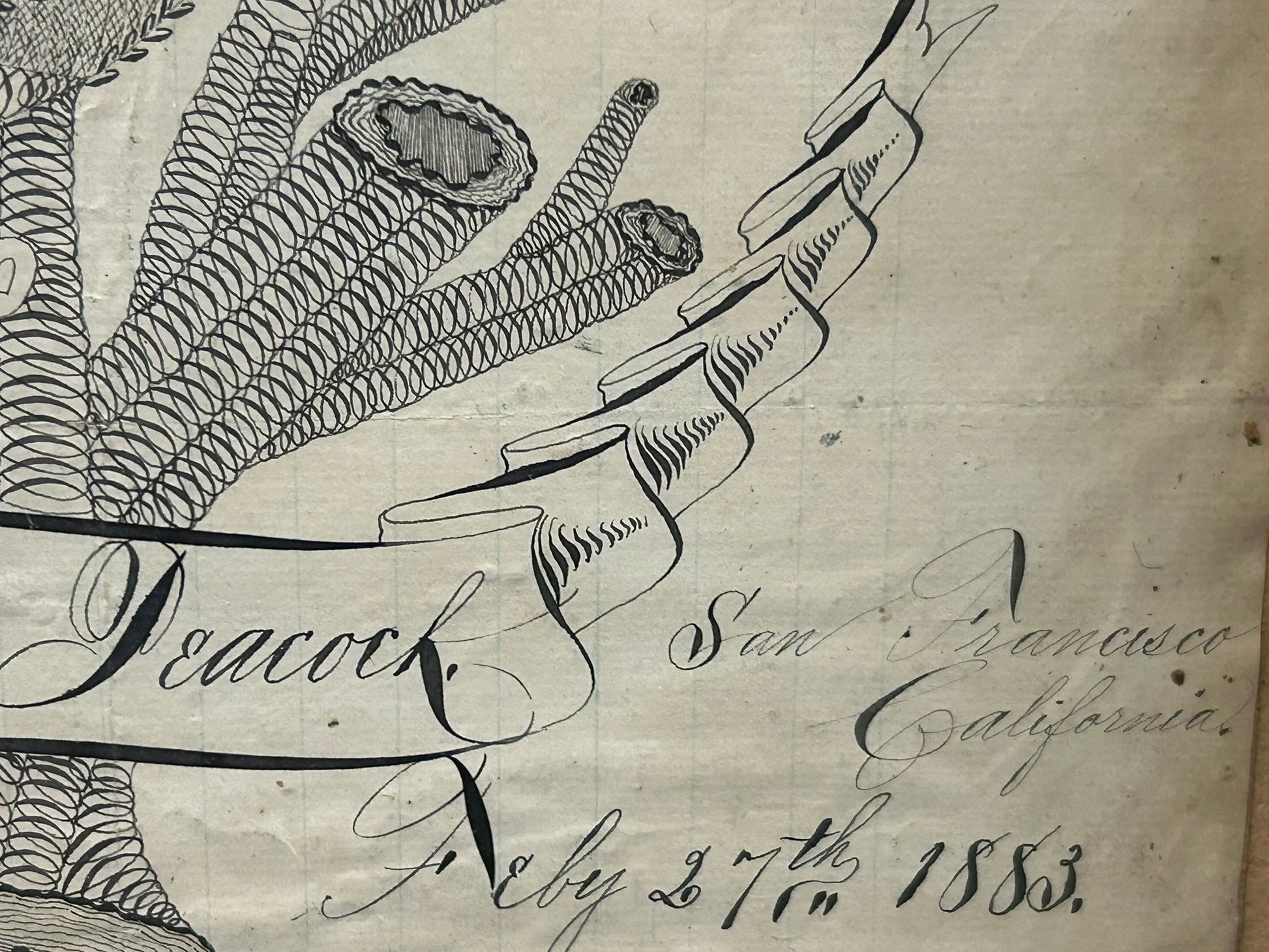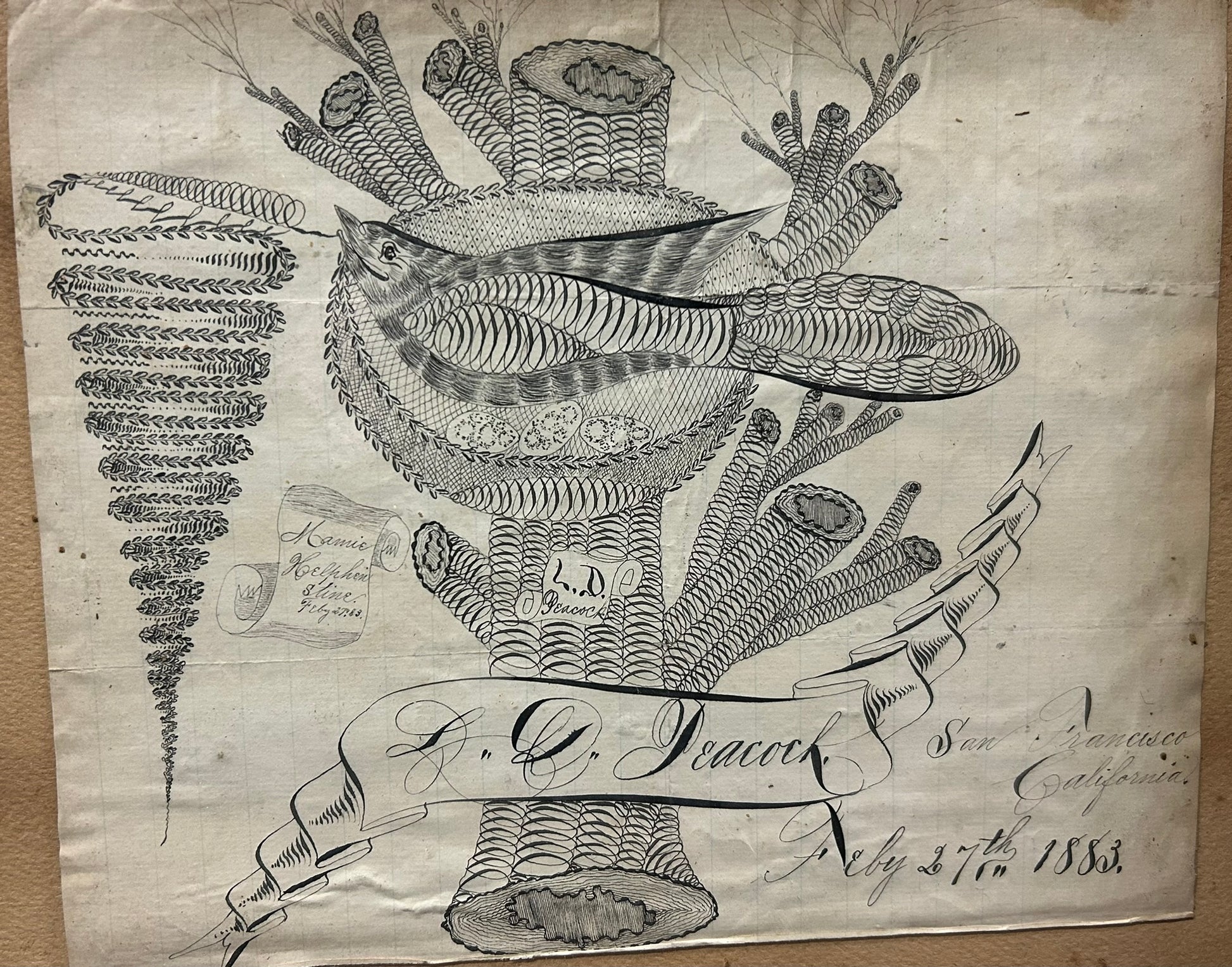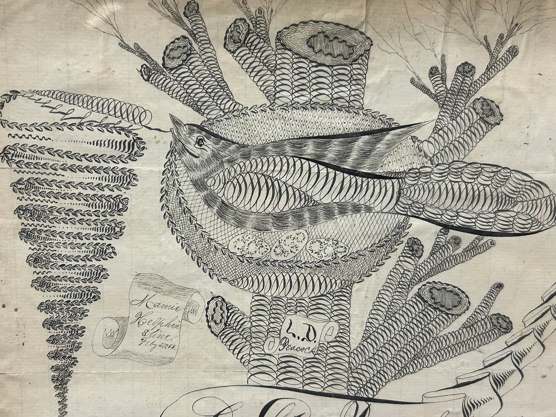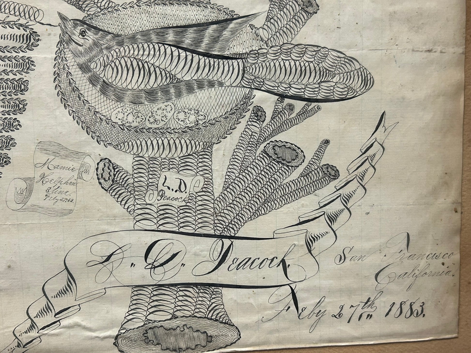 CALLIGRAPHY ANTIQUE BIRD IN NEST SAN FRANCISCO 1883 PEN & INK DRAWING