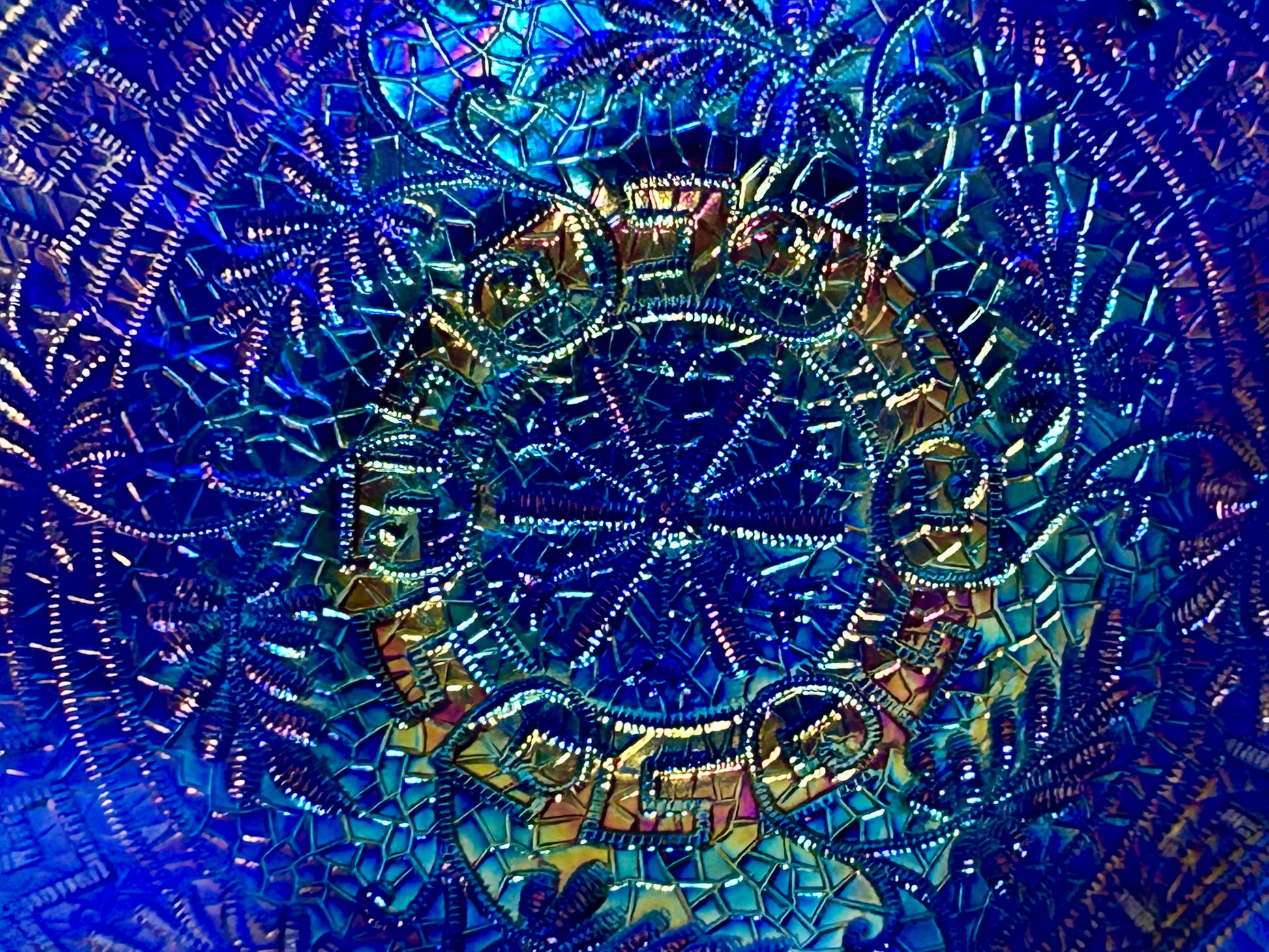 CARNIVAL GLASS BLUE EMBROIDERED MUMS NORTHWOOD 9" DIAMETER BOWL. CALL OR TEXT TRIPLE A ANTIQUES FOR A SHIPPING COST BEFORE YOU PURCHASE THIS ITEM