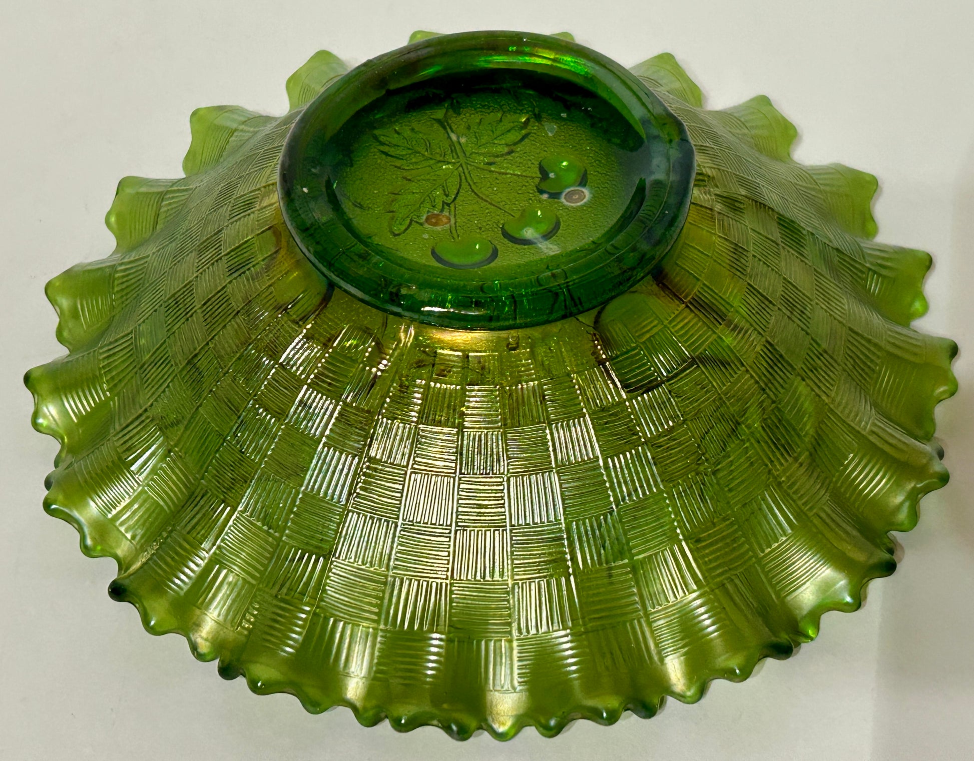 CARNIVAL GLASS THREE FRUITS STIPPLED THREE FRUITS GREEN PIE CRUST BOWL 8 1/4" DIAMETER MARKED NORTHWOOD. CALL OR TEXT TRIPLE A ANTIQUES FOR A SHIPPING COST BEFORE YOU PURCHASE ITEM