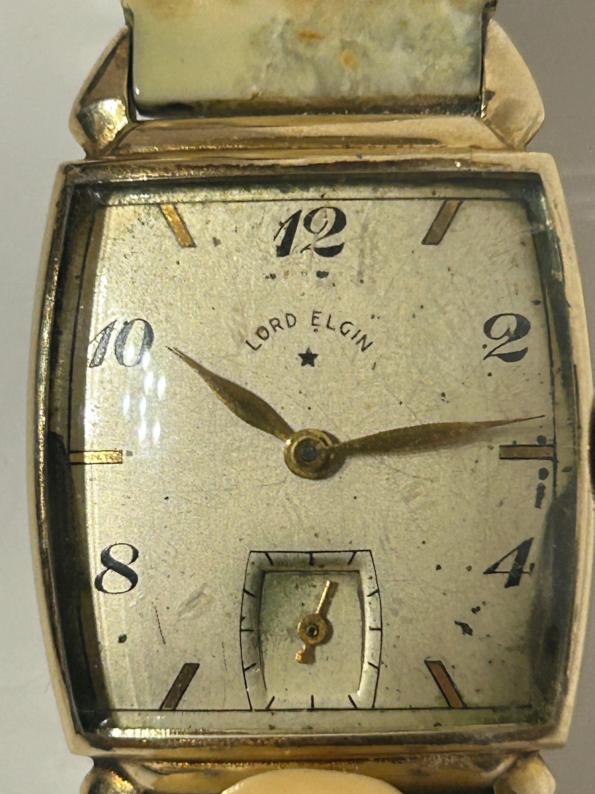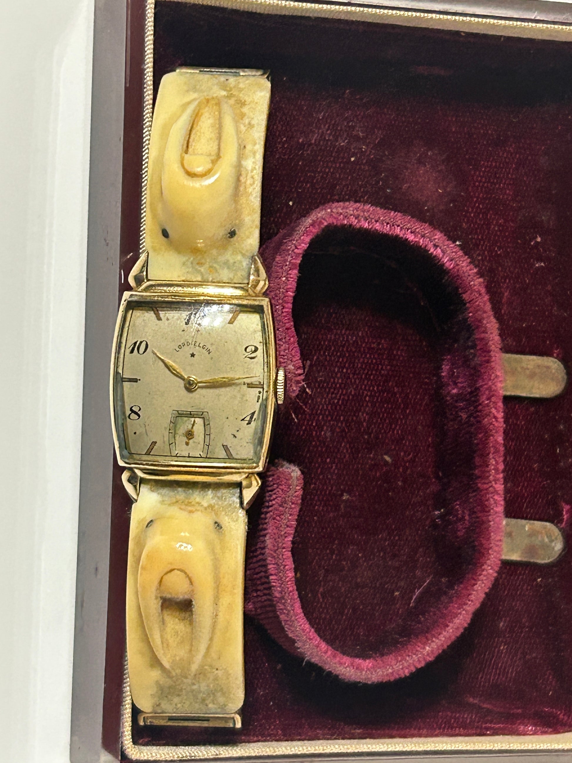 LORD ELGIN WRIST WATCH WITH CARVED WALRUS IVORY BAND- RUNS AND IN ORIGINAL BOX. CALL OR TEXT FOR MORE INFORMATION
