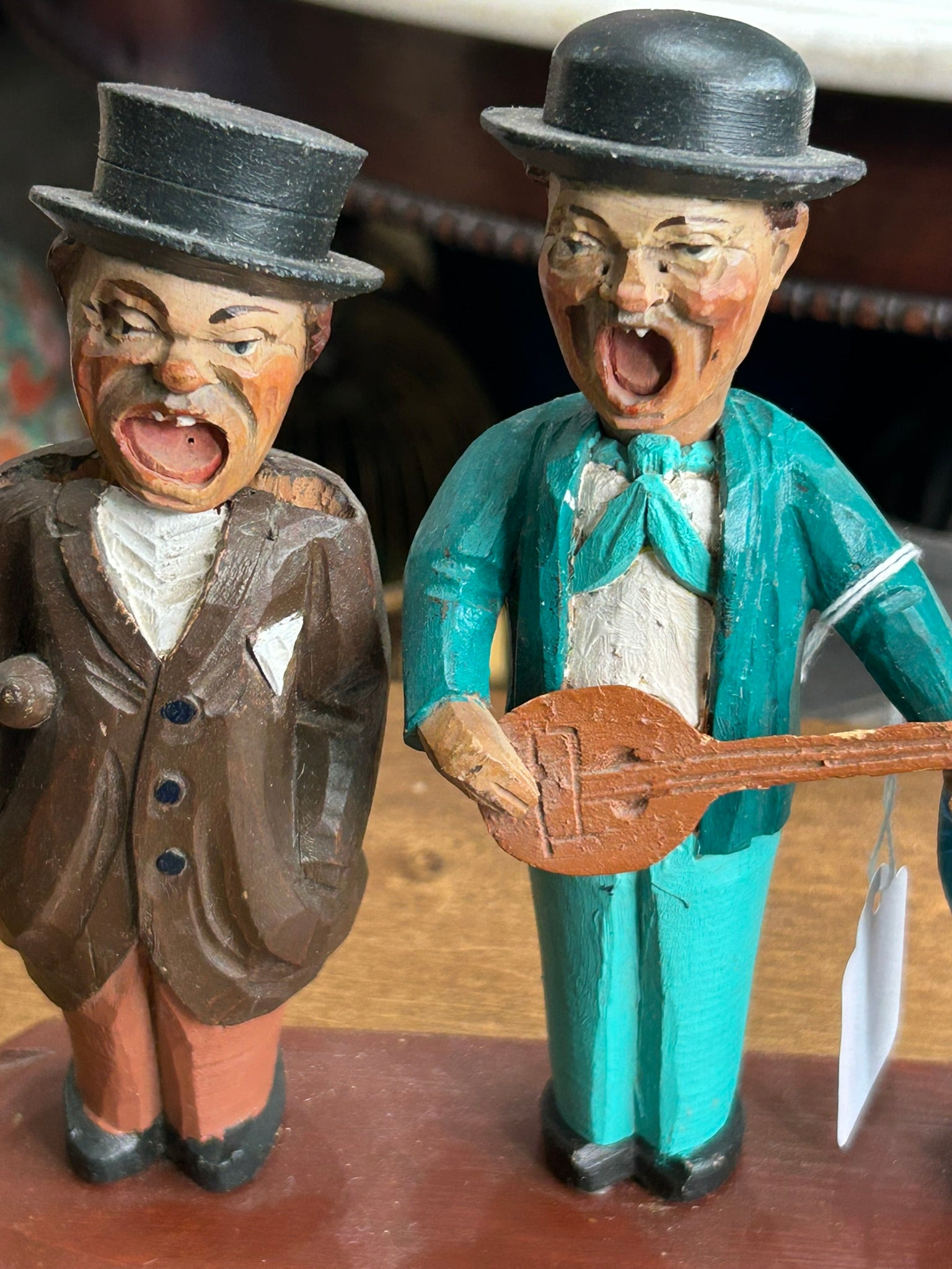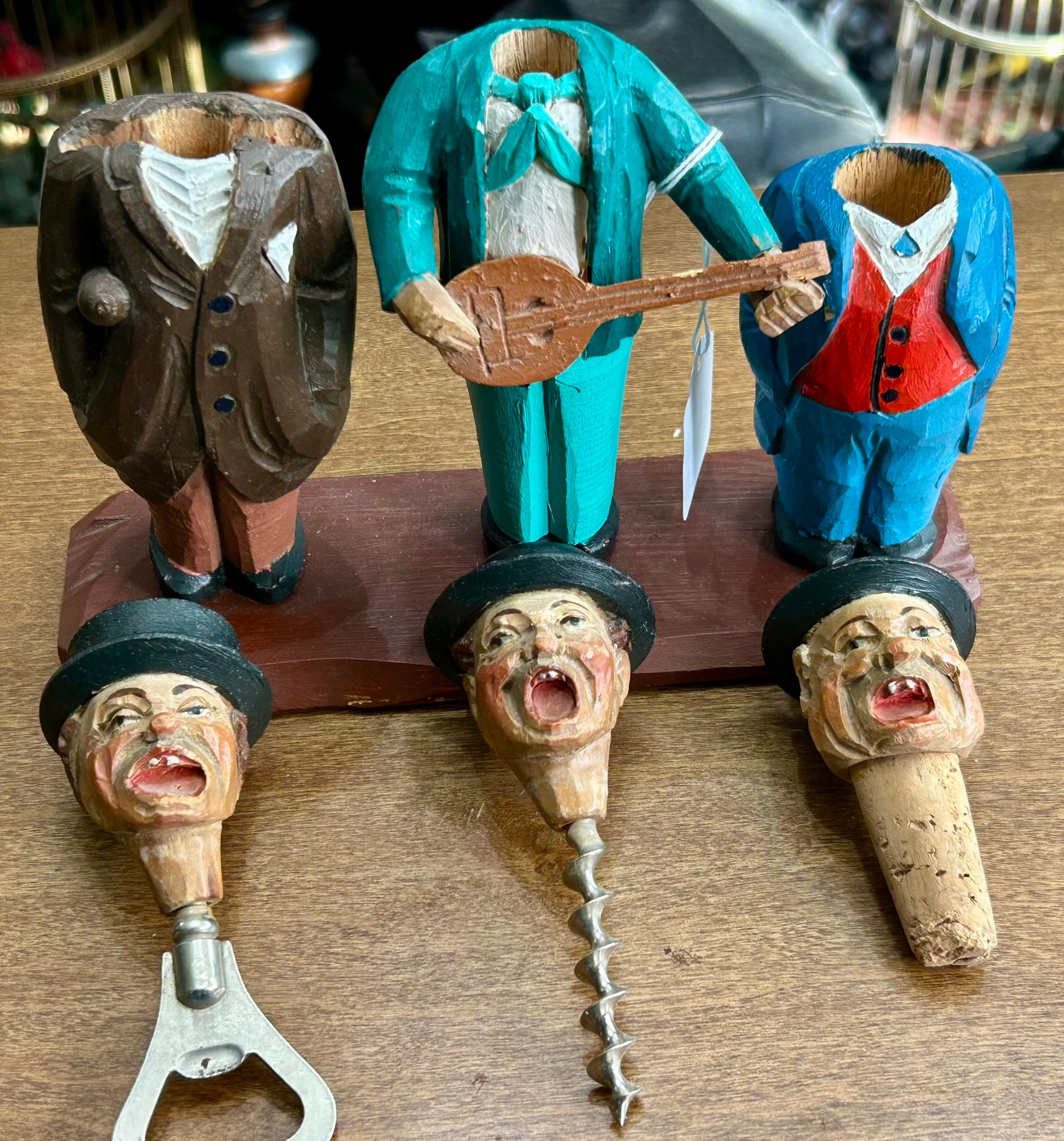 CARVED WOODEN FIGURES OF CORK SCREW, BOTTLE OPENER AND BOTTLE STOPPER