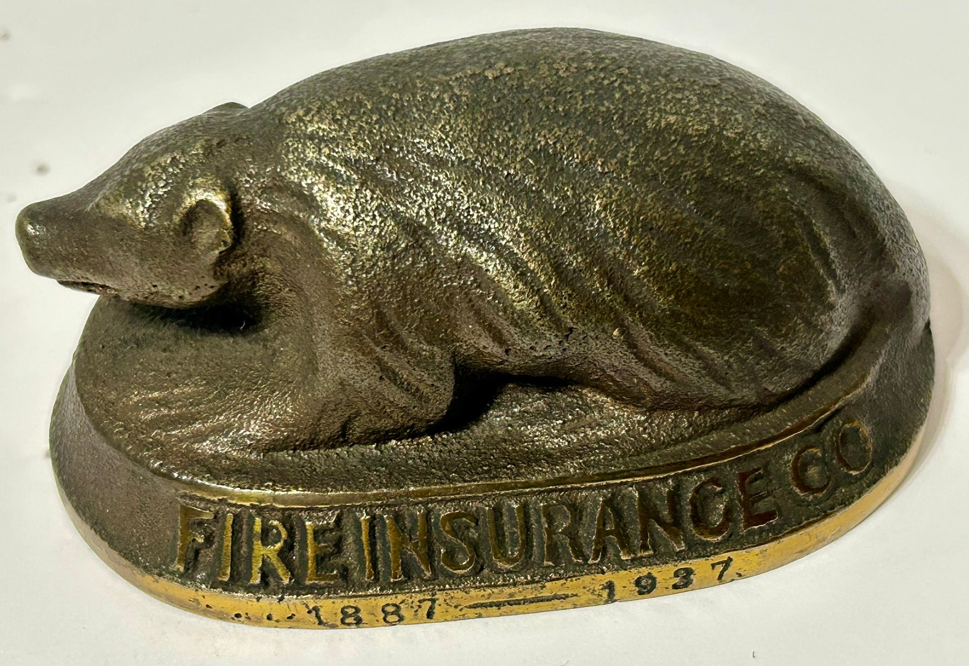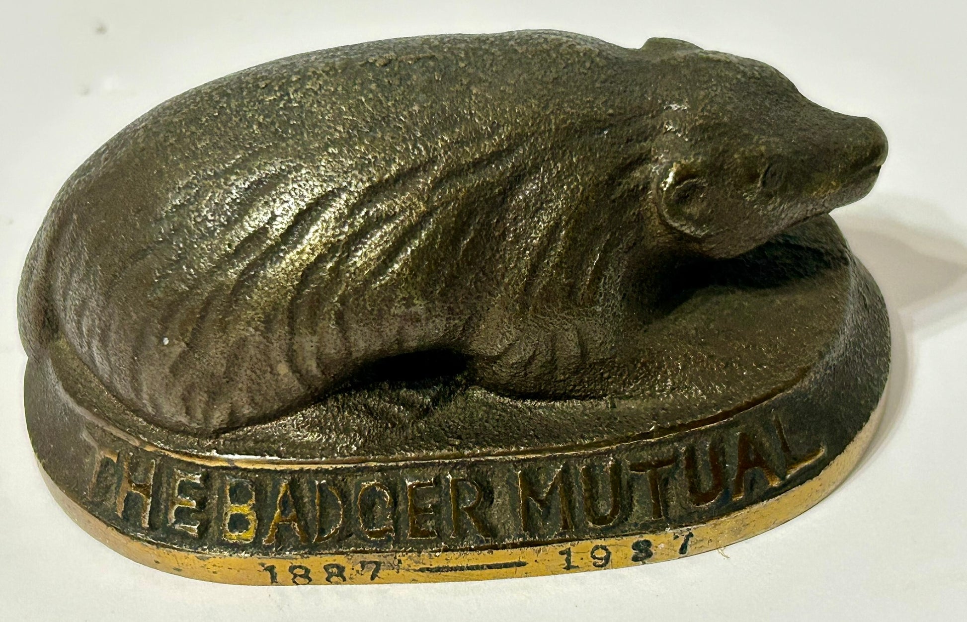 CAST IRON ANTIQUE FIGURAL BADGER ADVERTISING PAPERWEIGHT FOR BADGER MUTUAL FIRE INSURANCE CO. 1887-1937 3 3/4" TALL. CALL OR TEXT FOR MORE INFORMATION