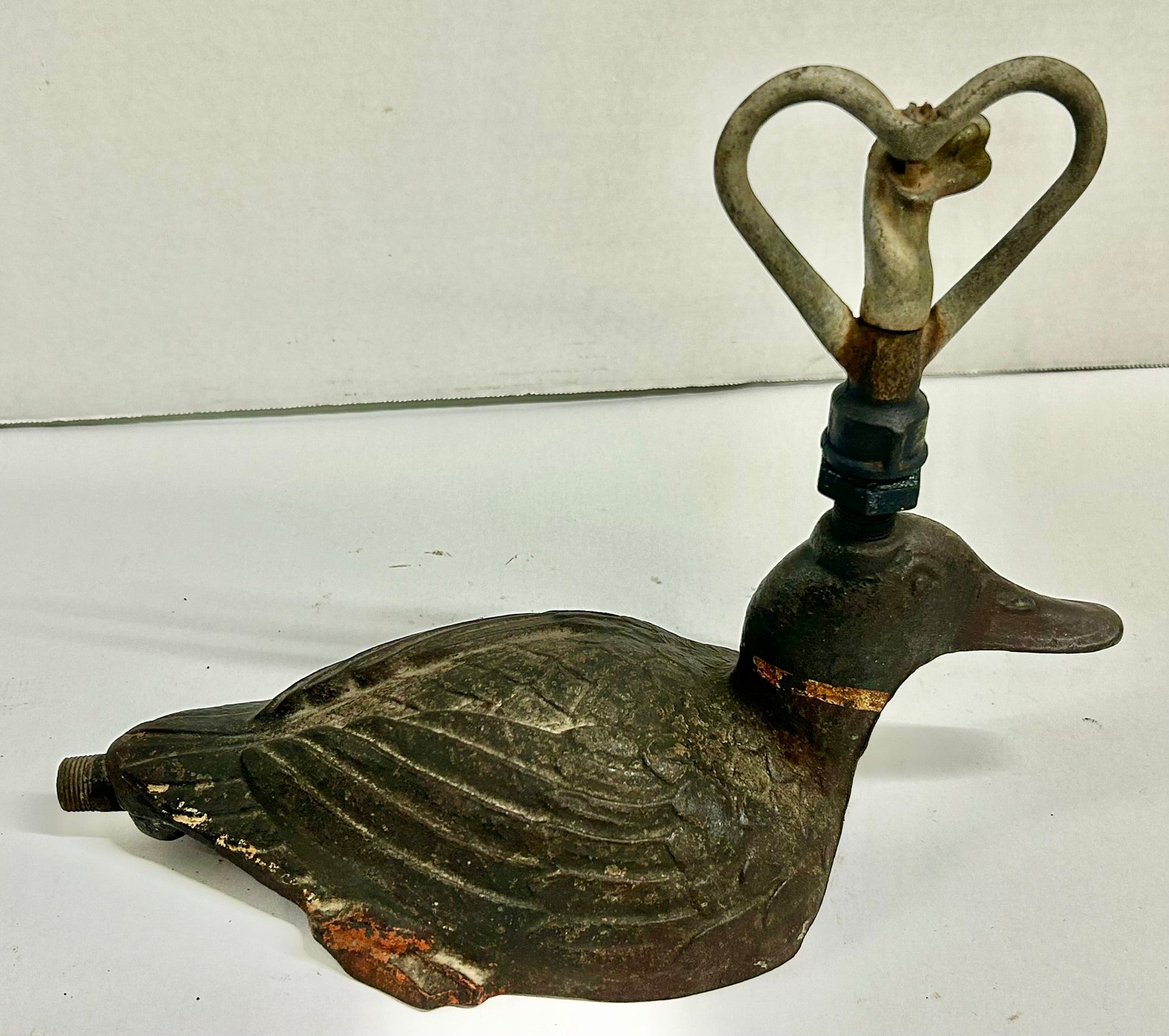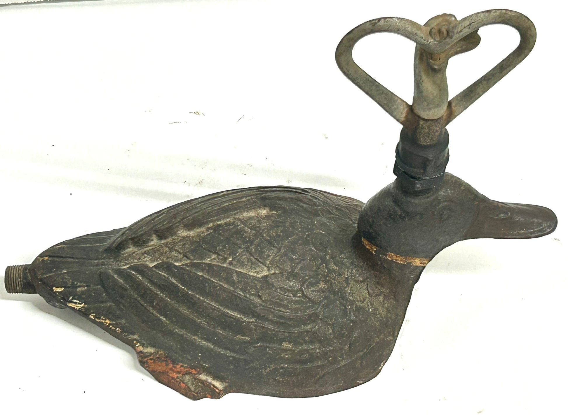 CAST IRON ANTIQUE DUCK LAWN SPRINKLER 12 1/2" LONG X 5 1/2" DEEP X 9 1/2" TALL. CALL OR TEXT FOR MORE INFORMATION