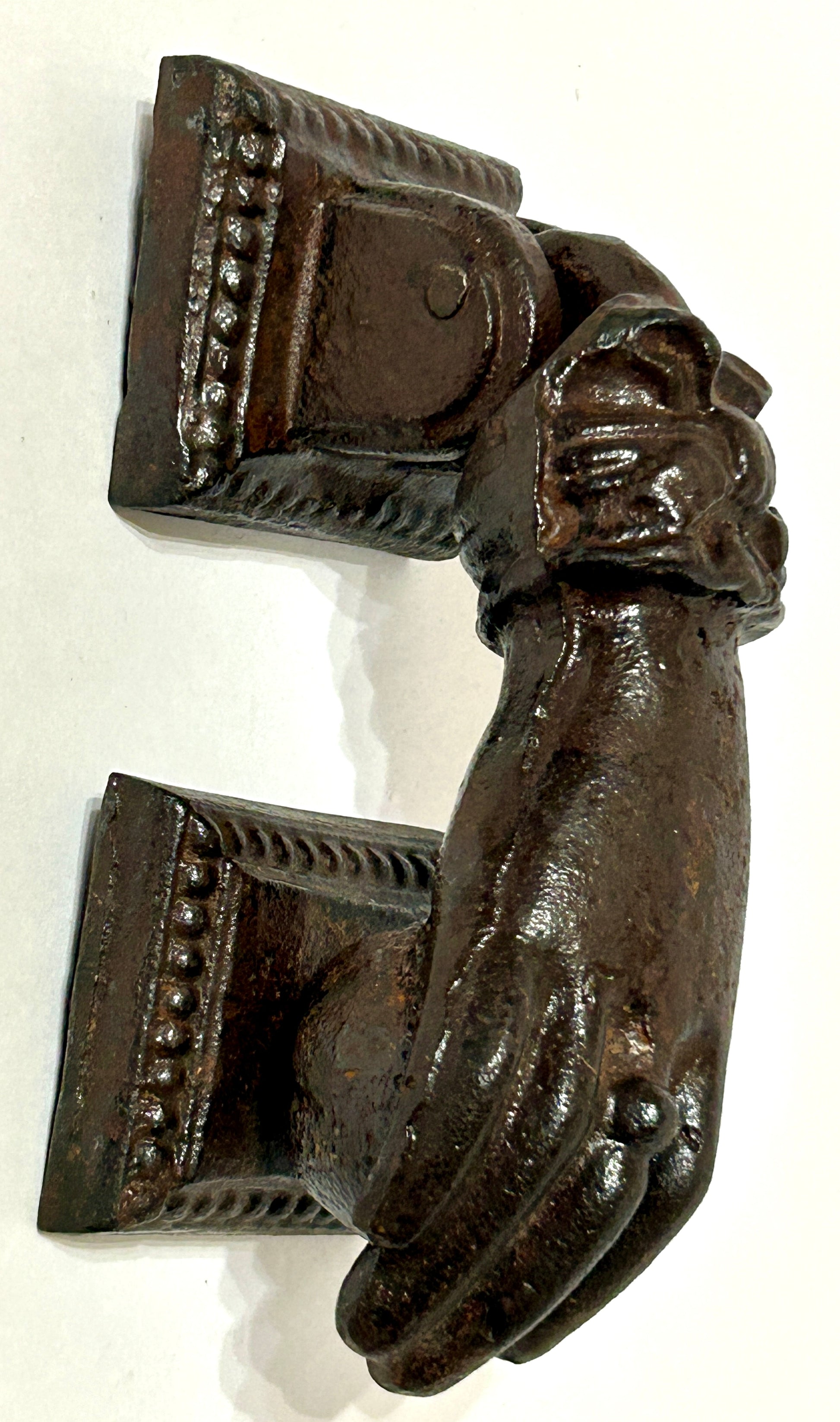 ANTIQUE CAST IRON FIGURAL HAND DOOR KNOCKER 6" LONG X 3" DEEP X 3" WIDE SHIPPING IS EXTRA SO CALL OR TEXT TO FIND OUT HOW MUCH SHIPPING WILL COST