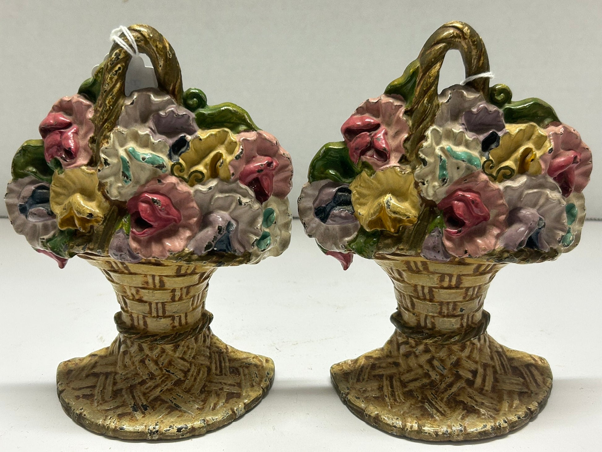 CAST IRON BOOKENDS OF FLOWERS IN BASKET