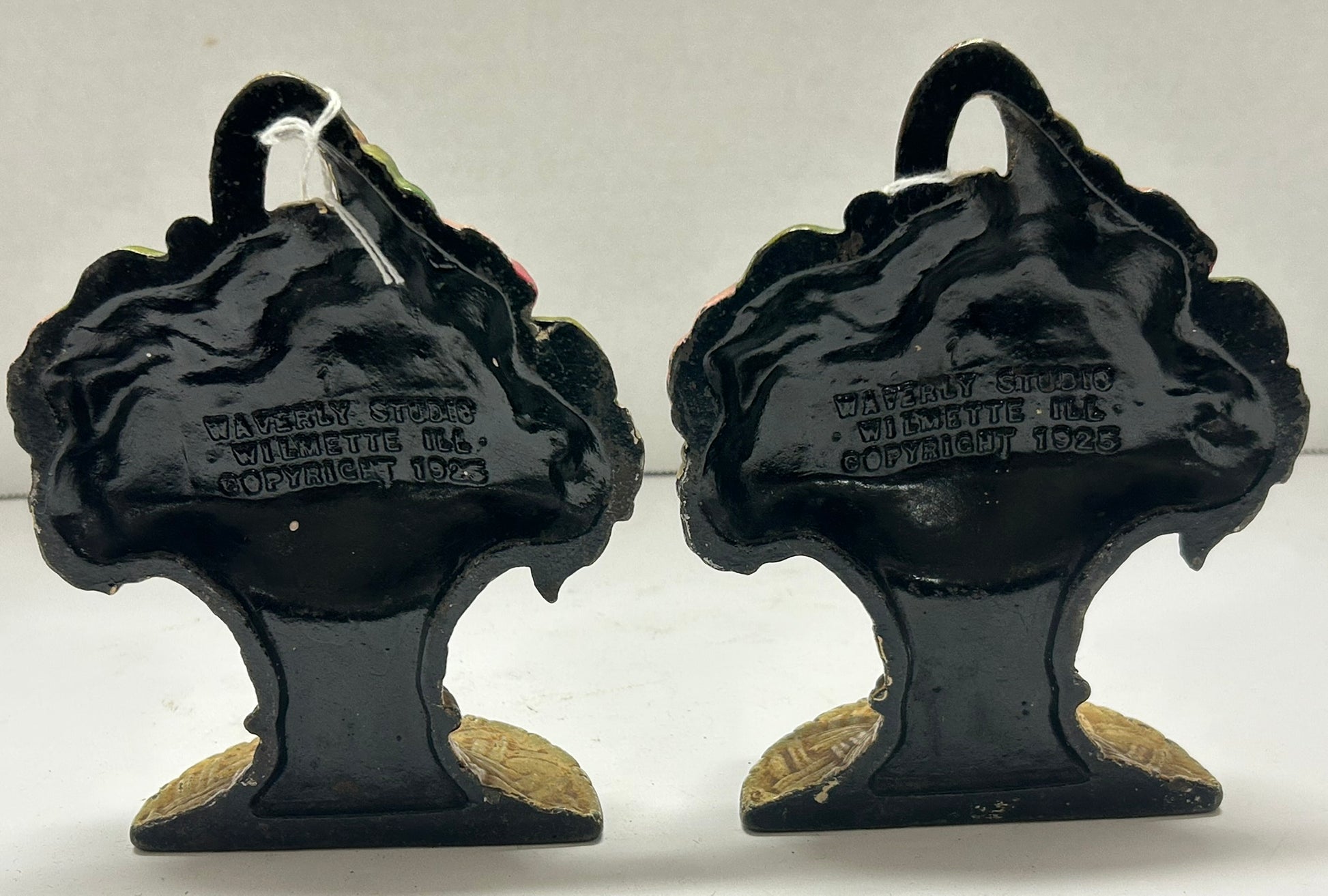 CAST IRON FLOWERS IN BASKET BOOKENDS BY WAVERLY STUDIO 1925 6 1/2" TALL X 5" WIDE. CALL OR TEXT FOR MORE INFORMATION