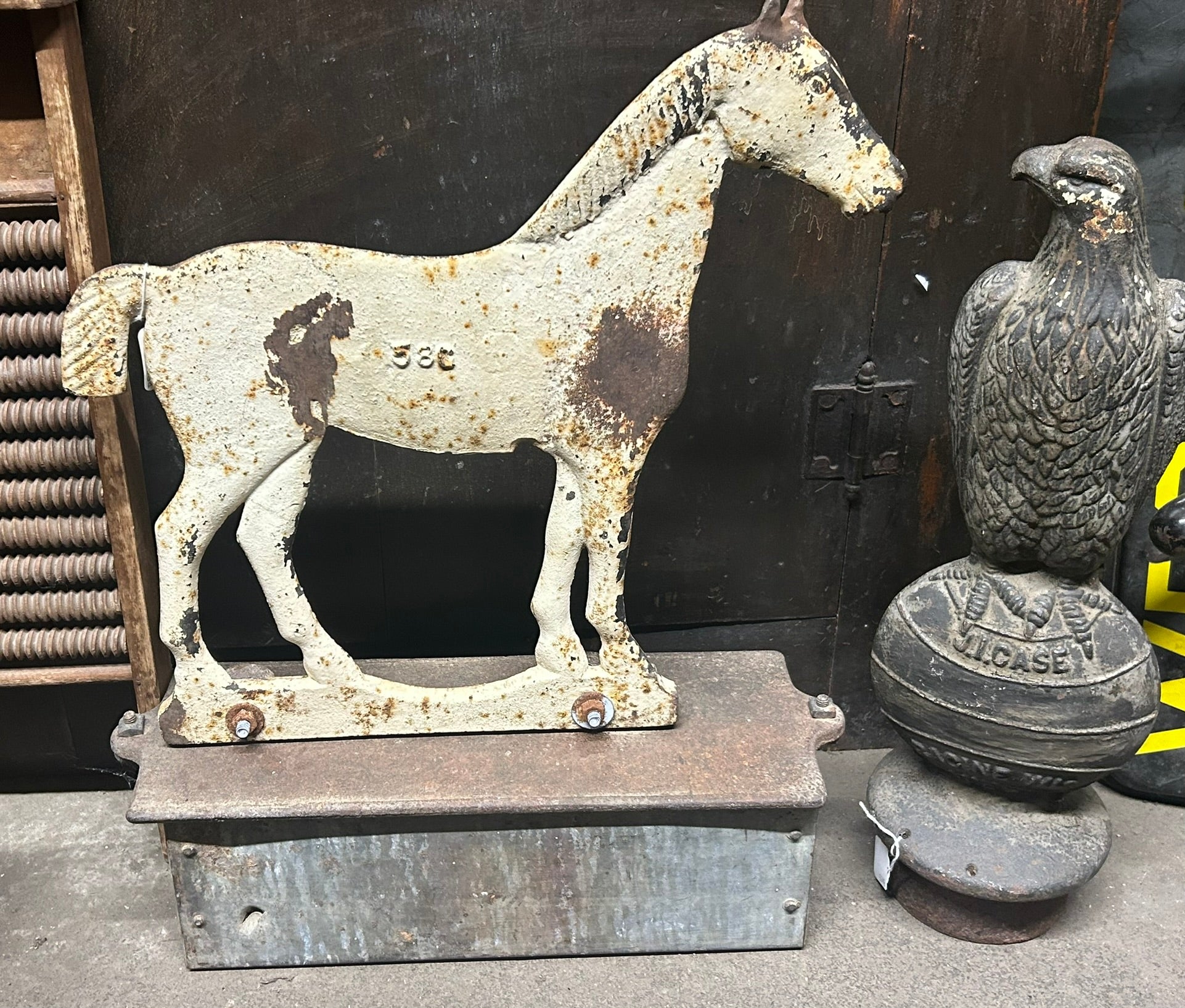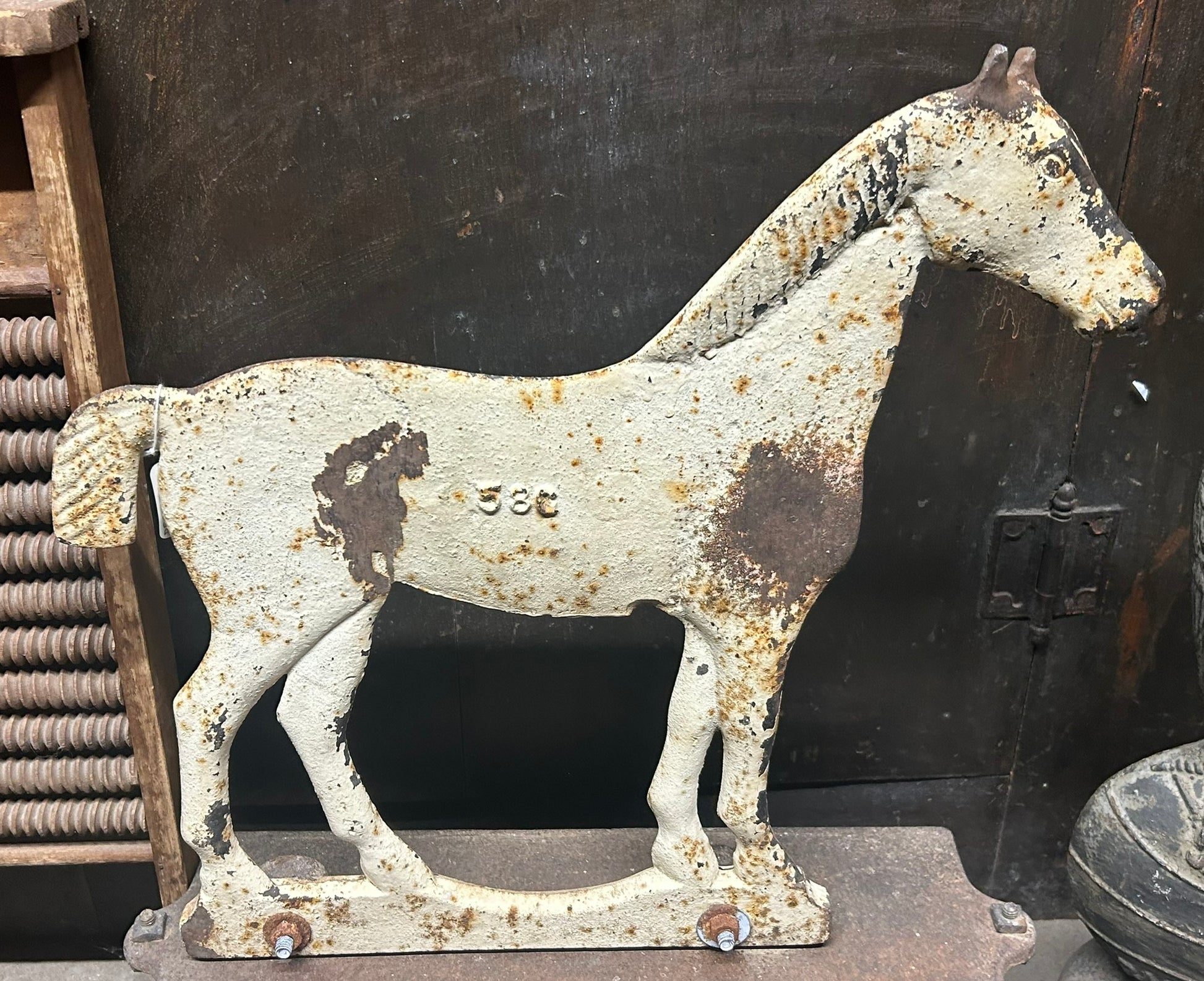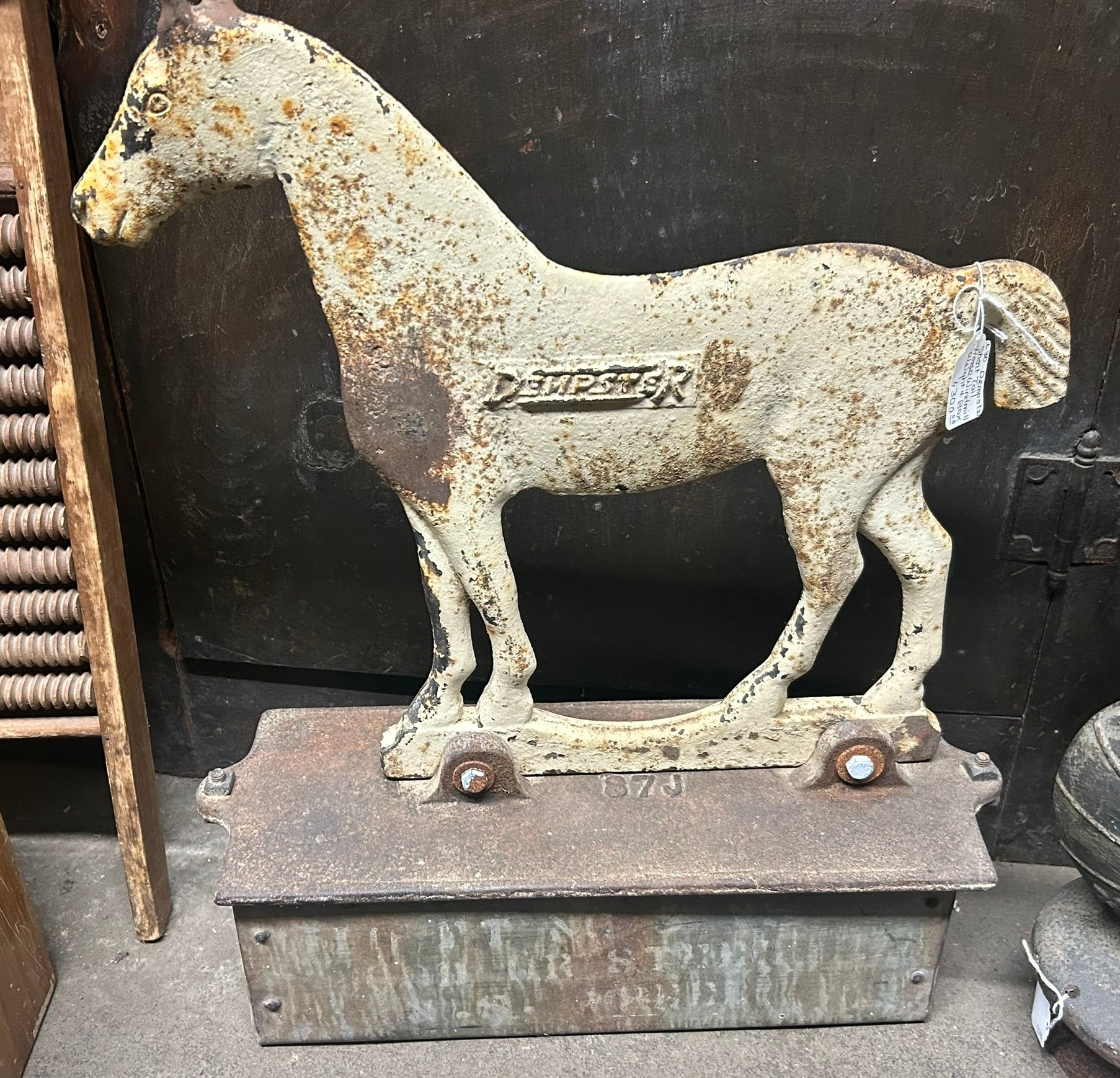 CAST IRON ANTIQUE DEMPSTER HORSE SHAPE WINDMILL WEIGHT WITH RARE WEIGHT BOX 22" TALL X 18" LONG. CALL OR TEXT FOR MORE INFORMATION