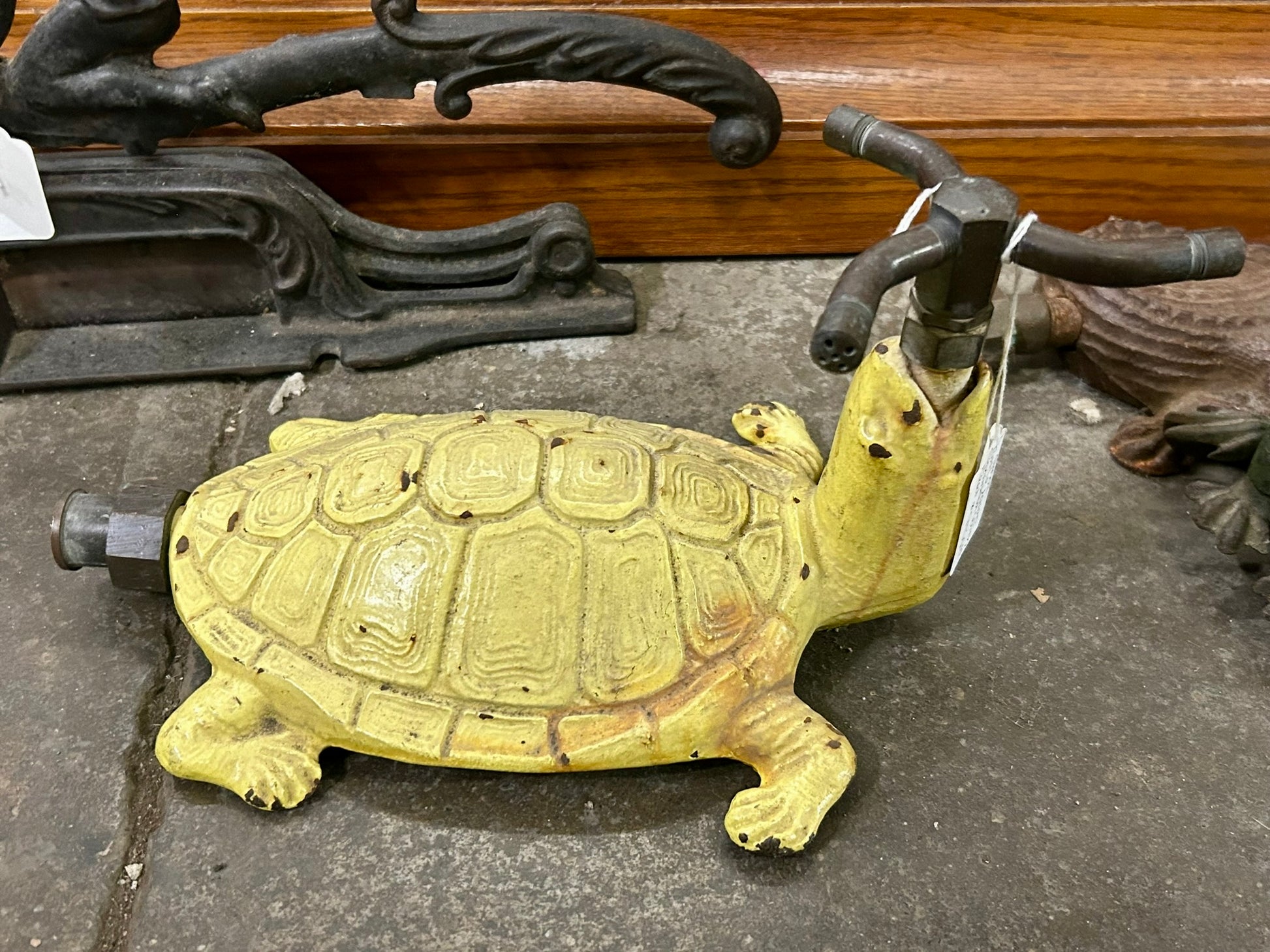CAST IRON FIGURAL TURTLE WATER SPRINKLER WITH YELLOW PAINT 12" LONG. CALL, TEXT, OR E-MAIL FOR MORE INFORMATION