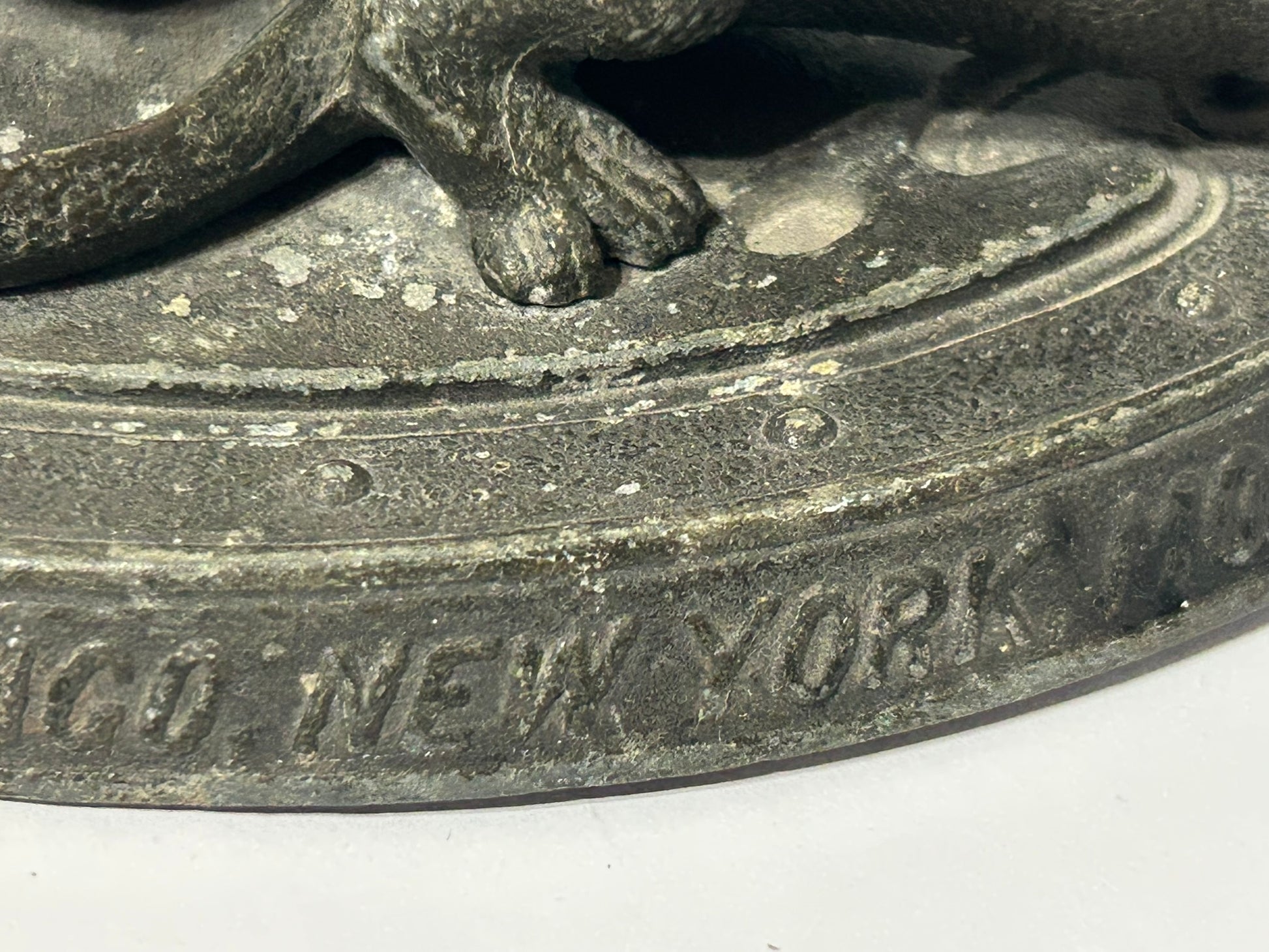 ANTIQUE ADVERTISING FIGURAL CHAMELEON METAL PAPERWEIGHT FOR SHERWIN WILLIAMS PAINT 5 1/2" LONG X 4" WIDE AND 2 1/2" TALL. CALL OR TEXT FOR MORE INFORMATION
