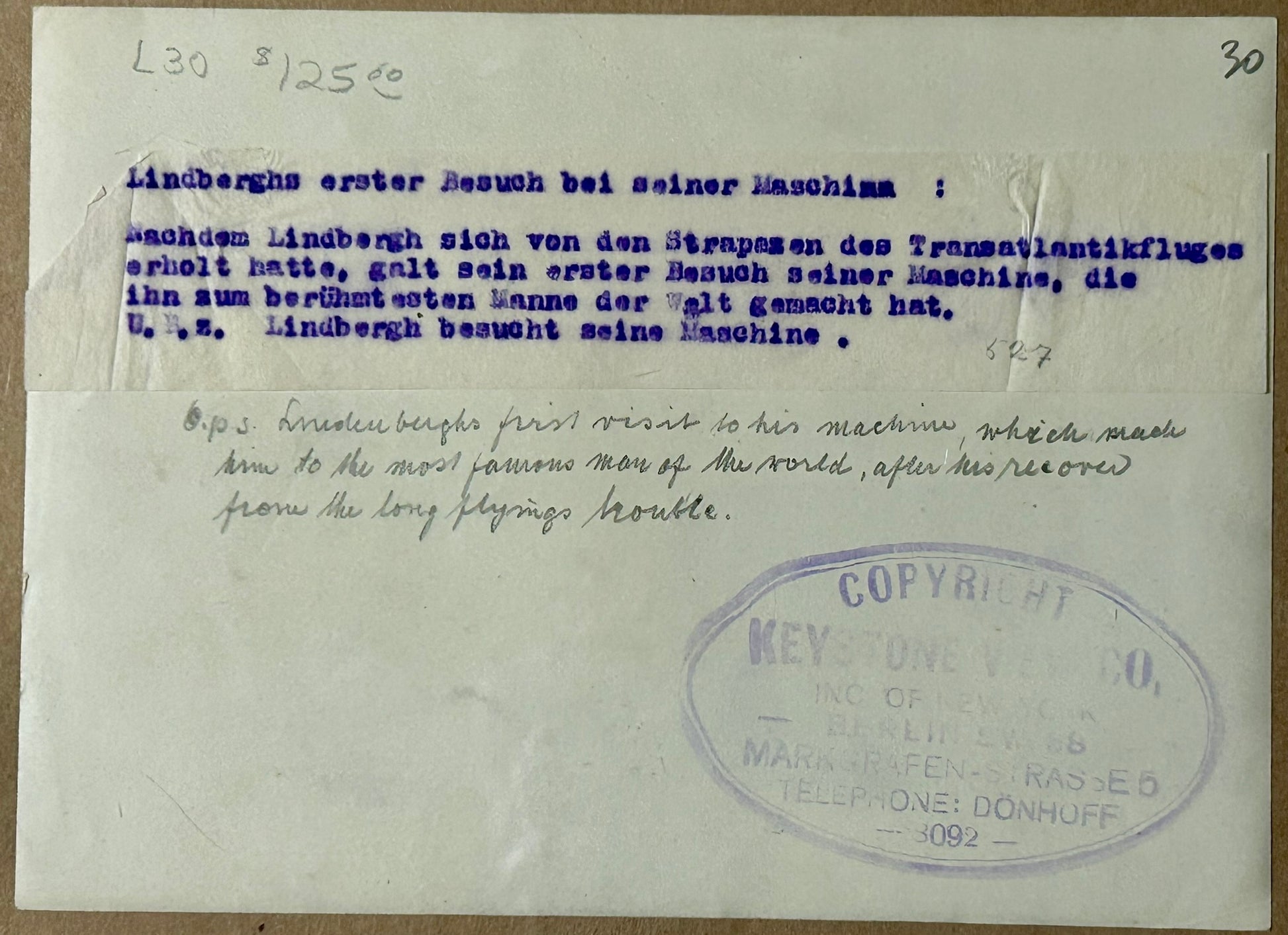 # L 11 CHARLES LINDBERGH PHOTOGRAPH SHOWING HIM LOOKING AT SPIRIT OF ST. LOUIS 5" X 7". CALL OR TEXT FOR MORE INFORMATION