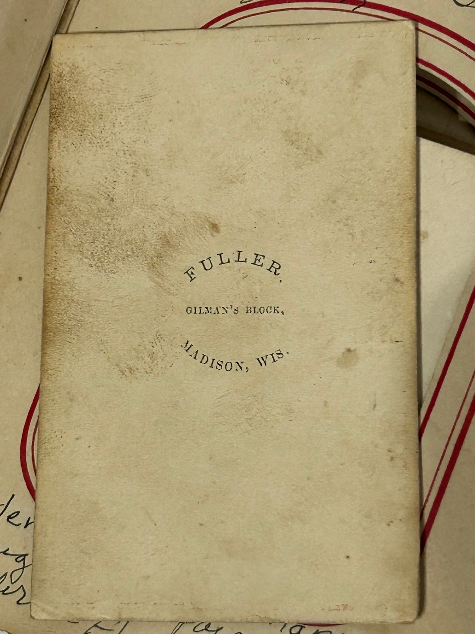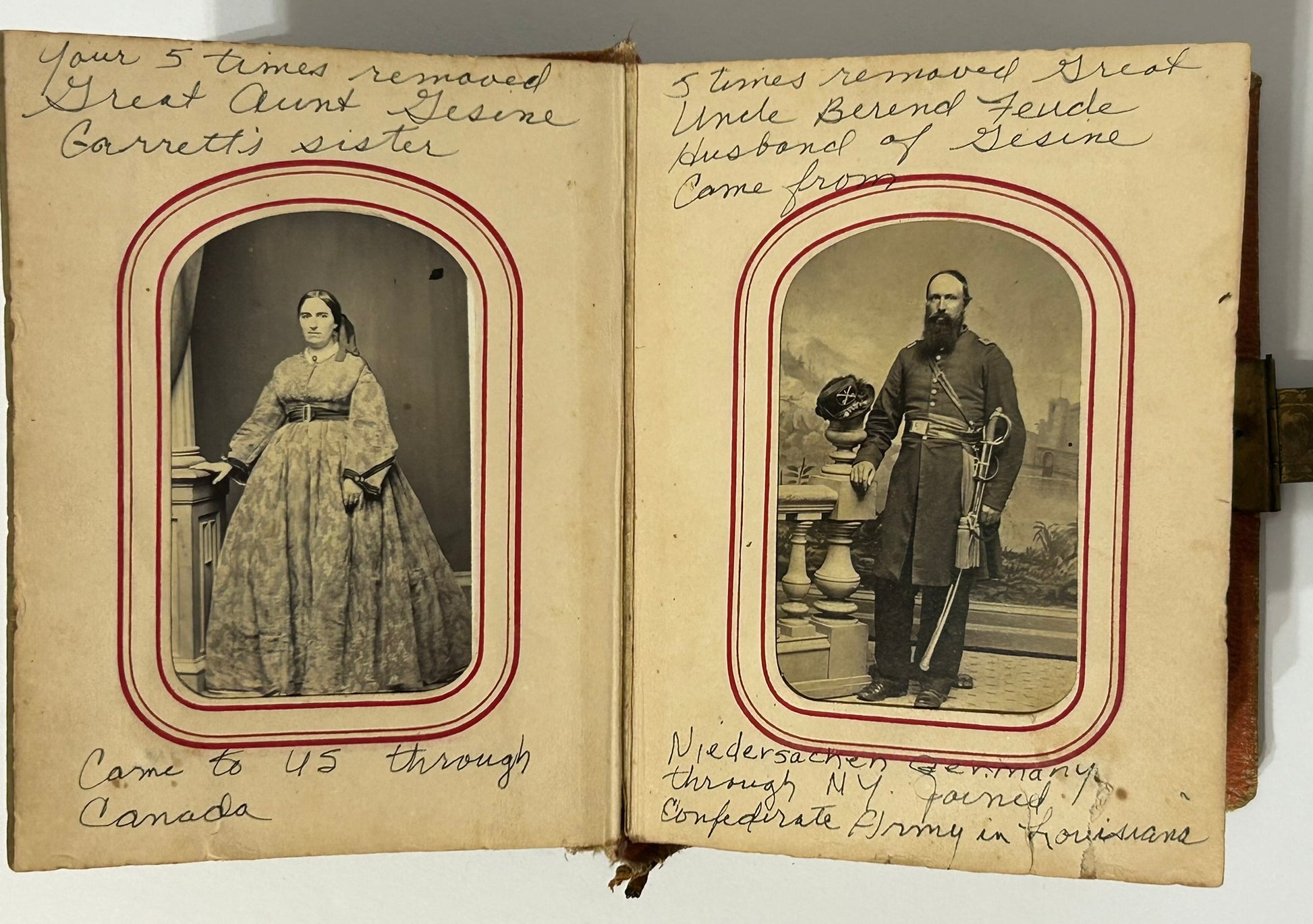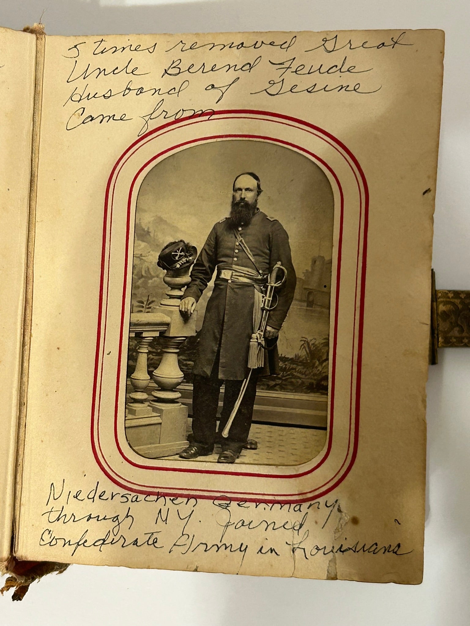 CIVIL WAR OFFICER CDV PHOTOGRAPH IN FANCY CIRCA 1860 ALBUM. PHOTOGRAPHER FULLER OF MADISON, WIS. UNION OFFICER IN FULL DRESS IS MISLABELED AS BEING CONFEDERATE IN THIS FAMILY ALBUM WITH TOTAL OF 50 PHOTOS IN BOTH CDV AND TINTYPES. CALL OR TEXT FOR MORE INFORMATION