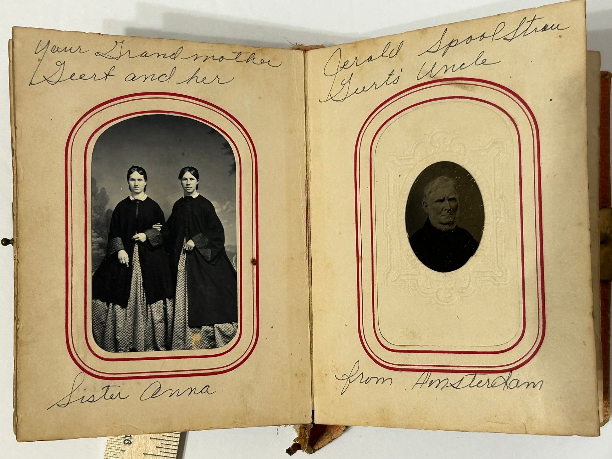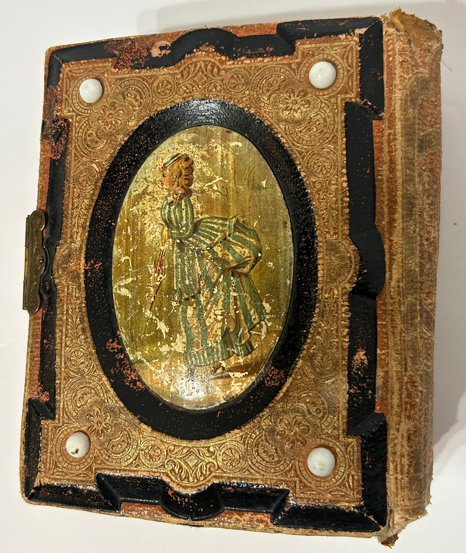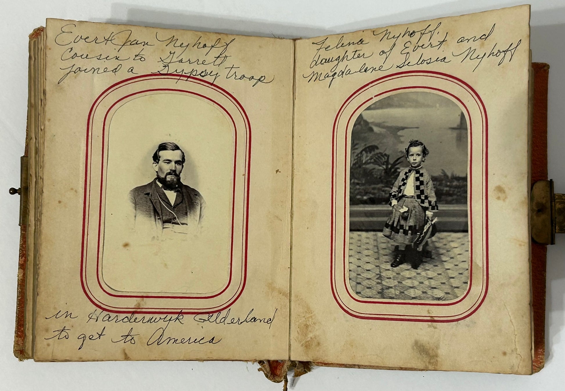 CIVIL WAR OFFICER CDV PHOTOGRAPH IN FANCY CIRCA 1860 ALBUM. PHOTOGRAPHER FULLER OF MADISON, WIS. UNION OFFICER IN FULL DRESS IS MISLABELED AS BEING CONFEDERATE IN THIS FAMILY ALBUM WITH TOTAL OF 50 PHOTOS IN BOTH CDV AND TINTYPES. CALL OR TEXT FOR MORE INFORMATION
