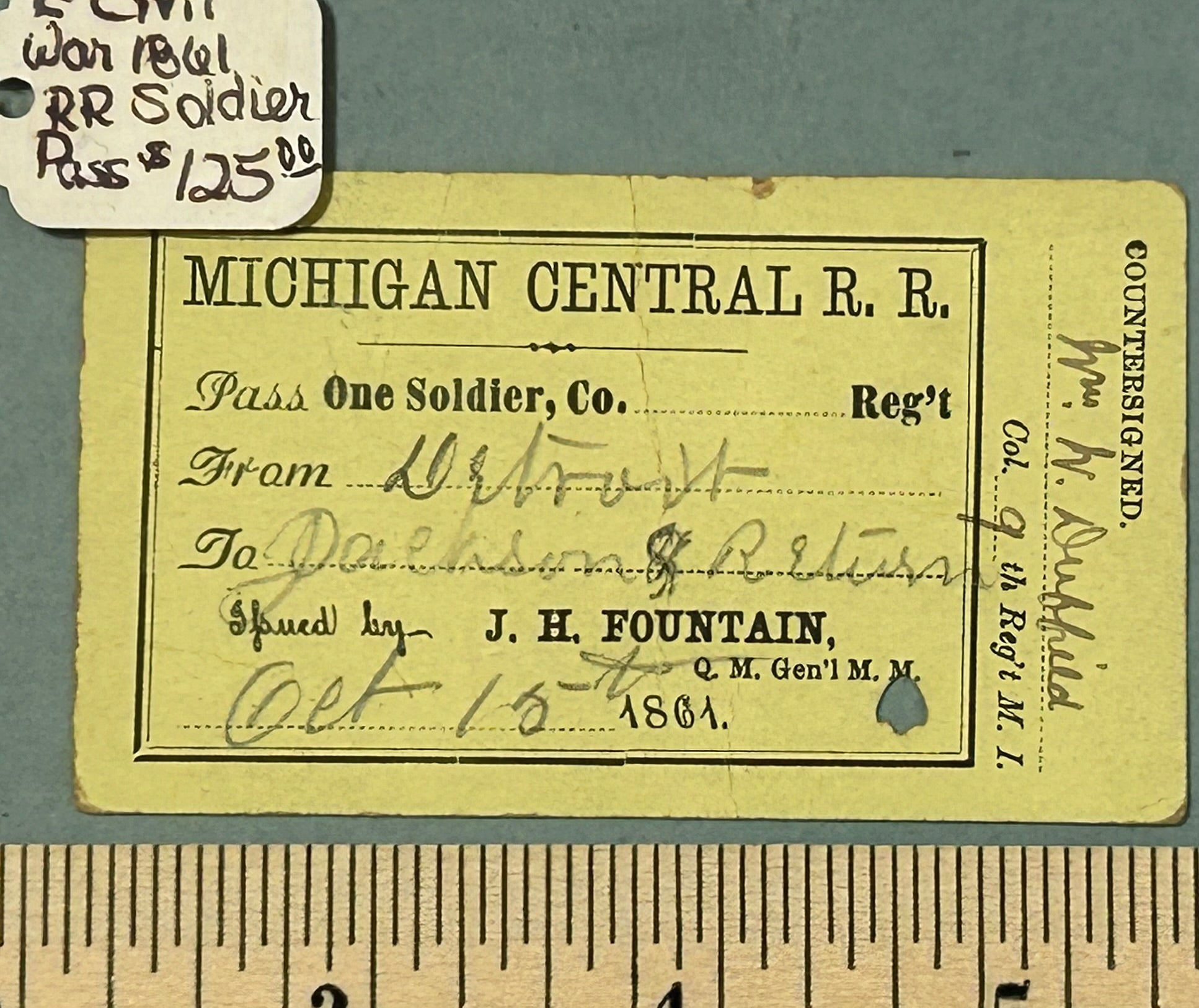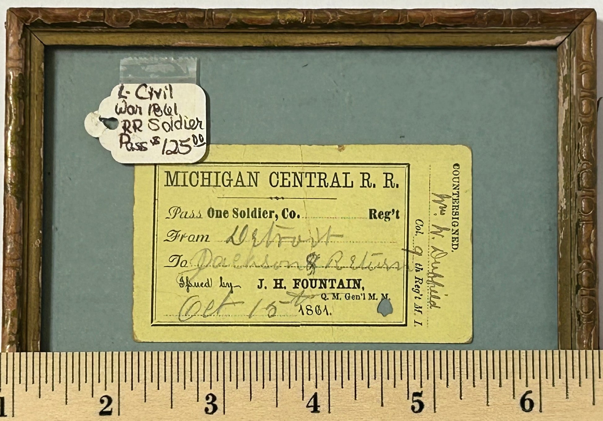 1861 MICHIGAN CENTRAL R.R. PASS FOR SOLDIER IN 9TH MICHIGAN INFANTRY, COMMAND OF COL, WM. WARD DUFFIELD 2" X 3 1/4" PASS PLUS FRAMED SIZE. CALL OR TEXT FOR MORE INFORMATION