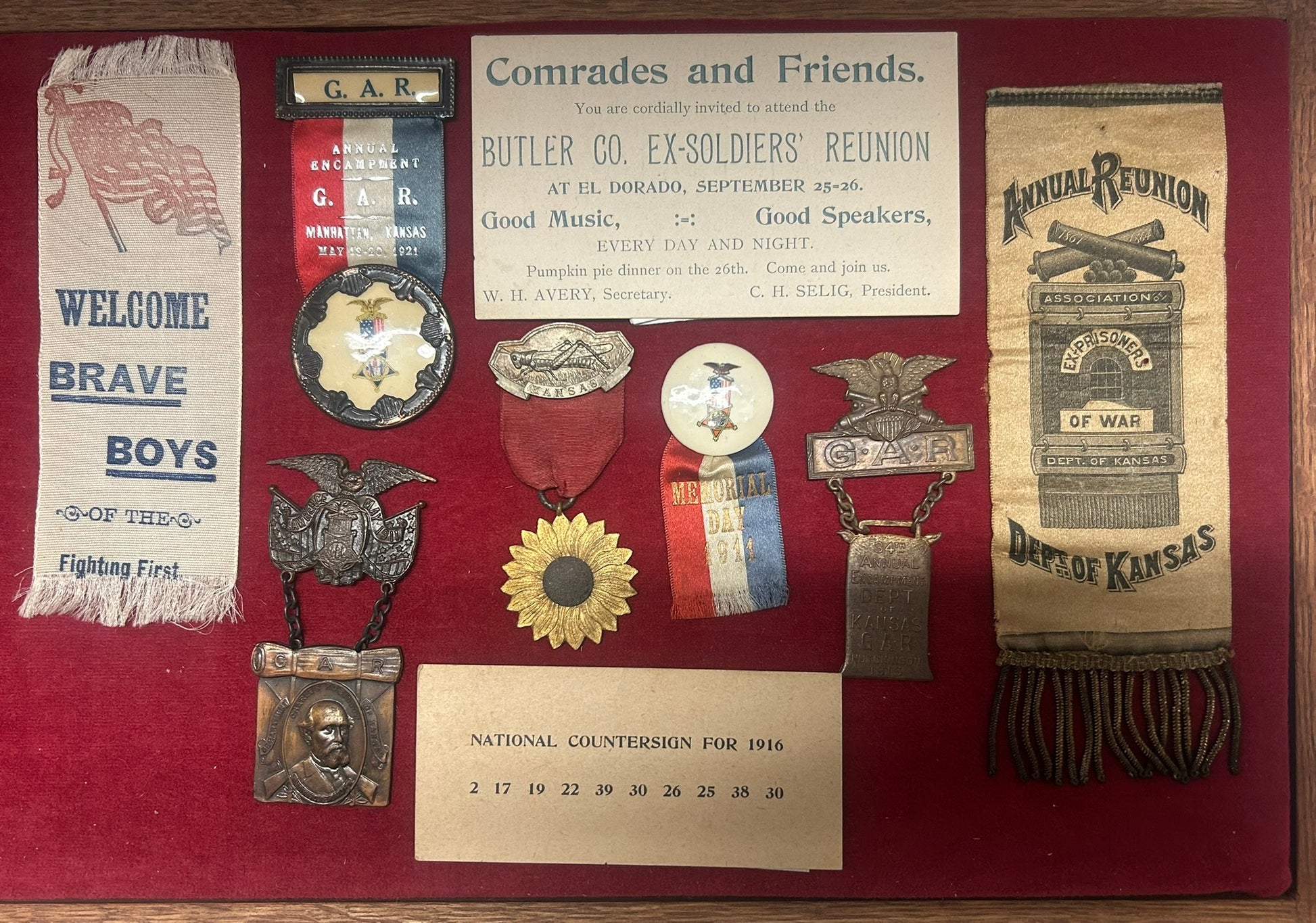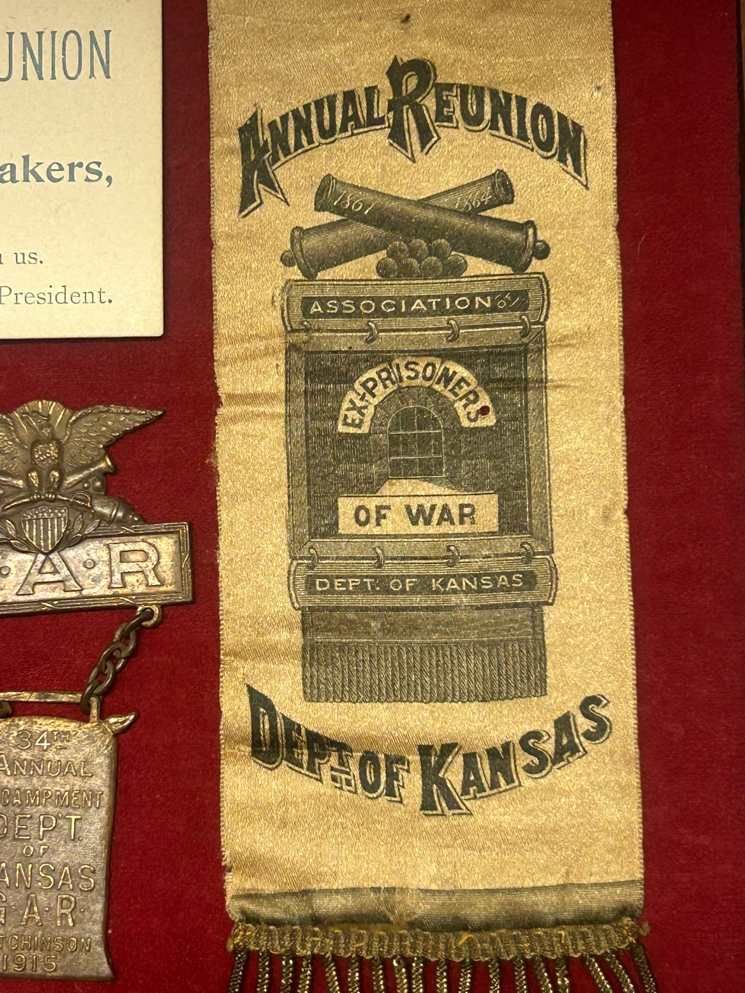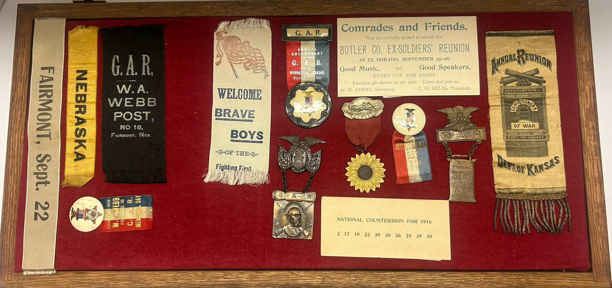 CIVIL WAR REUNION BADGES FOR NEBRASKA AND KANSAS INCLUDING PRISONERS OF WAR - CASE IS 22" LONG X 10 1/2" WIDE. CALL OR TEXT FOR MORE INFORMATION