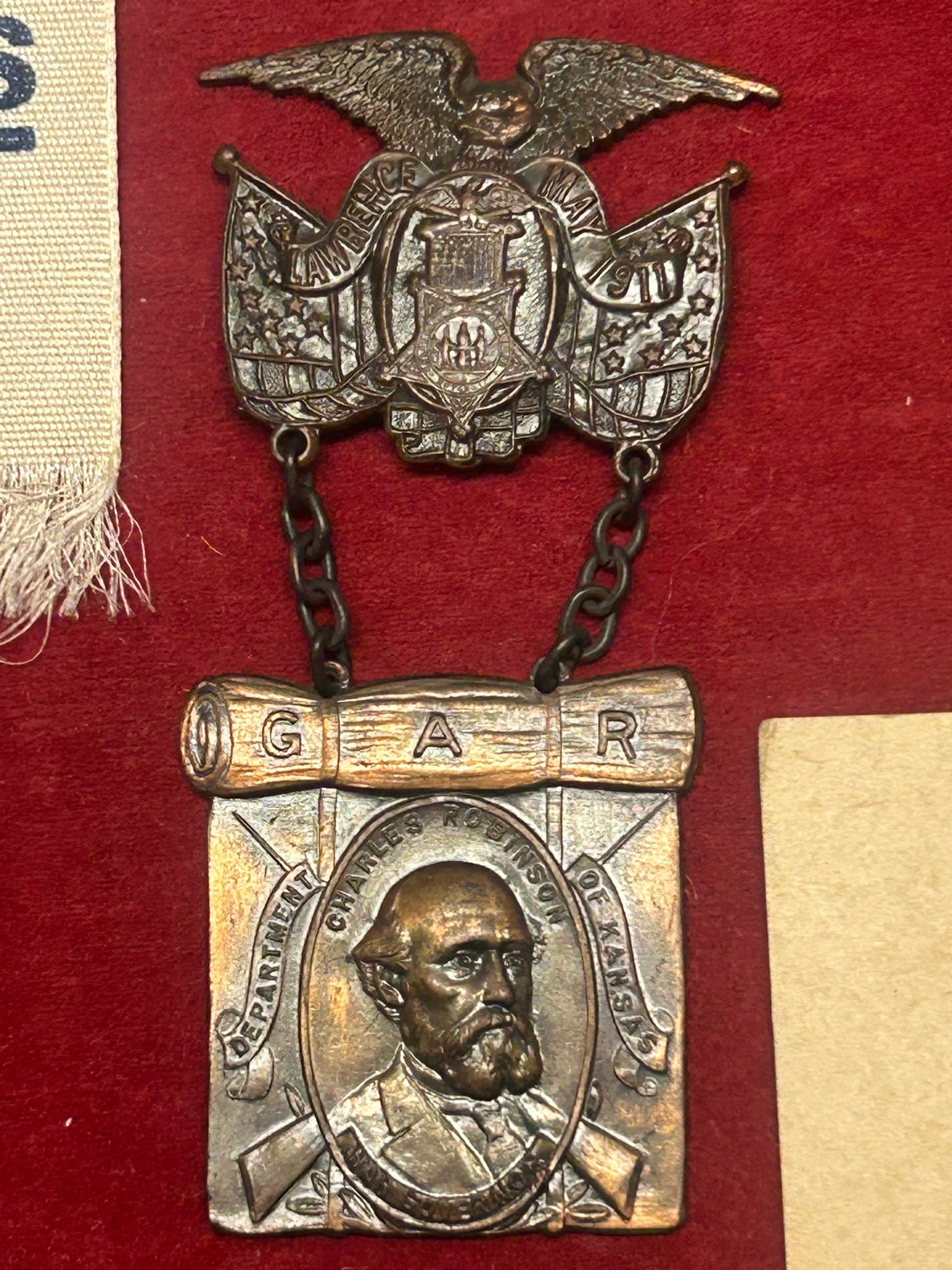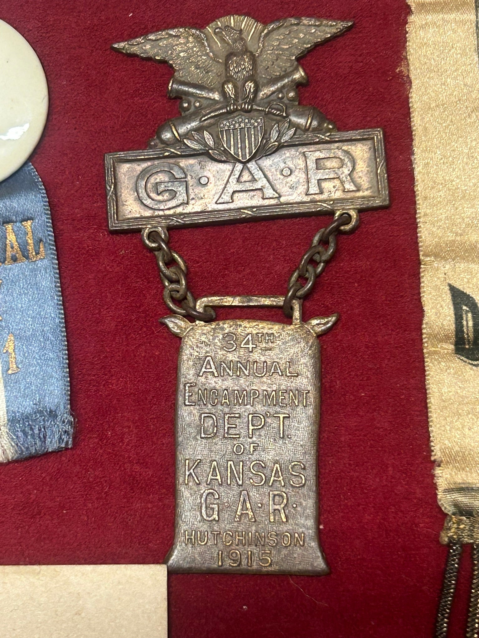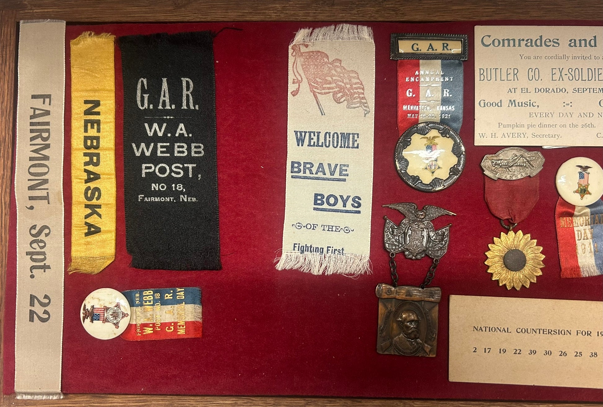 CIVIL WAR REUNION BADGES FOR NEBRASKA AND KANSAS INCLUDING PRISONERS OF WAR - CASE IS 22" LONG X 10 1/2" WIDE. CALL OR TEXT FOR MORE INFORMATION