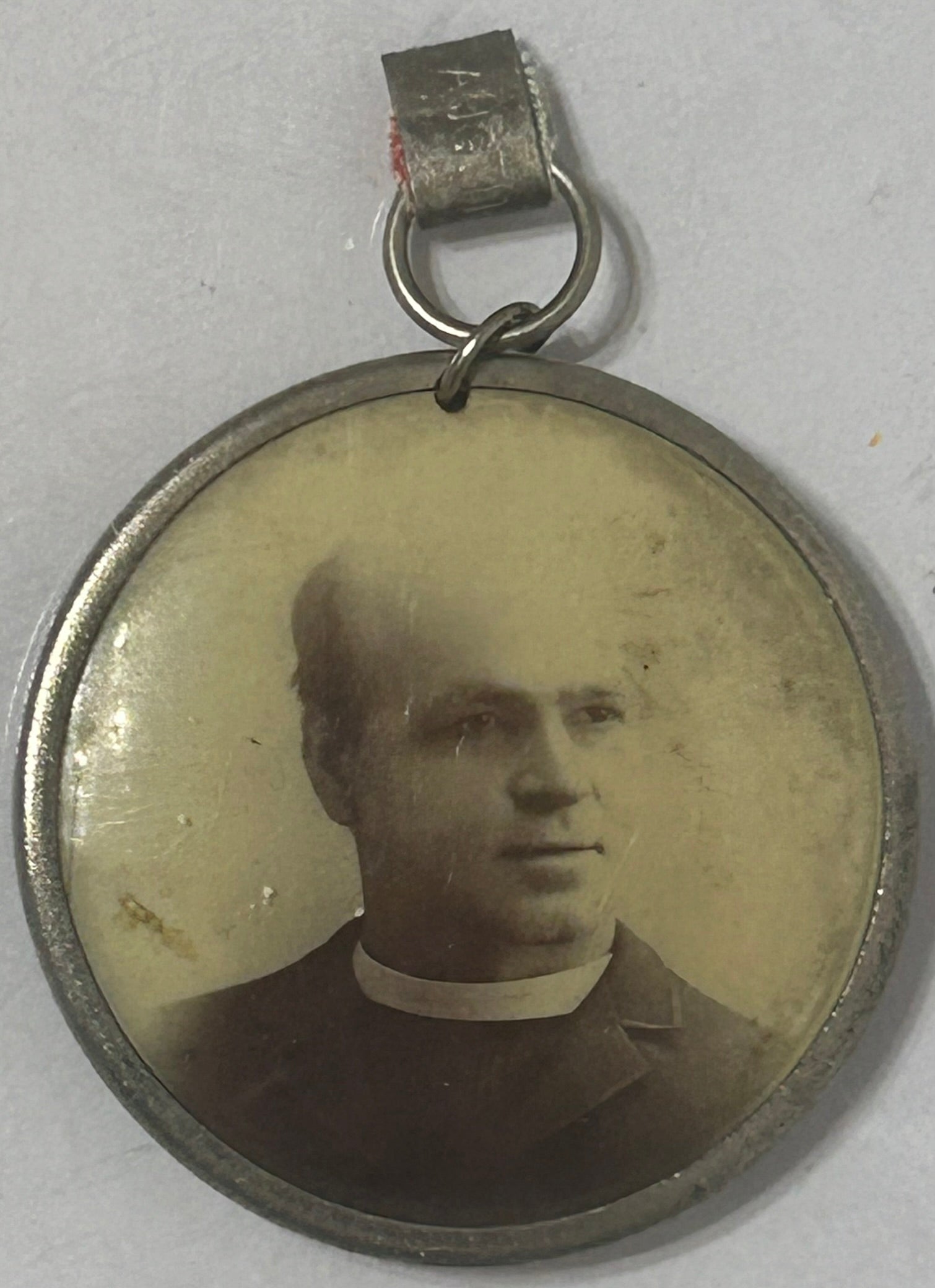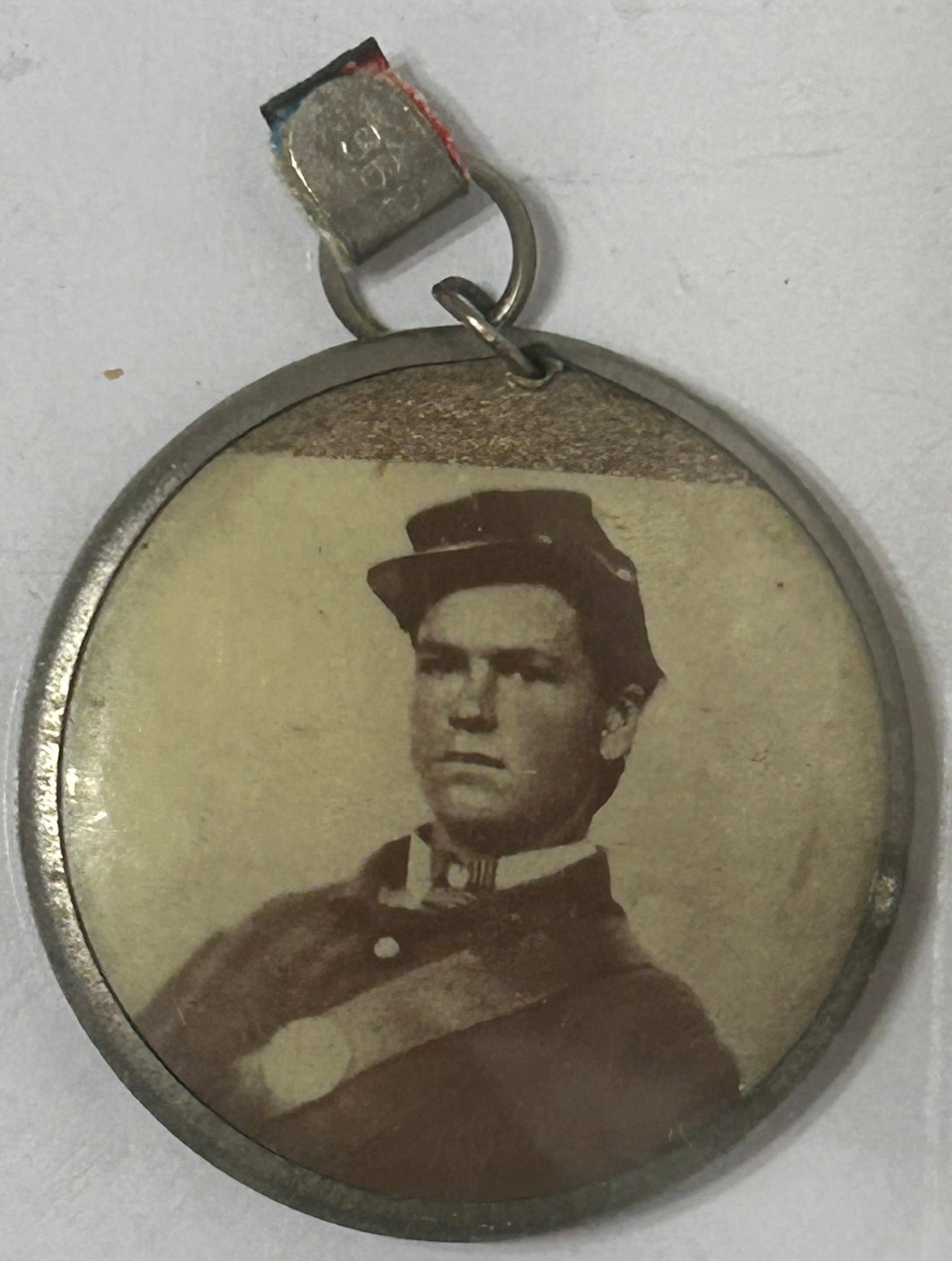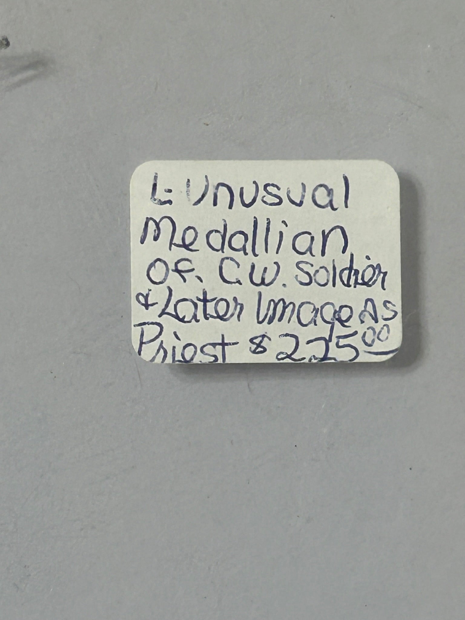 CIVIL WAR SOLDIER PORTRAIT MEDALLION WITH REVERSE SIDE PHOTO OF HIM AS PRIEST 1 1/2" DIA. CALL OR TEXT FOR MORE INFORMATION