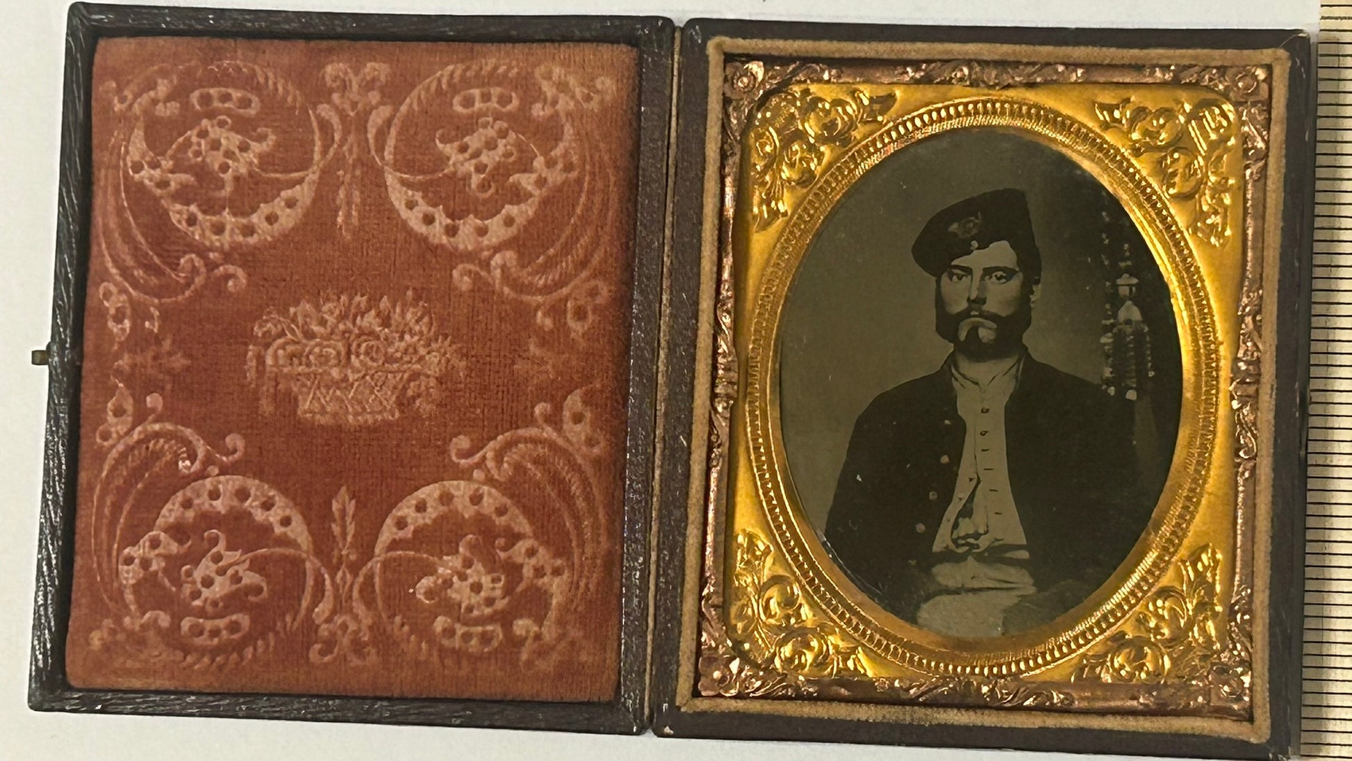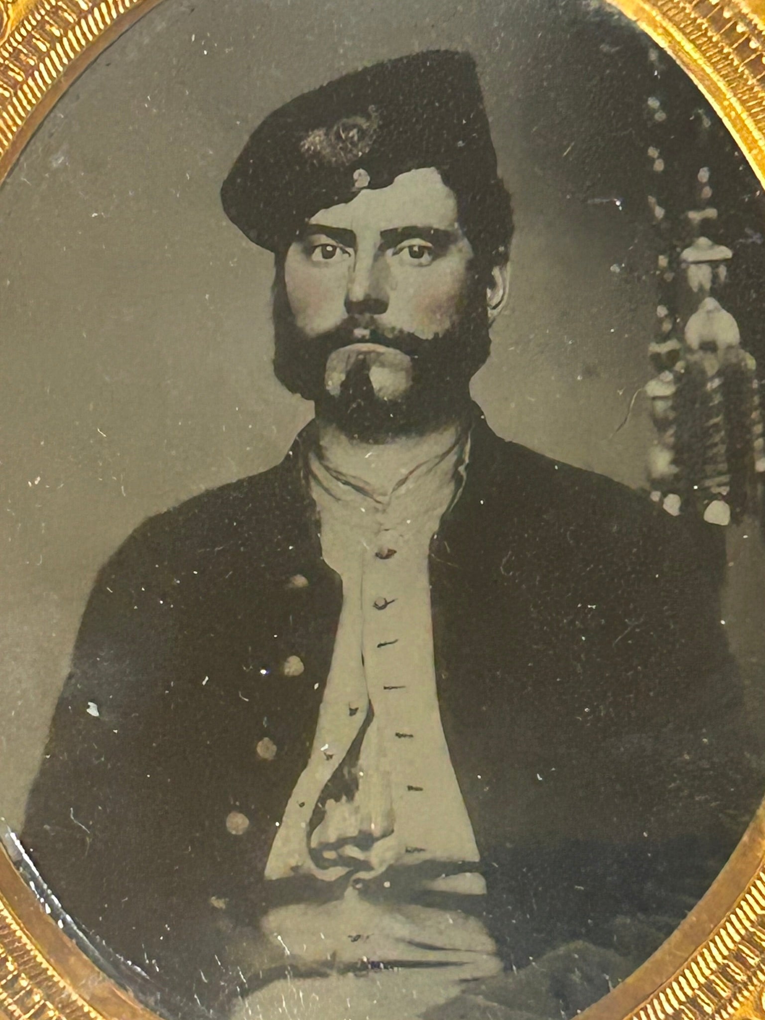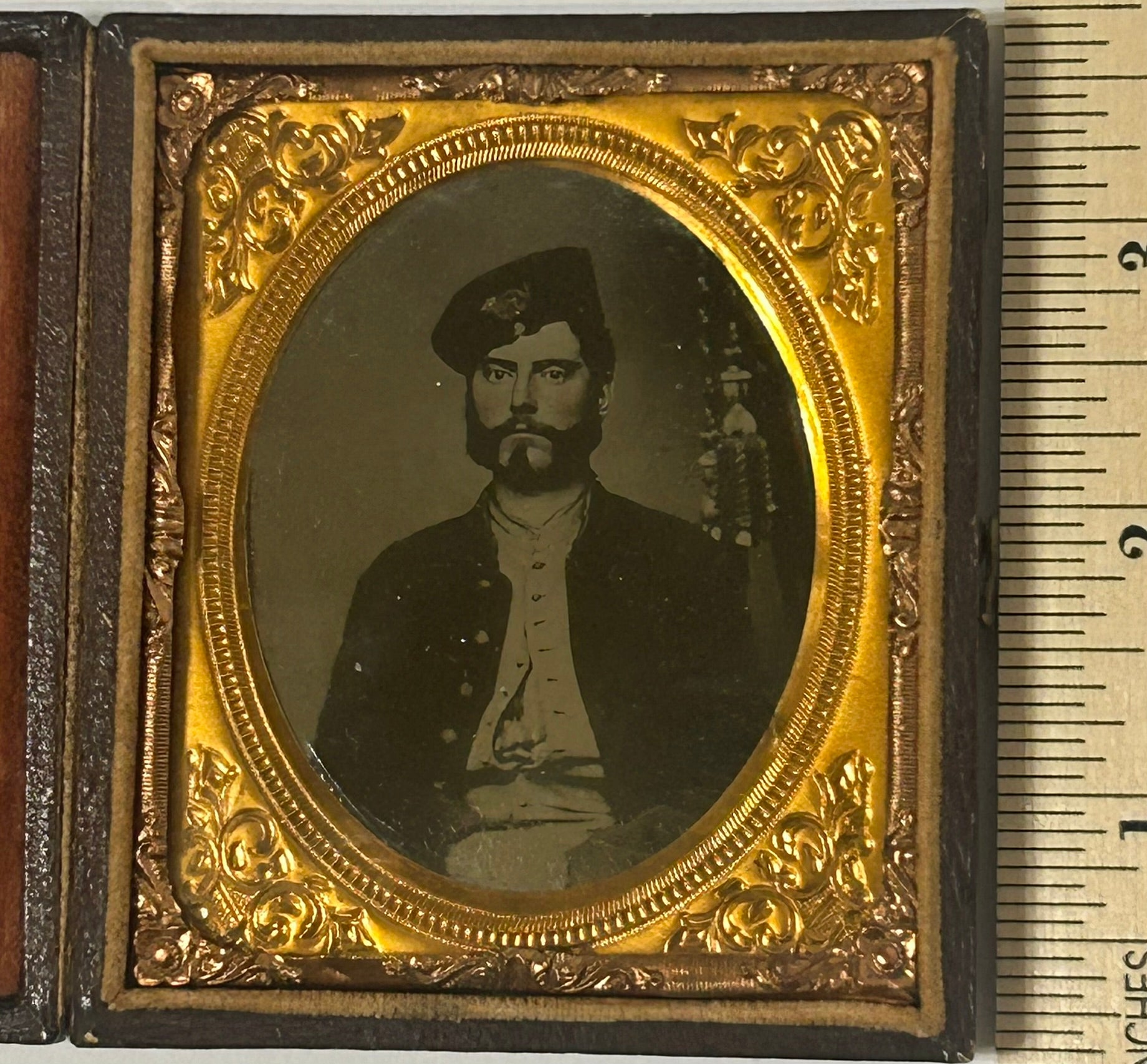 CIVIL WAR SOLDIER WEARING UNUSUAL HAT PORTRAIT TINTYPE IN CASE. CALL OR TEXT FOR MORE INFORMATION