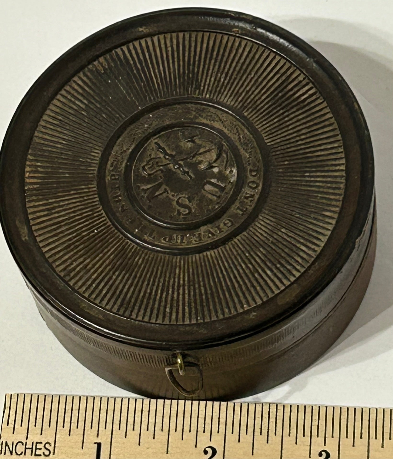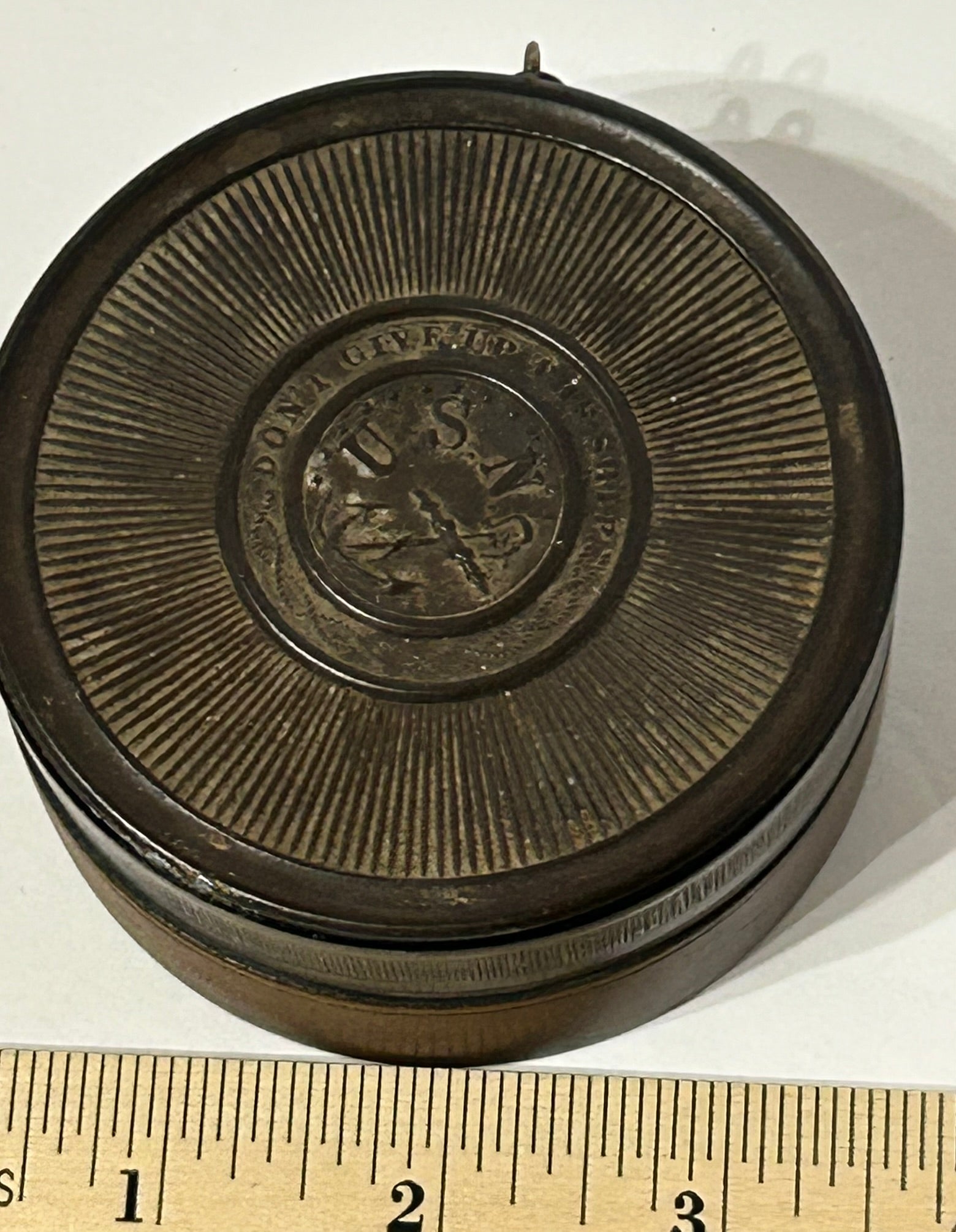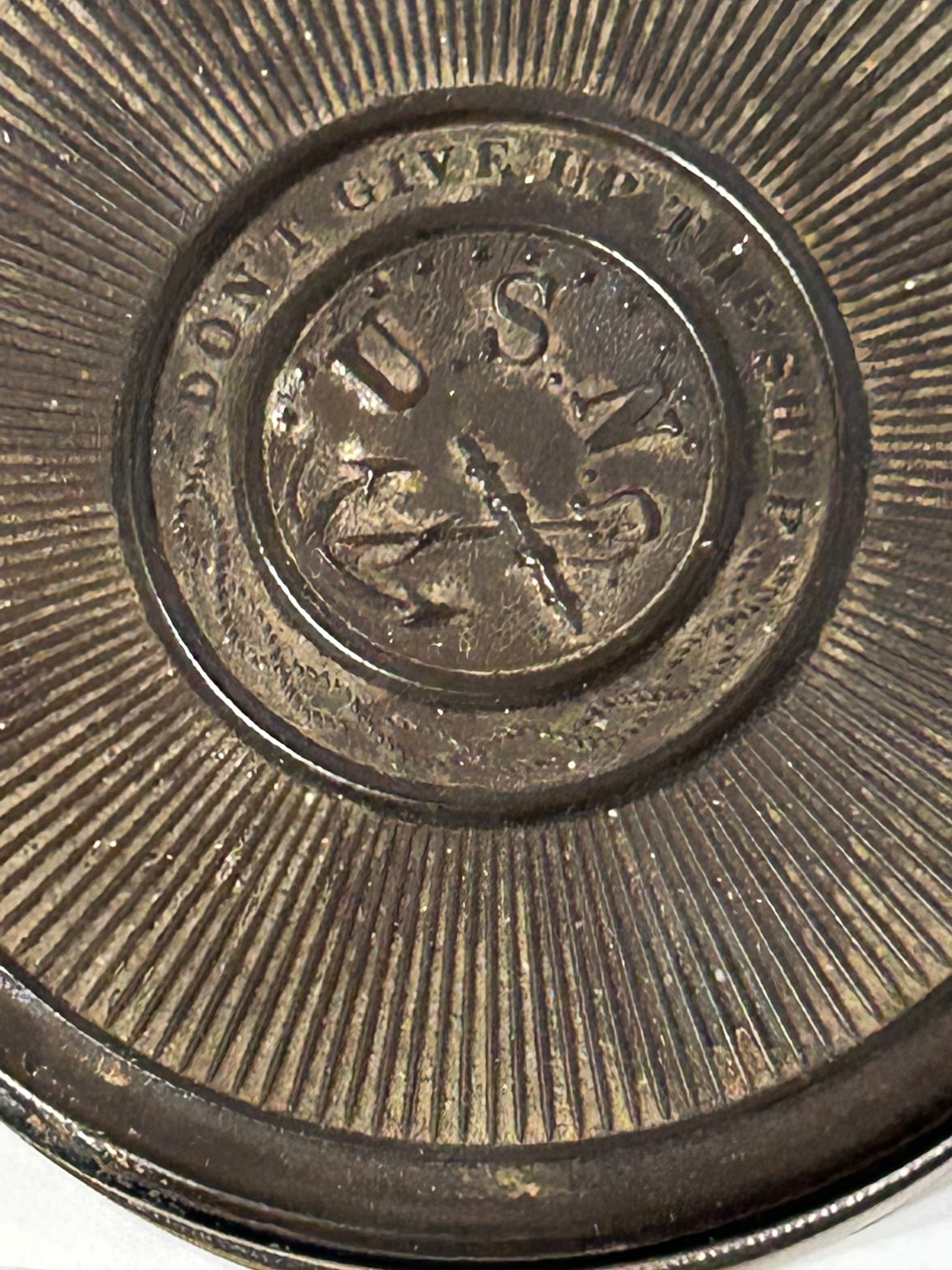 CIVIL WAR NAVY EMBLEM "DON'T GIVE UP THE SHIP" WITH ANCHOR LID AND PATENTED 1851, HAS RING TO HANG AND ORIGINALLY HAD MIRROR IN LID, A RARE ITEM MADE OF GUTTA PERCHA 3 1/4" DIA. CALL OR TEXT FOR MORE INFORMATION