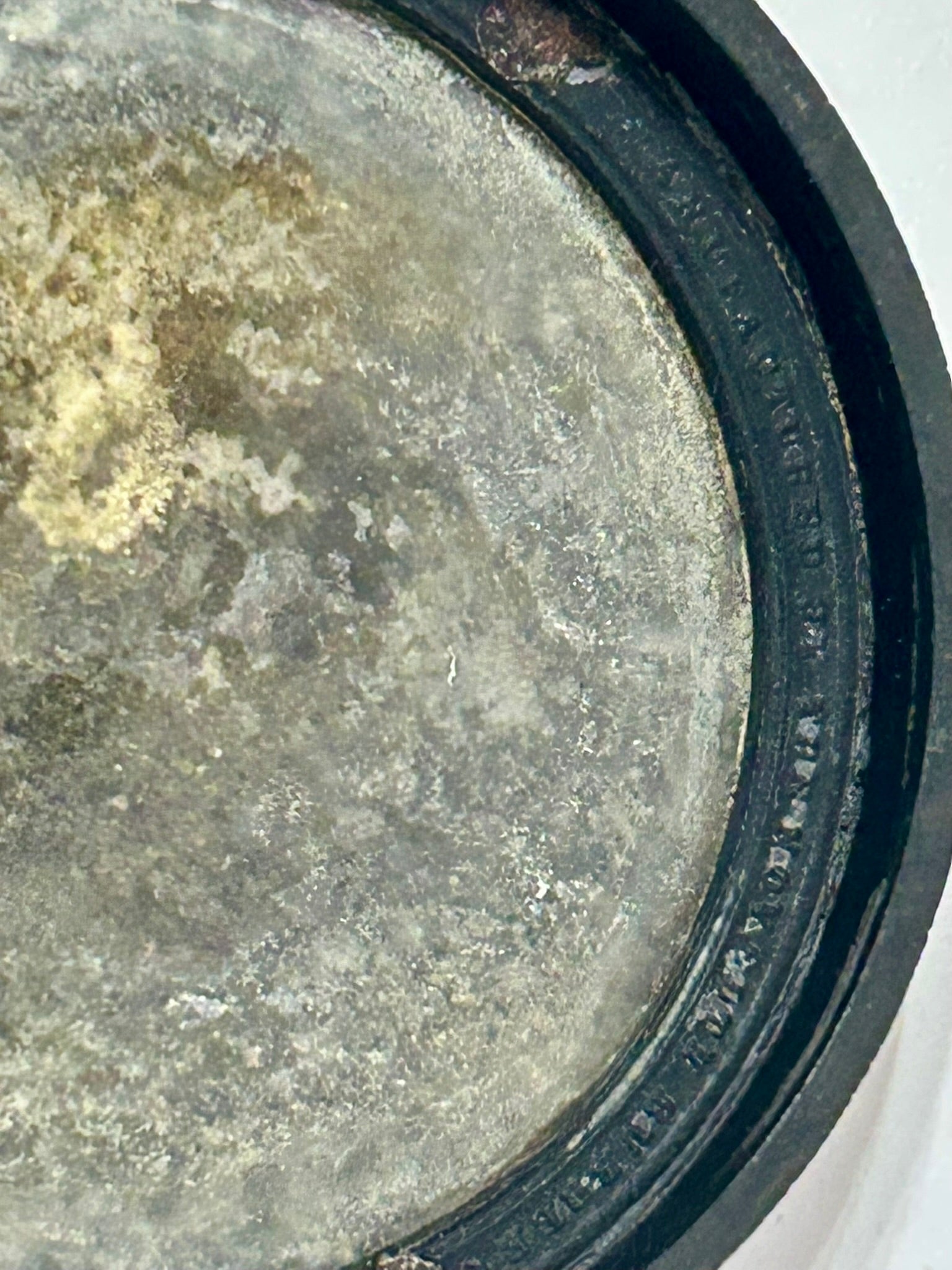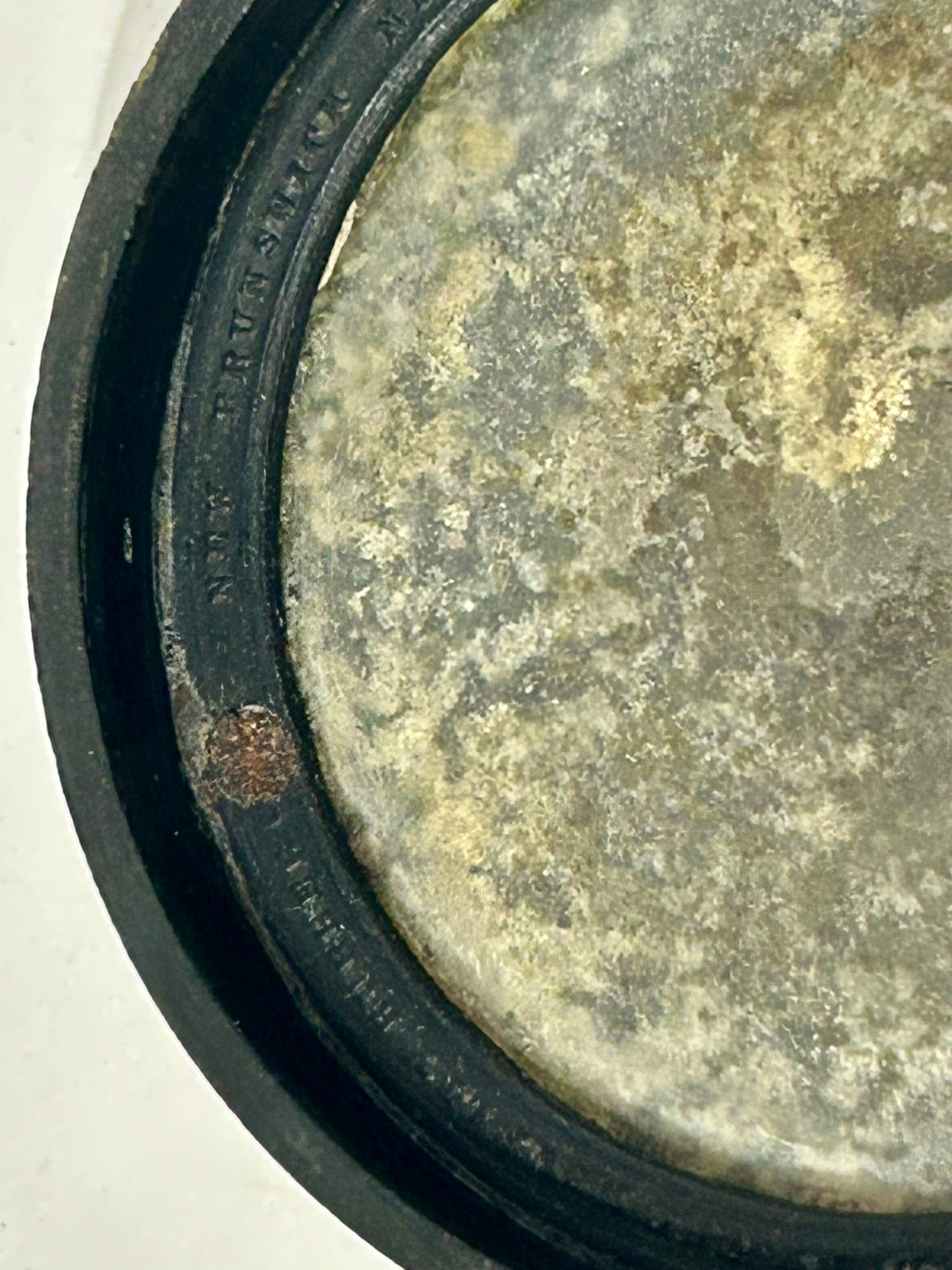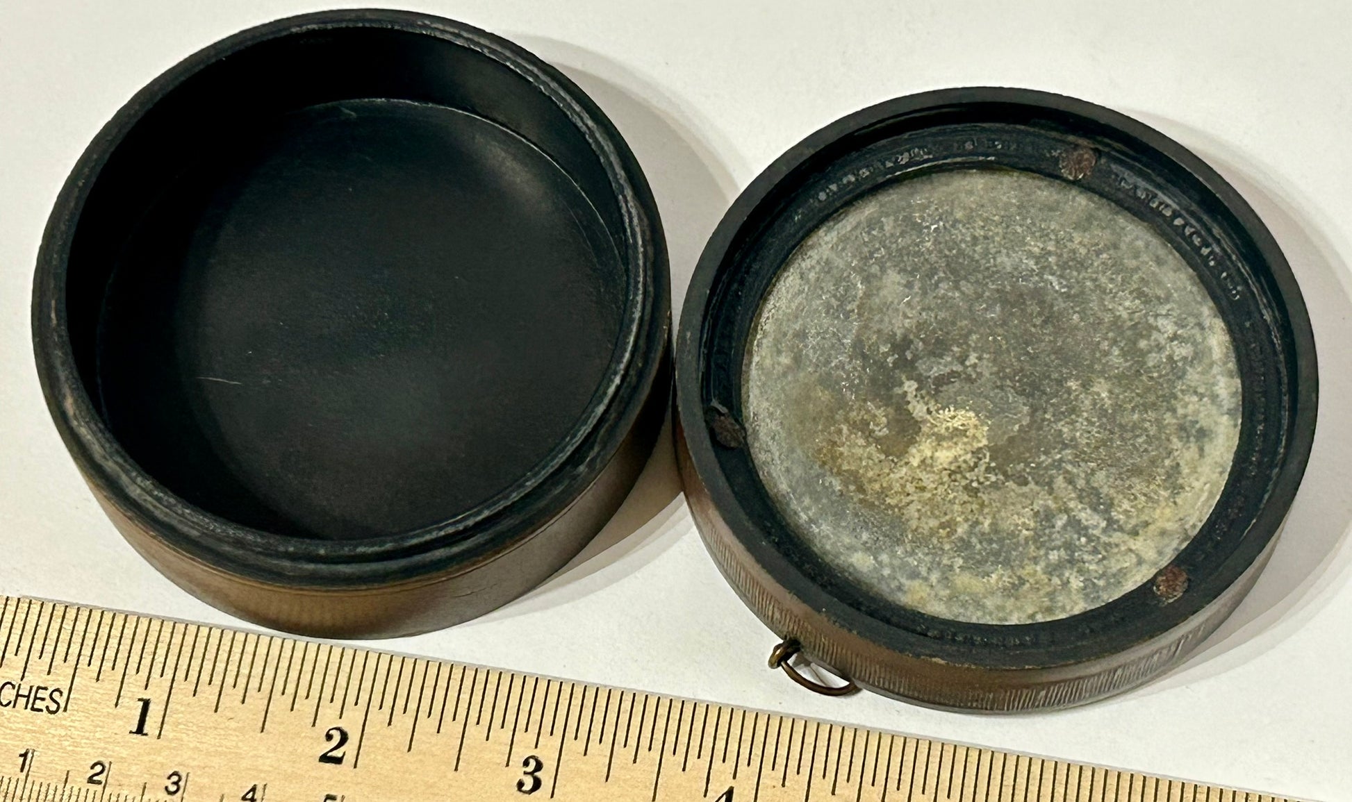 CIVIL WAR NAVY EMBLEM "DON'T GIVE UP THE SHIP" WITH ANCHOR LID AND PATENTED 1851, HAS RING TO HANG AND ORIGINALLY HAD MIRROR IN LID, A RARE ITEM MADE OF GUTTA PERCHA 3 1/4" DIA. CALL OR TEXT FOR MORE INFORMATION