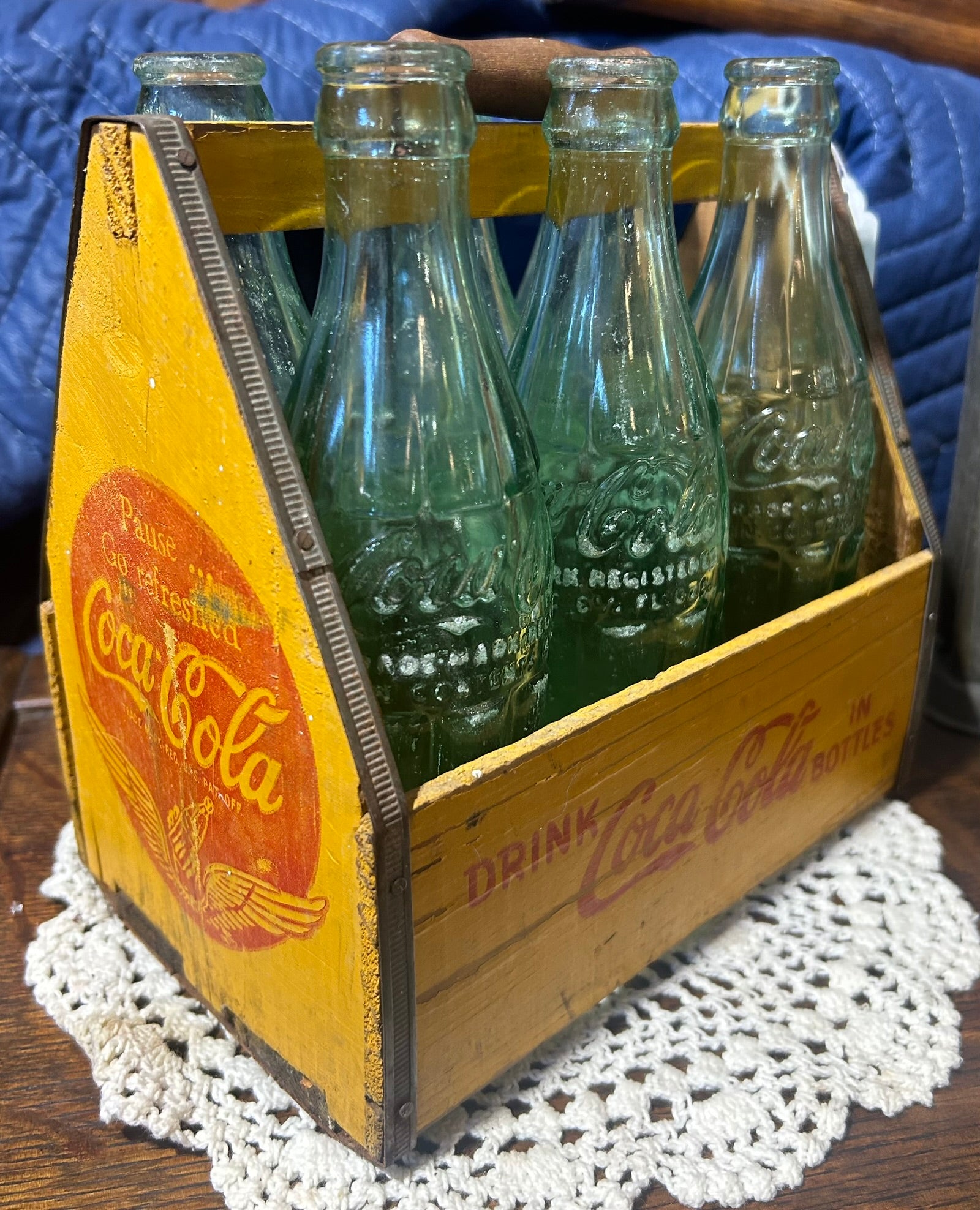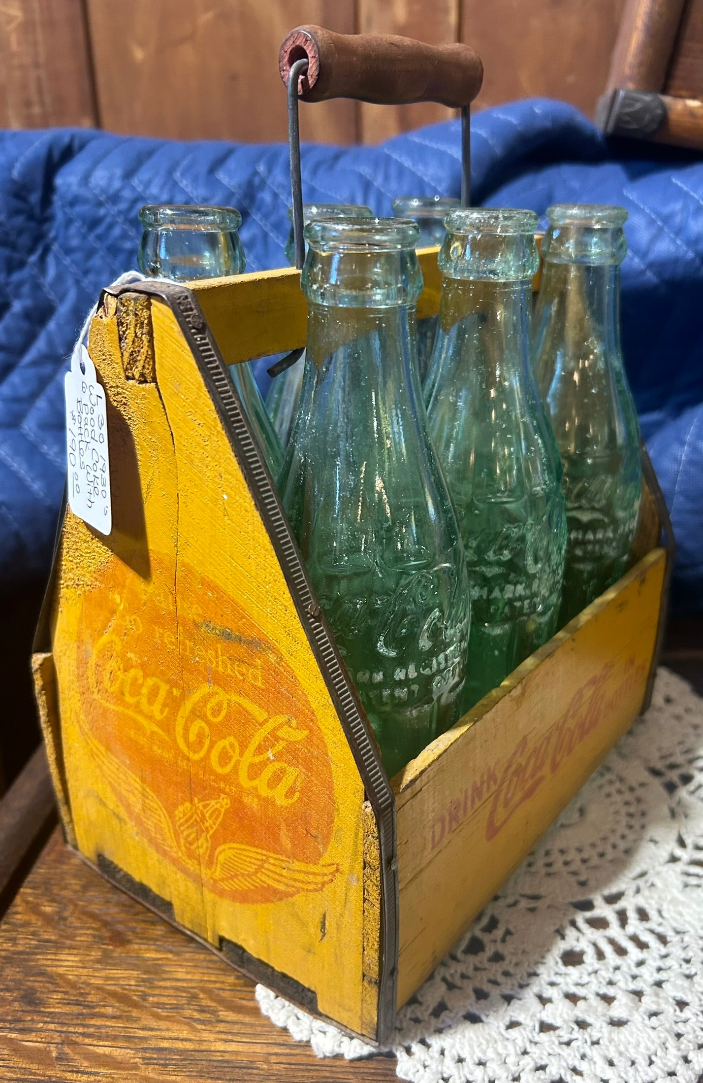 ANTIQUE COCA COLA WOODEN SIX PACK CARRIER WITH BOTTLES. CALL OR TEXT FOR MORE INFORMATION