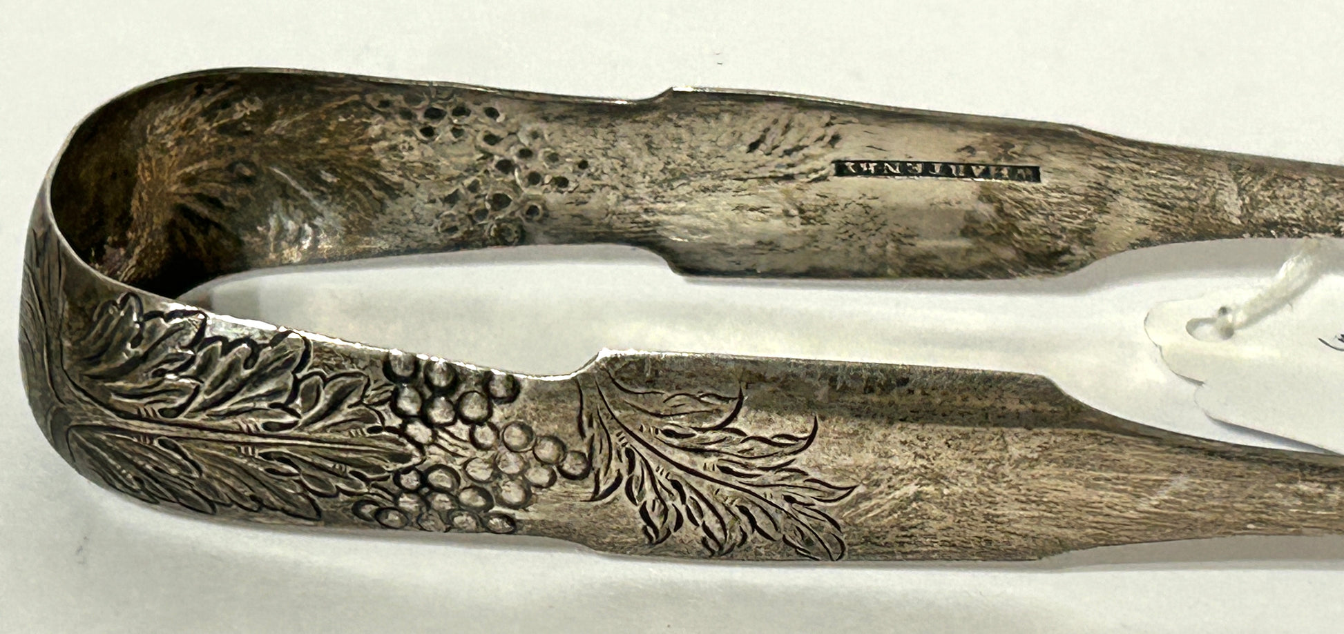 CIRCA 1830 COIN SILVER SUGAR TONGS BY WHARTENBY OF PHILADELPHIA 7" LONG AND 50.0 GRAMS WEIGHT, SHIPPING IS EXTRA SO CALL OR TEXT TO FIND OUT HOW MUCH SHIPPING WILL COST