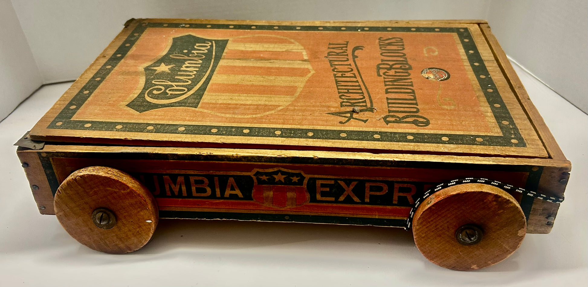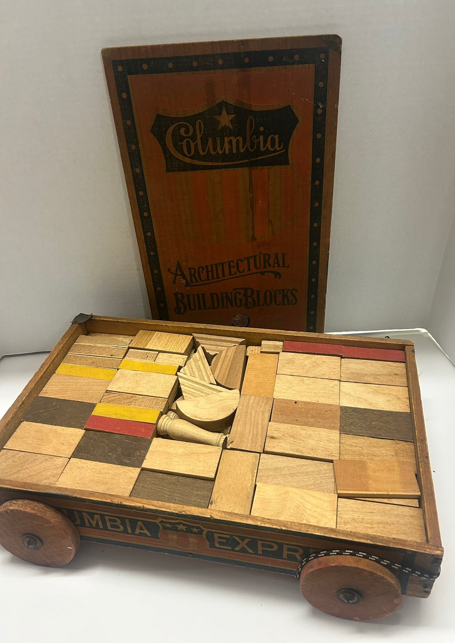 CONVERSE COLUMBIA ARCHITECTURAL BUILDING BLOCKS IN ORIGINAL PATRIOTIC WOOD WAGON 16" X 11" WIDE X 4" TALL. CALL OR TEXT FOR MORE INFORMATION