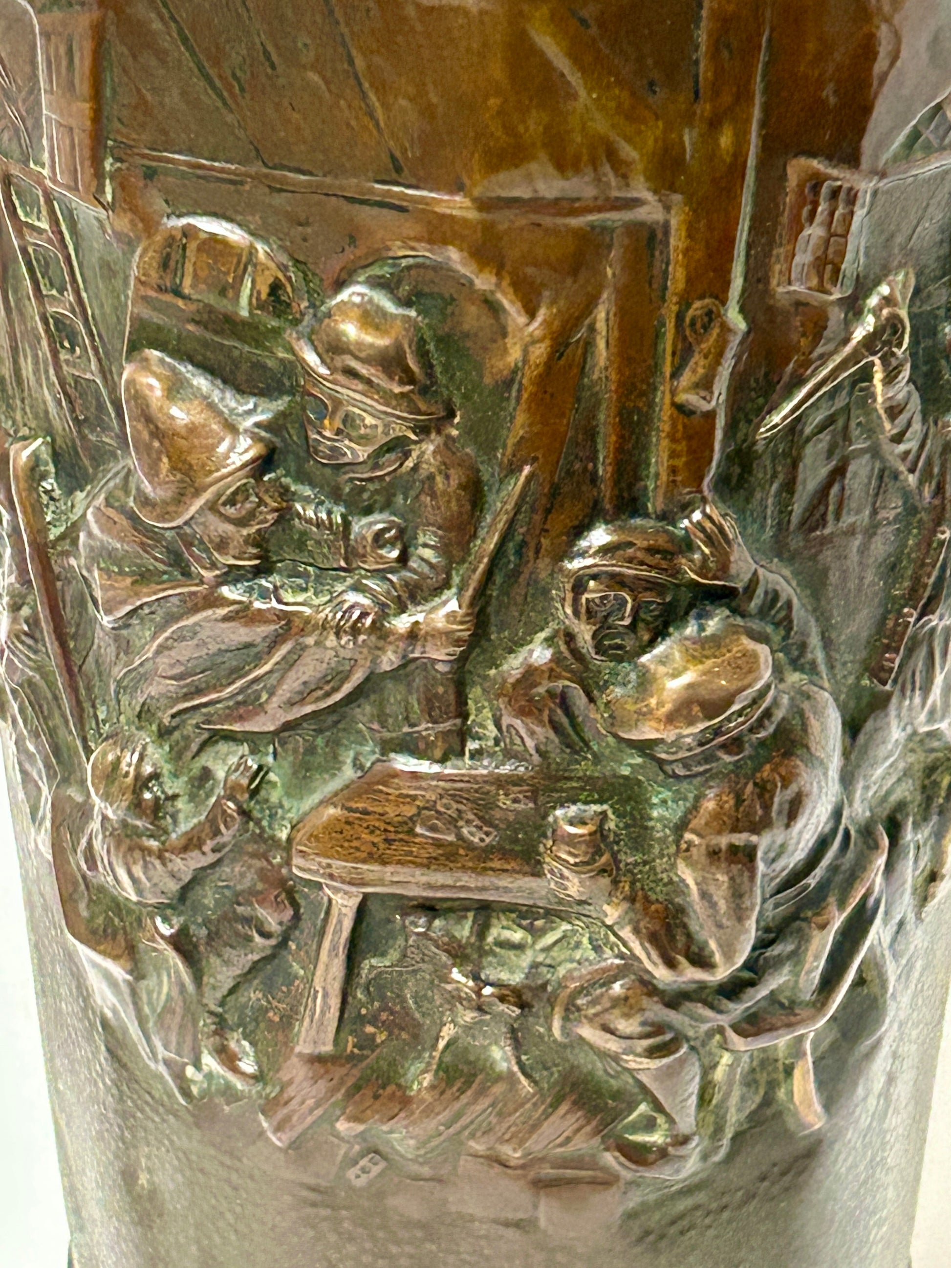 ANTIQUE COPPER EMBOSSED FIGURES ON UMBRELLA STAND 29 1/2" TALL X 12" WIDE X 6 1/2" DEEP. SHIPPING COSTS ARE EXTRA SO CALL OR TEXT US TO FIND OUT WHAT WE WILL HAVE TO PAY TO SHIP TO YOUR ADDRESS.