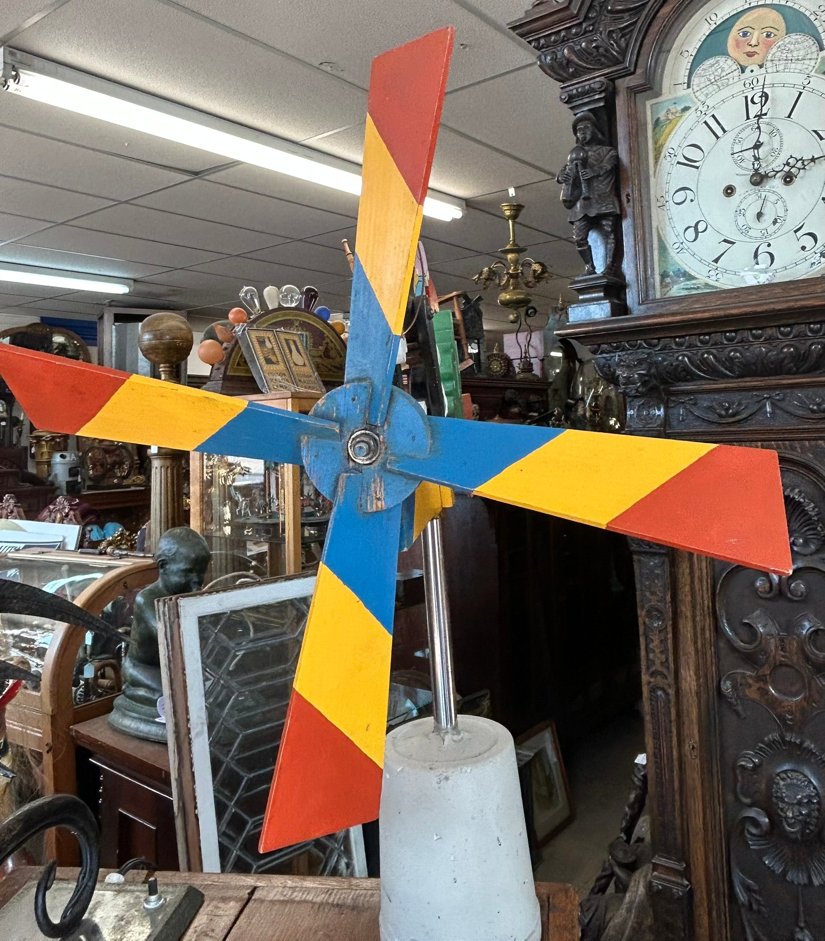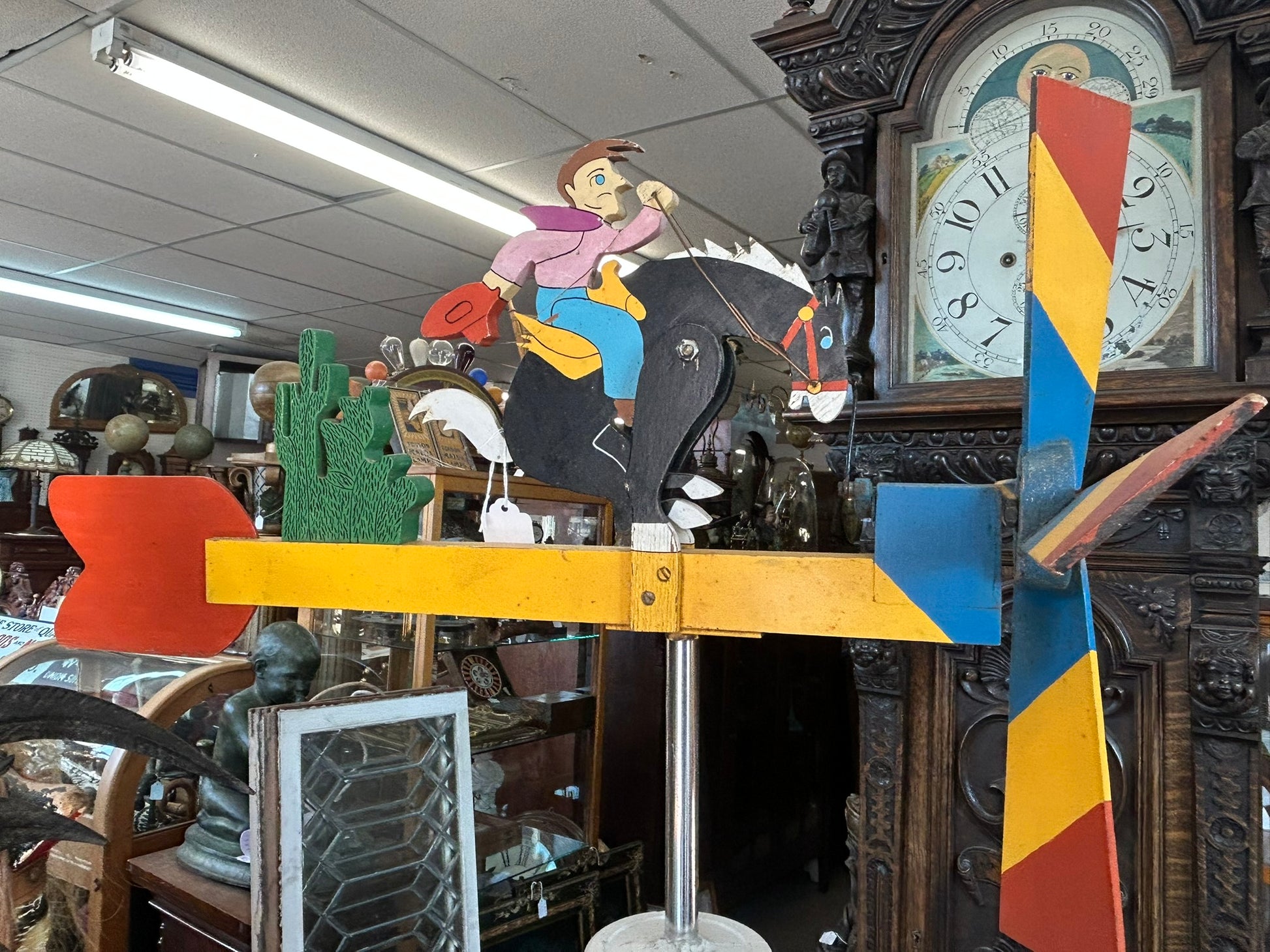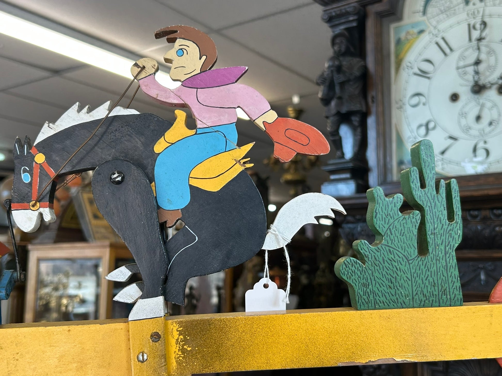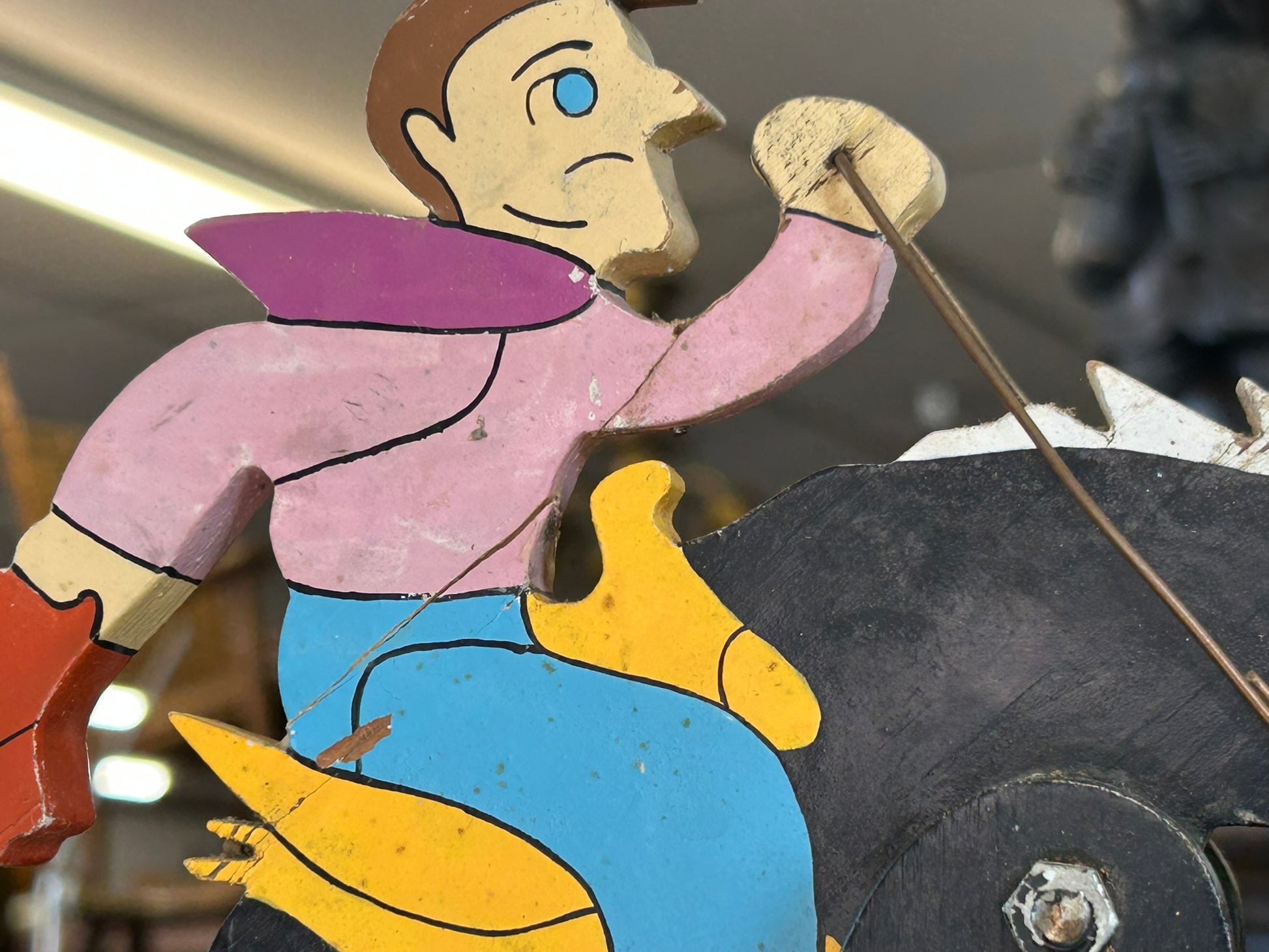 HANDMADE COWBOY WHIRLIGIG 22" LONG X 20" HIGH INCLUDING BASE AND THERE IS A SMALL REPAIRED CRACK. CALL OR TEXT FOR MORE INFORMATION