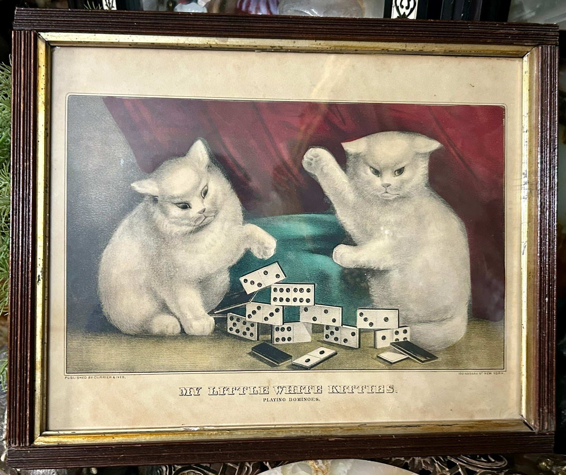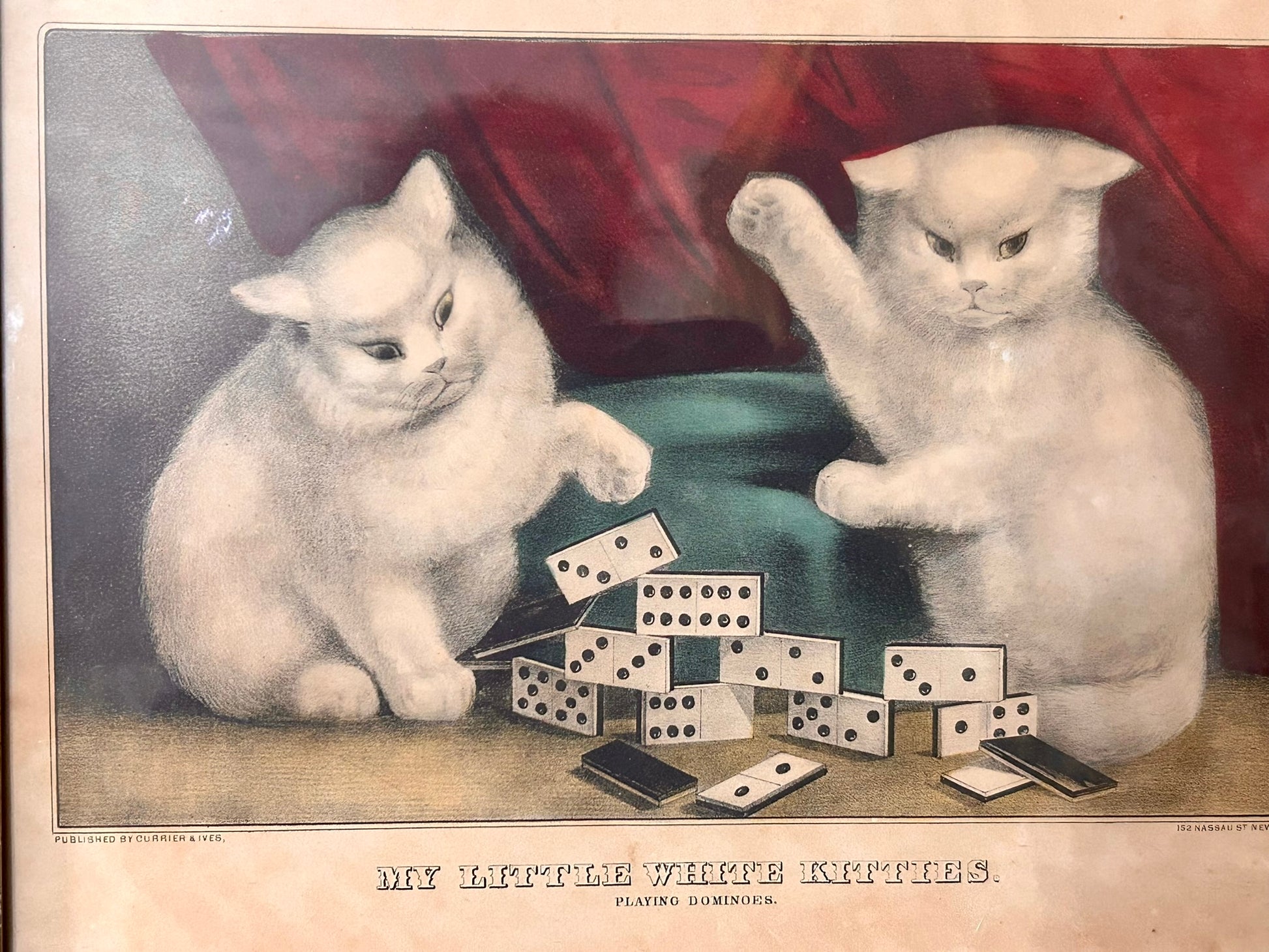 CURRIER AND IVES PRINT "MY LITTLE WHITE KITTENS PLAYING DOMINOES" 23" X 15 1/2". CALL OR TEXT FOR MORE INFORMATION