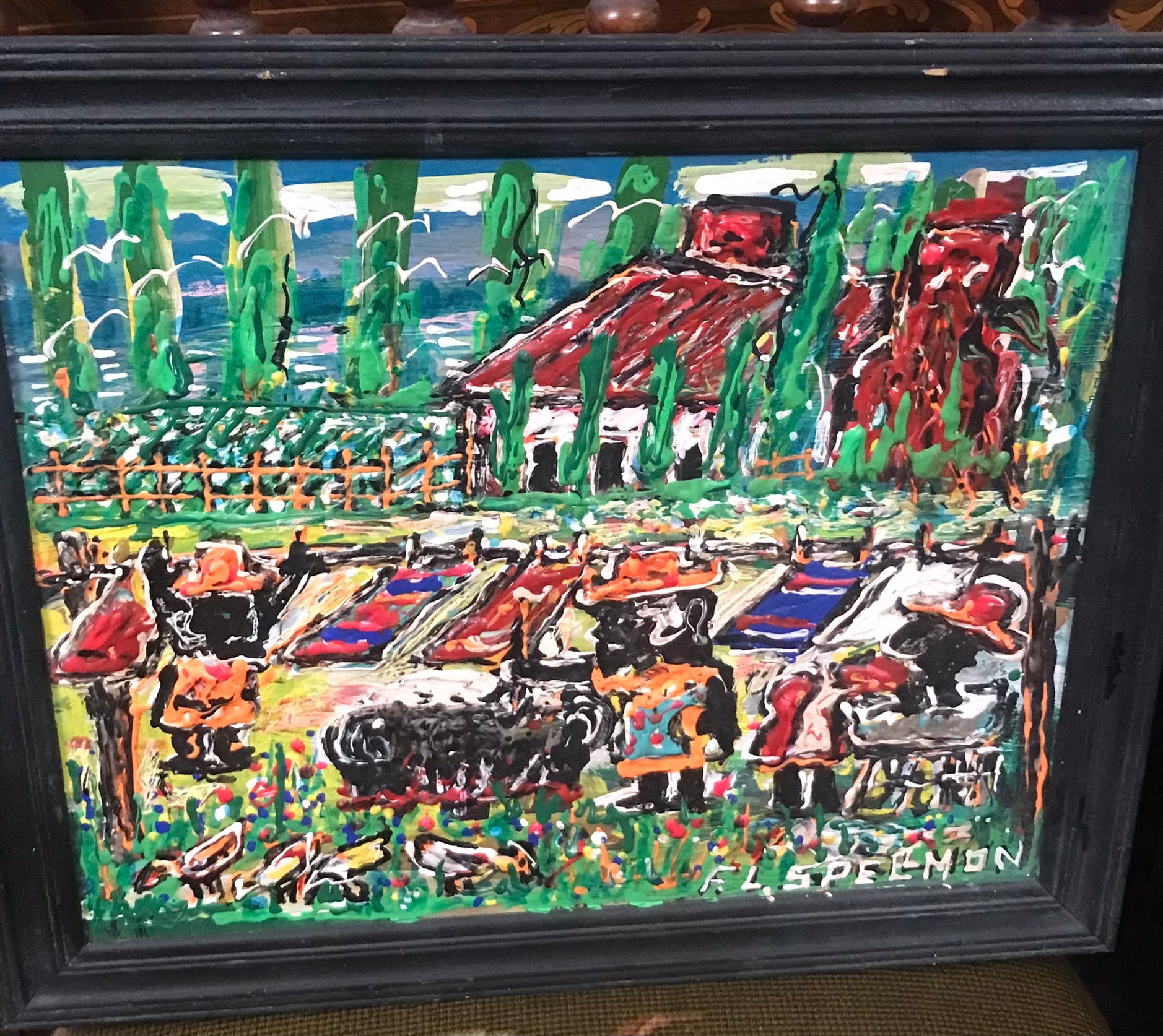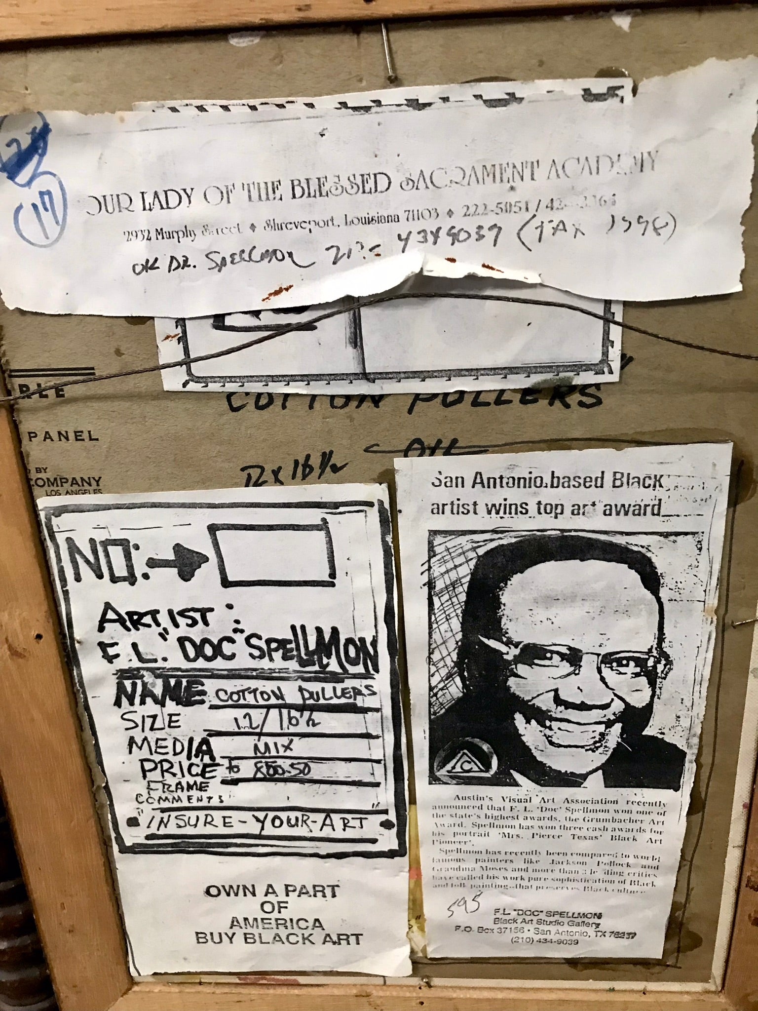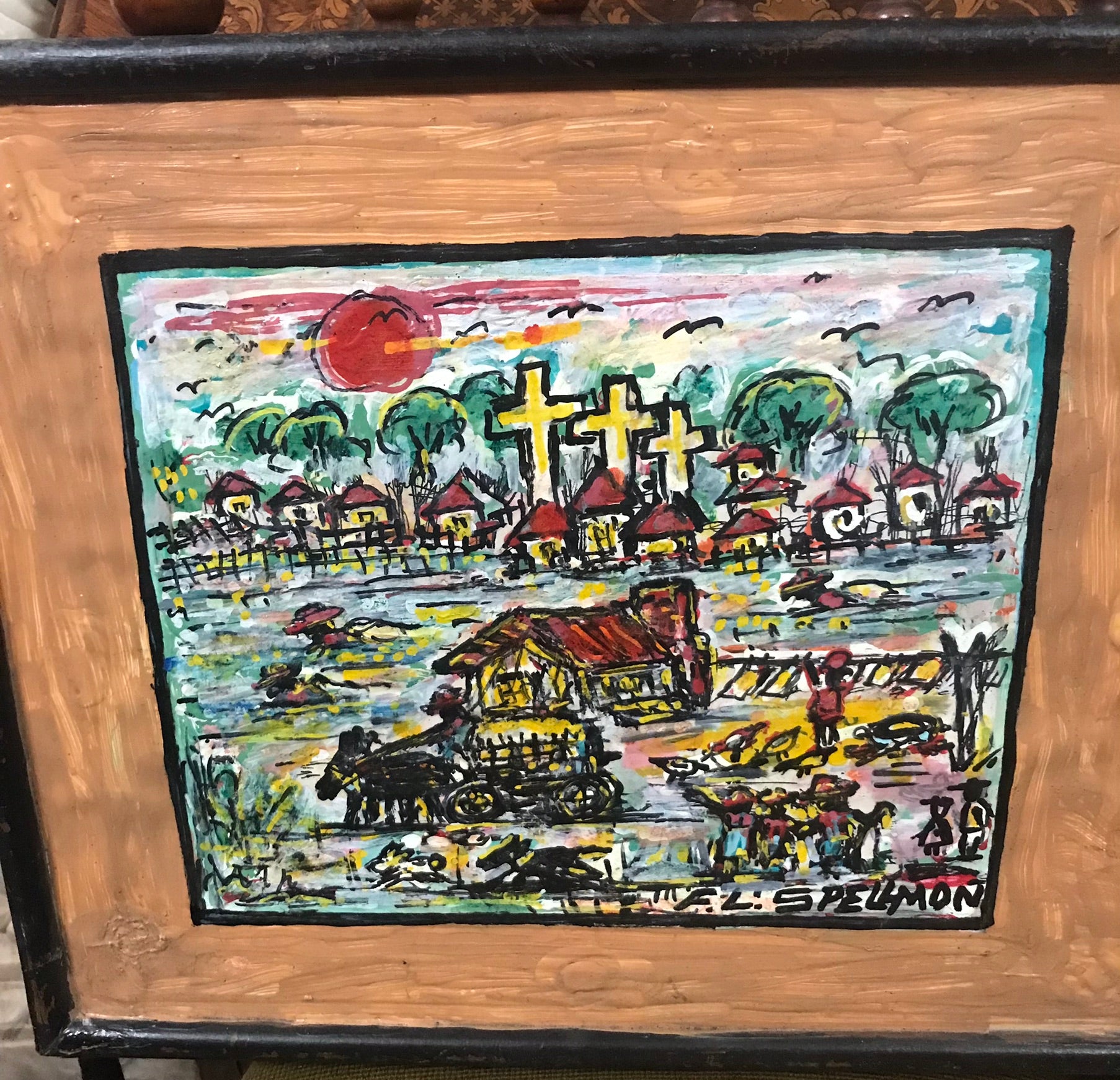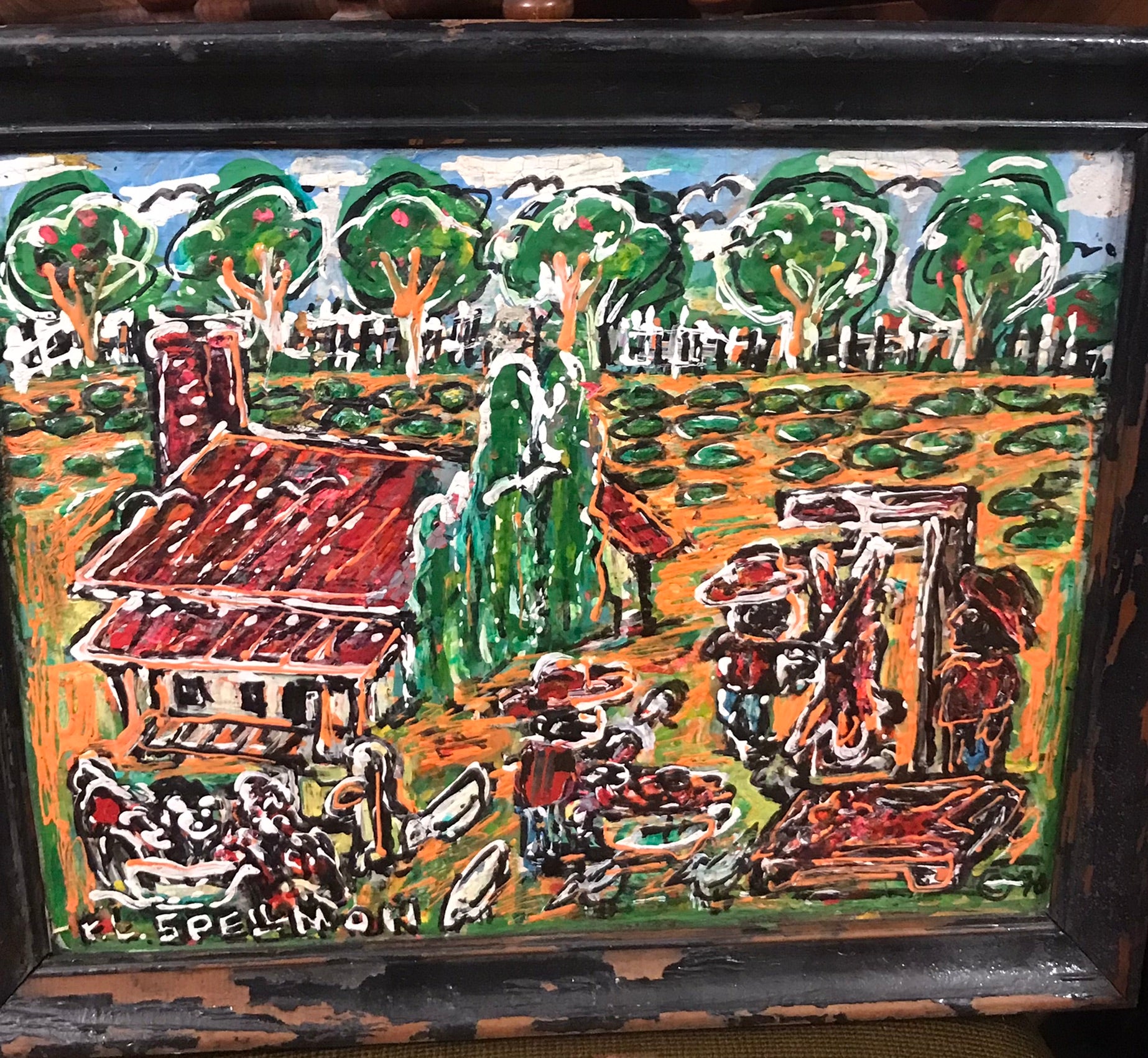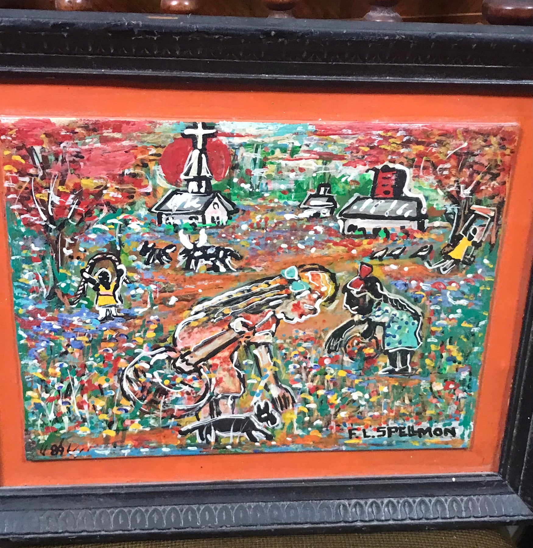 LARGE COLLECTION OF FAMOUS OUTSIDER ARTIST DOC SPELLMON PAINTINGS. SPELLMON WAS A BLACK TEXAS ARTIST KNOWN FOR HIS PAINTINGS OF THE OLD SOUTH. HE WAS BORN IN 1925 AND DIED IN 2008. THERE ARE OVER FIFTY PAINTINGS OF VARIOUS SIZES AND TECHNIQUES AND MOST HAVE HIS UNIQUE DISCRIPTIONS AND LABELS ON THEIR BACKS. SOLD INDIVIDUALLY OR IN GROUPS. PLEASE CALL 402 239 2799 OR TEXT OR E-MAIL dustyattic@charter.net FOR ADDITIONAL INFORMATION