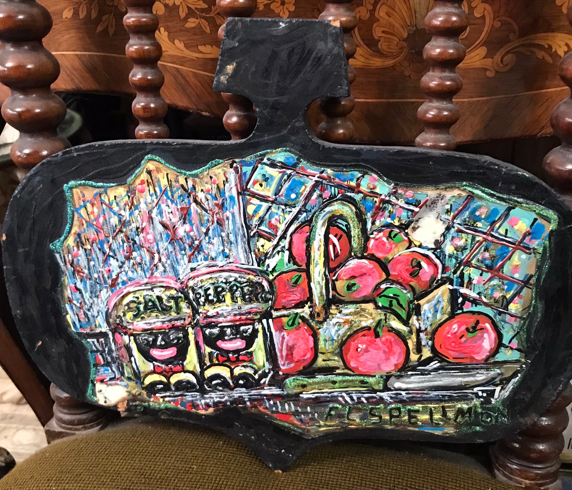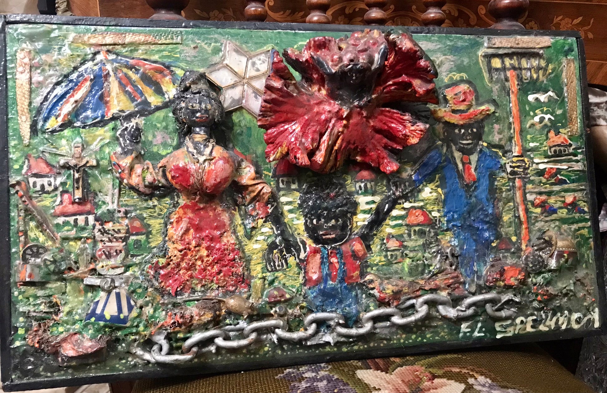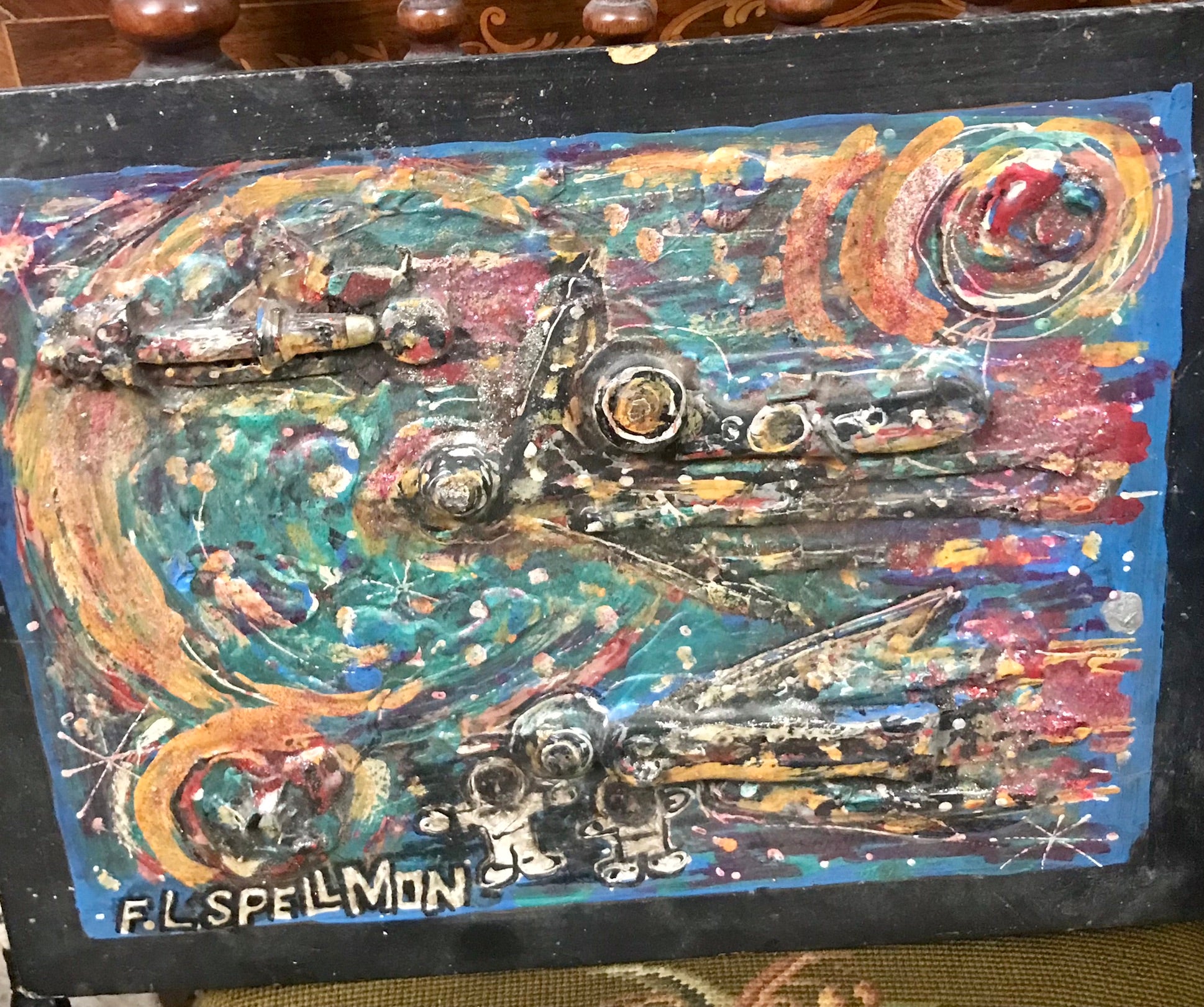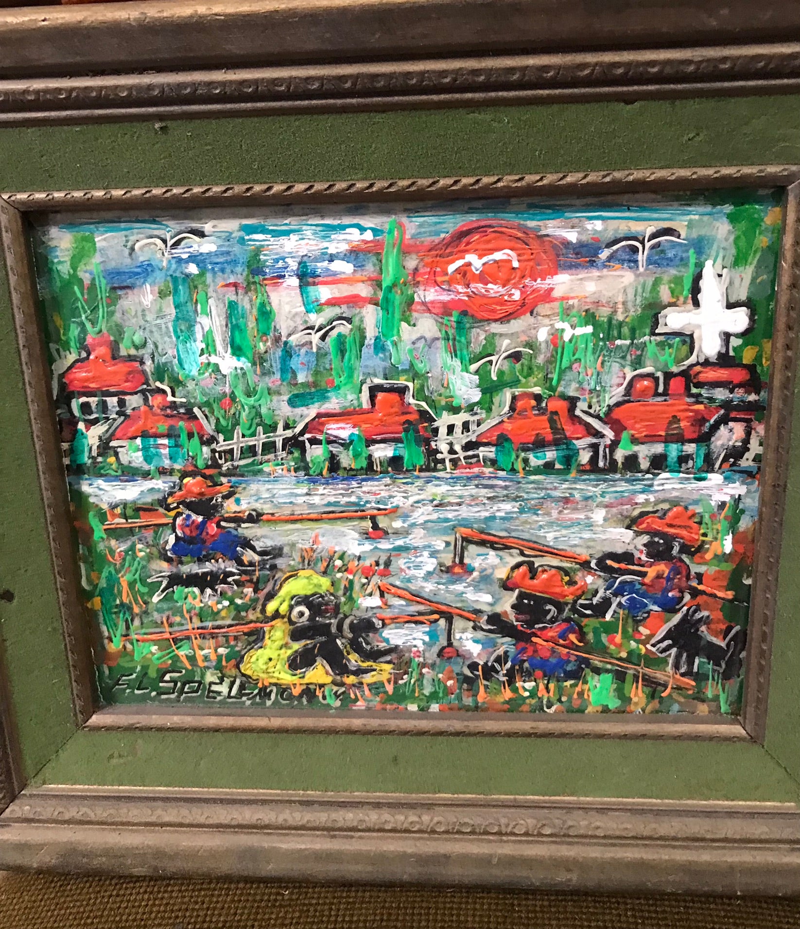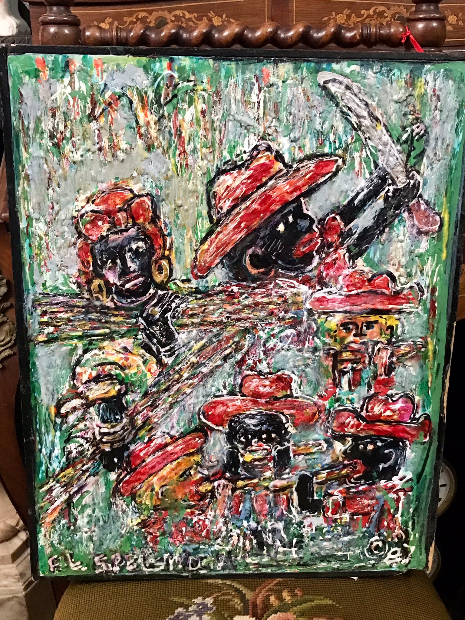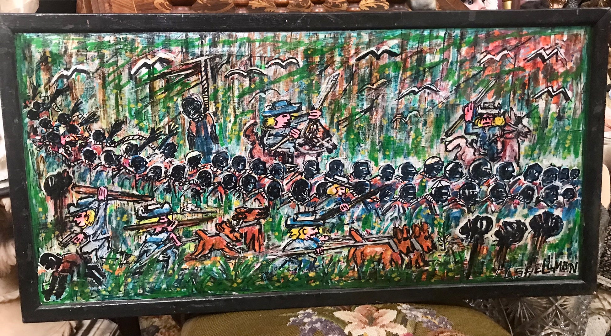 LARGE COLLECTION OF FAMOUS OUTSIDER ARTIST DOC SPELLMON PAINTINGS. SPELLMON WAS A BLACK TEXAS ARTIST KNOWN FOR HIS PAINTINGS OF THE OLD SOUTH. HE WAS BORN IN 1925 AND DIED IN 2008. THERE ARE OVER FIFTY PAINTINGS OF VARIOUS SIZES AND TECHNIQUES AND MOST HAVE HIS UNIQUE DISCRIPTIONS AND LABELS ON THEIR BACKS. SOLD INDIVIDUALLY OR IN GROUPS. PLEASE CALL 402 239 2799 OR TEXT OR E-MAIL dustyattic@charter.net FOR ADDITIONAL INFORMATION