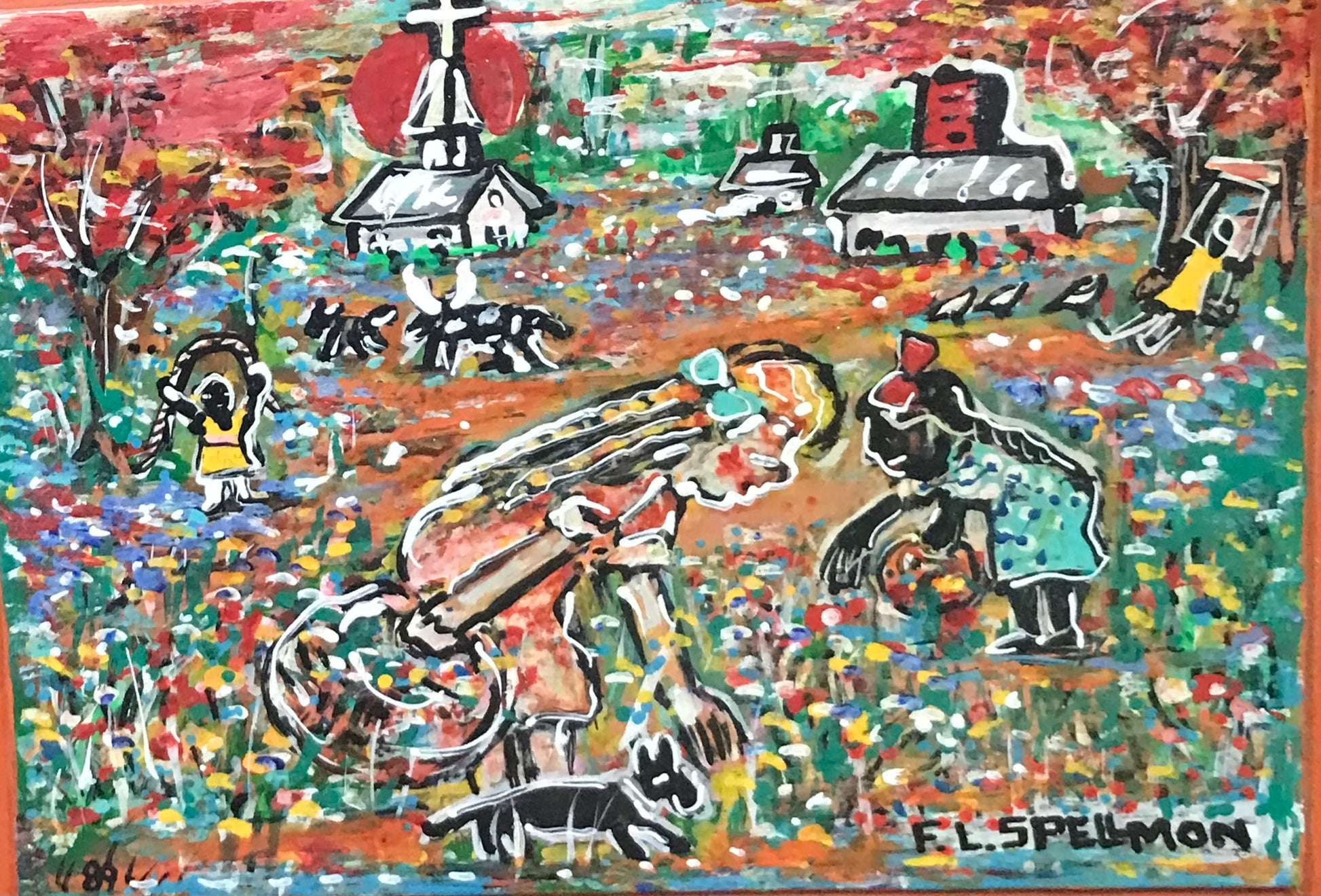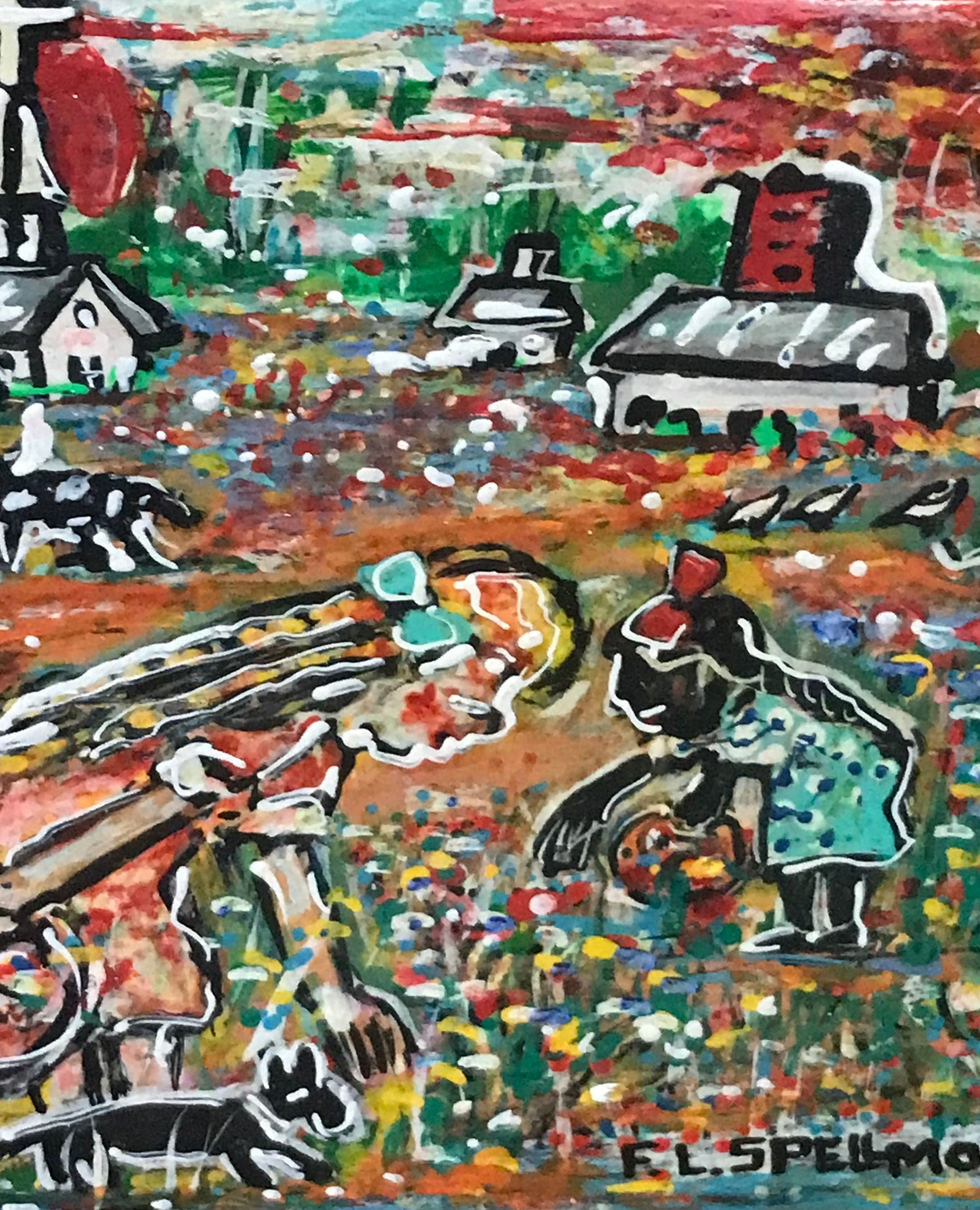 DOC SPELLMON OUTSIDER ARTIST PAINTING "TWO GIRLS PICKING FLOWERS" 13" X 16". SHIPPING IS EXTRA SO CALL OR TEXT FOR COST OF SHIPPING TO YOUR ADDRESS