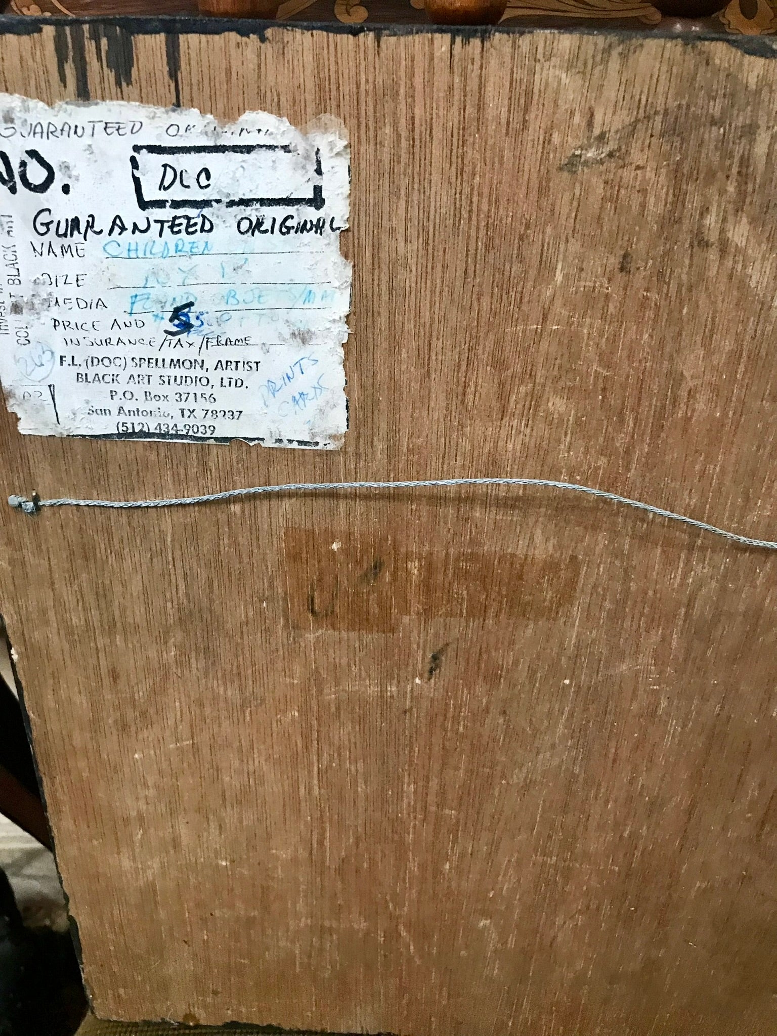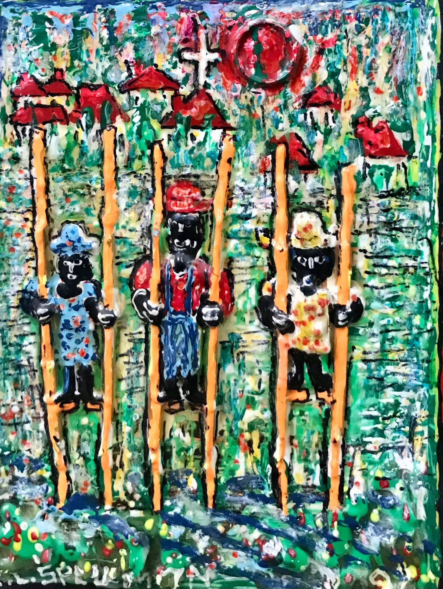 DOC SPELLMON OUTSIDER ARTIST PAINTING FOR SALE "CHILDREN ON STICKS" 16" X 13". SHIPPING IS EXTRA COST SO CALL OR TEXT FOR COST OF SHIPPING TO YOUR ADDRESS