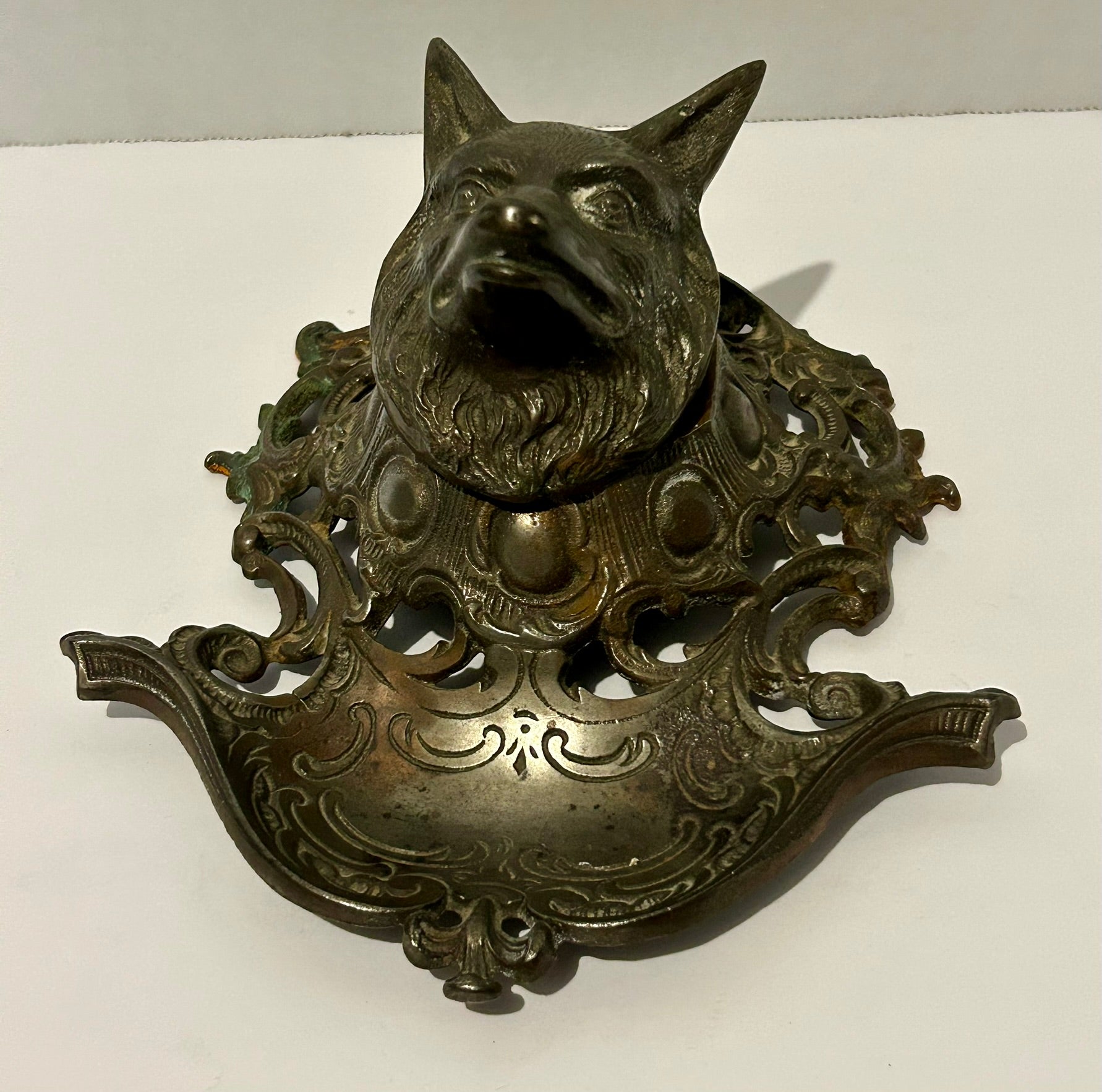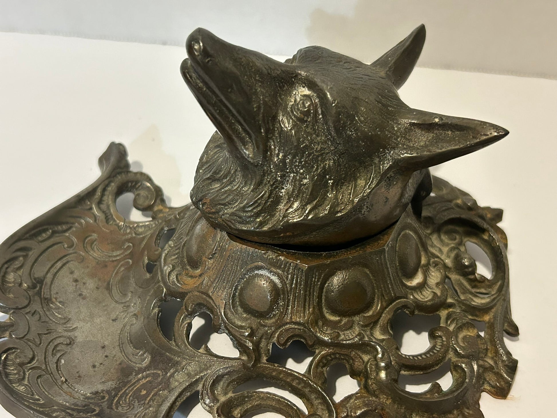 FIGURAL ANTIQUE METAL WOLF INK WELL