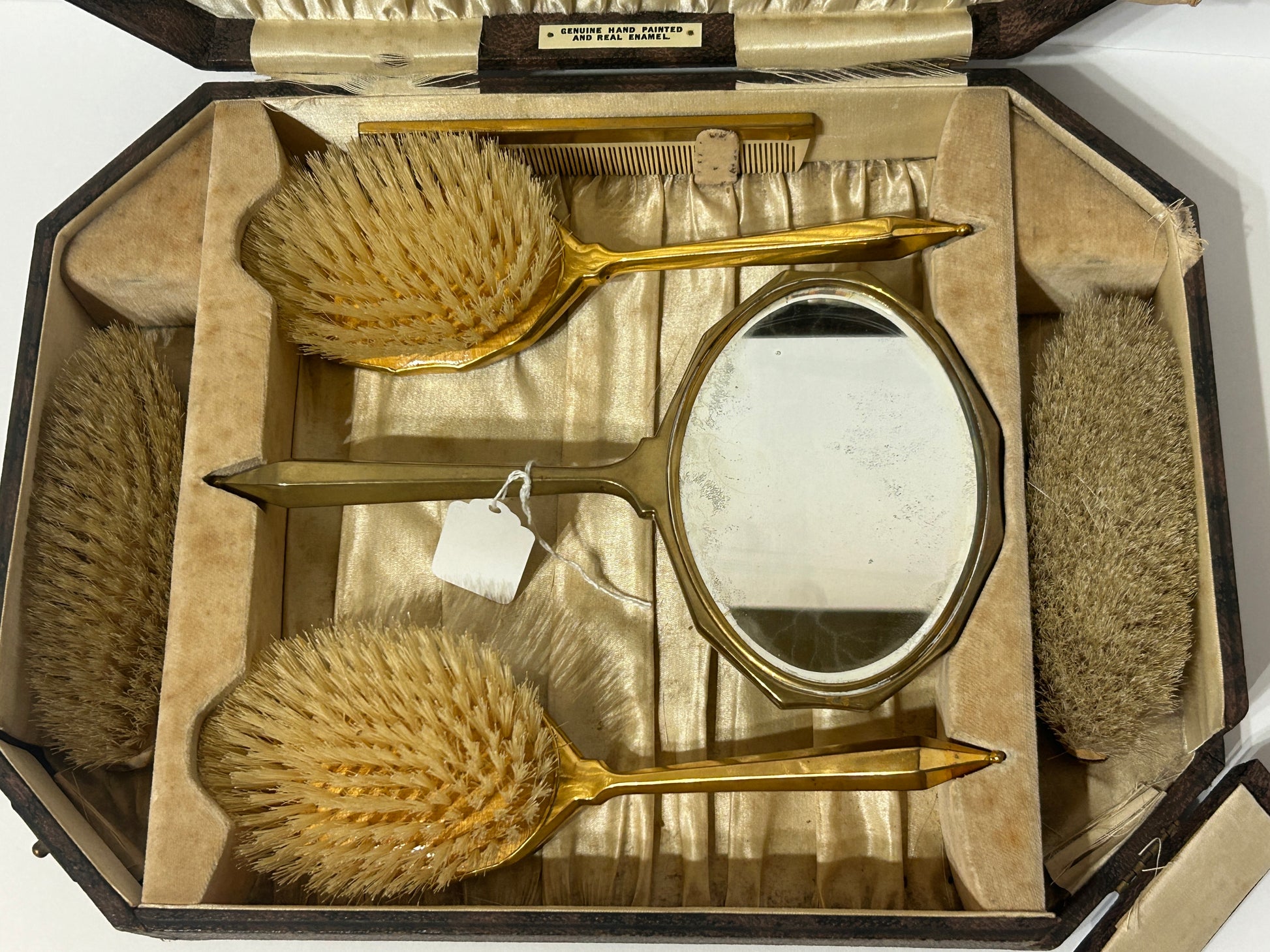 HAND PAINTED SCENIC SCENE ANTIQUE SIX PIECE DRESSER SET WITH BOX - MIRROR IS 9 1/4" LONG X 5 1/2" WIDE. SHIPPING IS NOT INCLUDED IN THE PRICE SO CALL OR TEXT TO FIND OUT SHIPPING COST TO YOUR AREA.